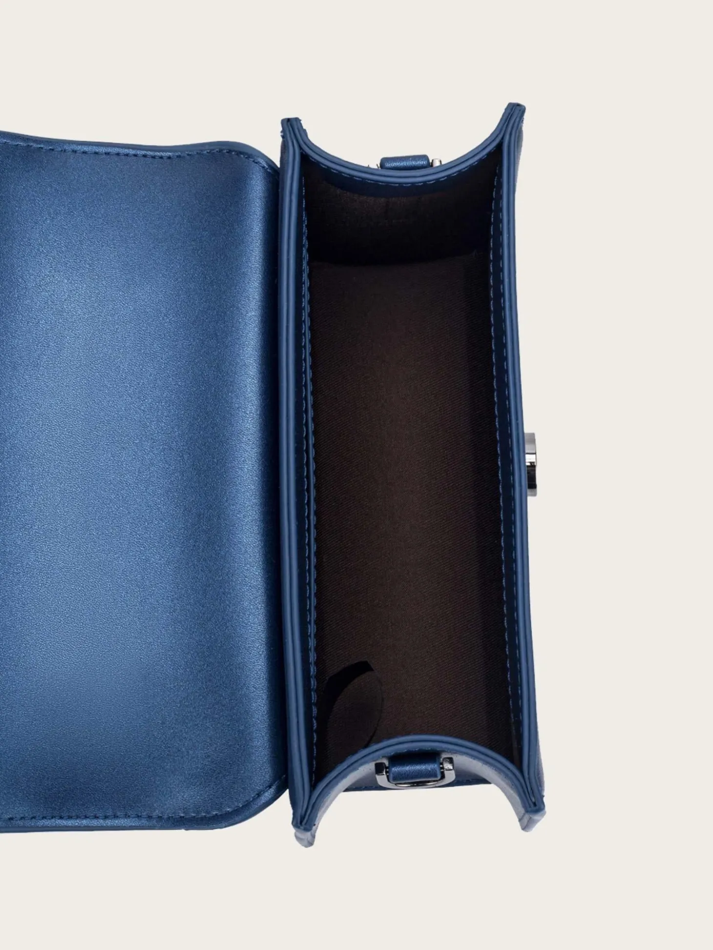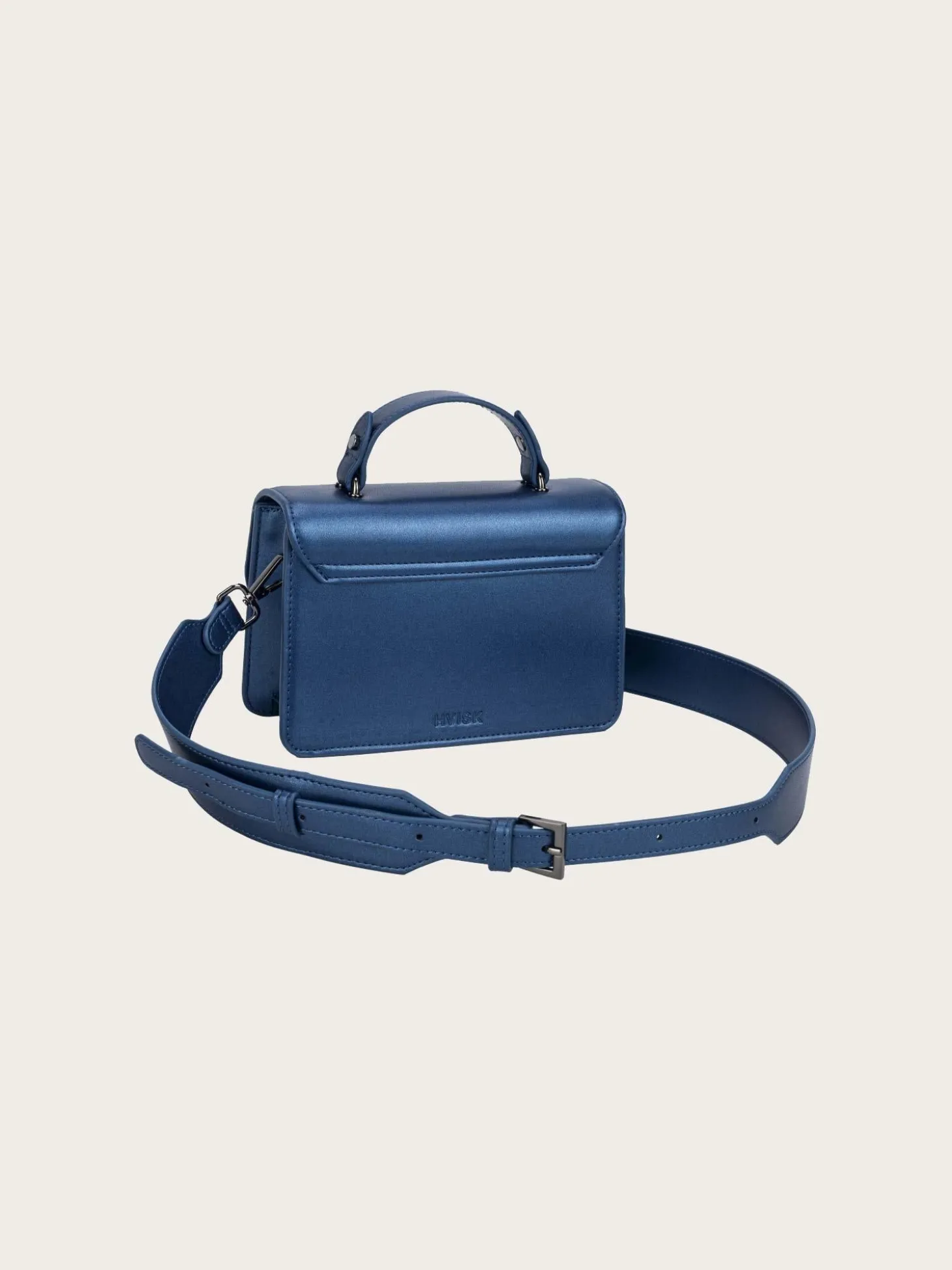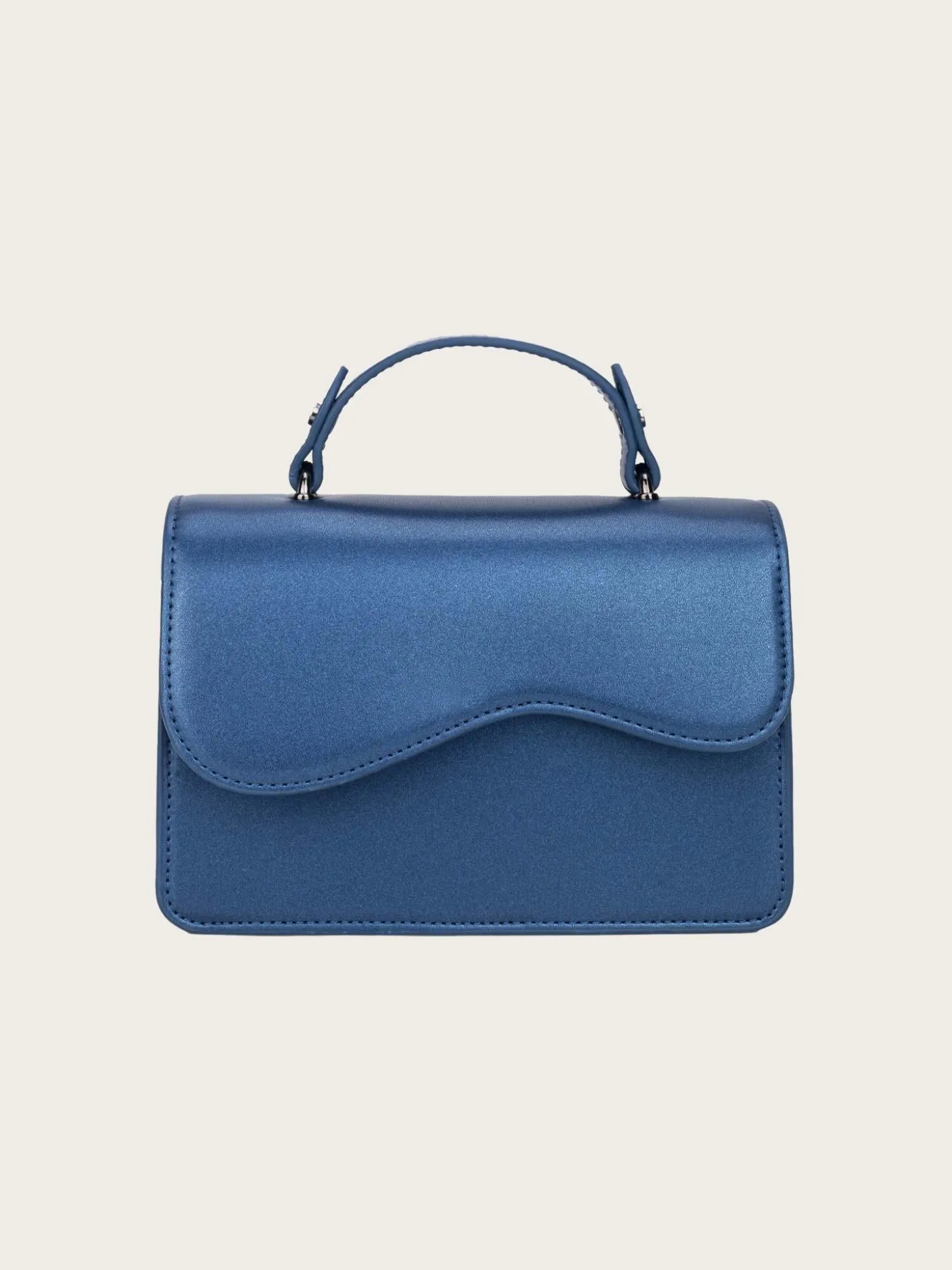 En nydelig veske, med lekre wavy-detaljer i en lys, skinnende blåfarge. Den har en liten hank oppå, samt en lang justerbar reim. Vesken lukkes med magnetlås og har et stort rom inni.