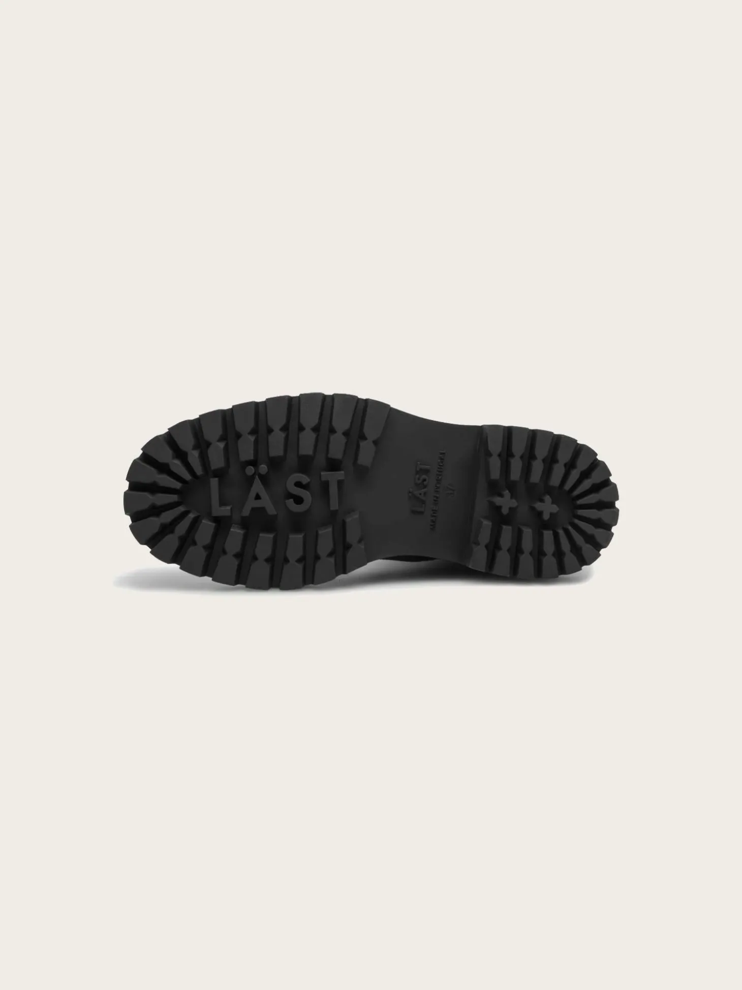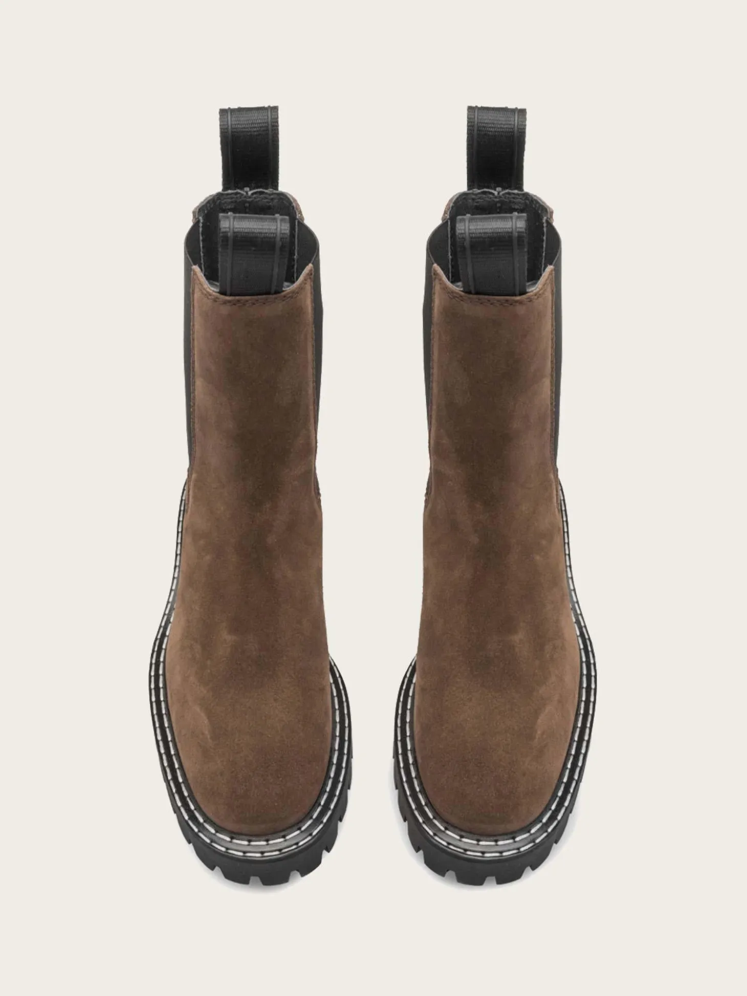 En klassisk chelsea-boot i semsket brunt skinn. Den har elastikk i sidene, hemper ved skaftet og kraftig såle. Bootsen har rund tupp og kontrastfarget stikninger i sålen.
