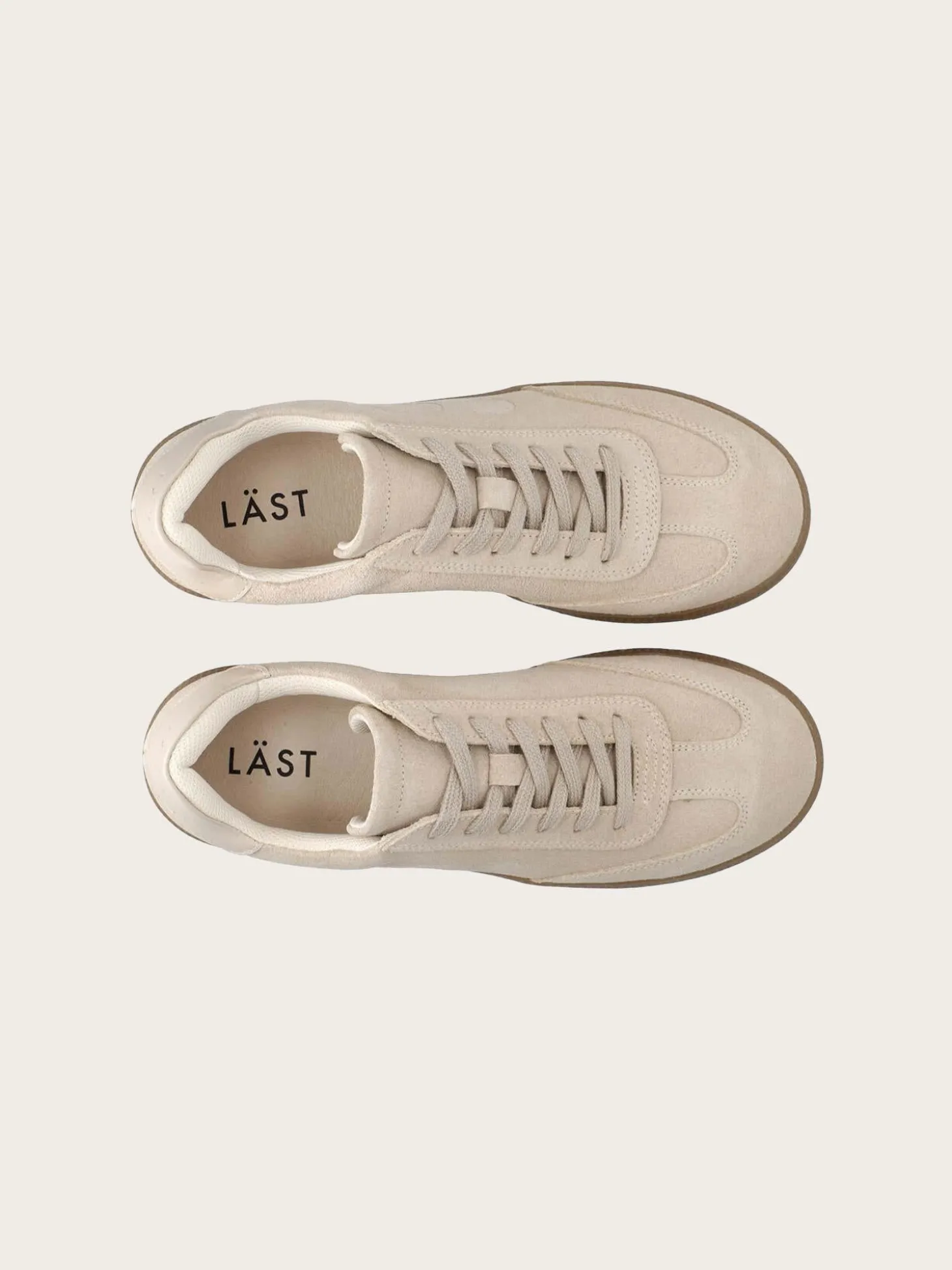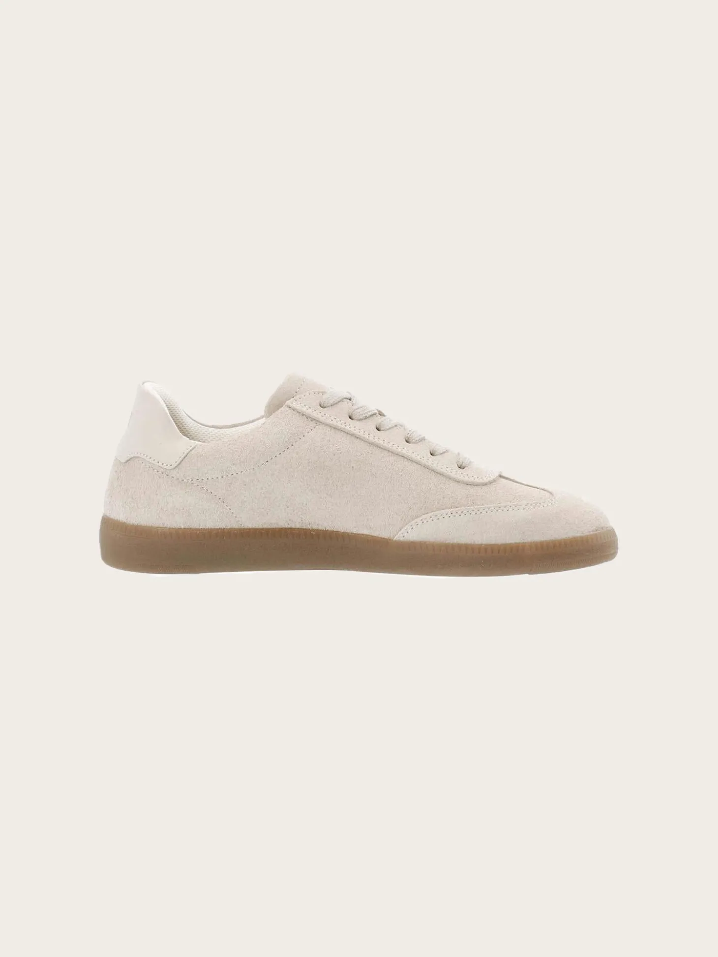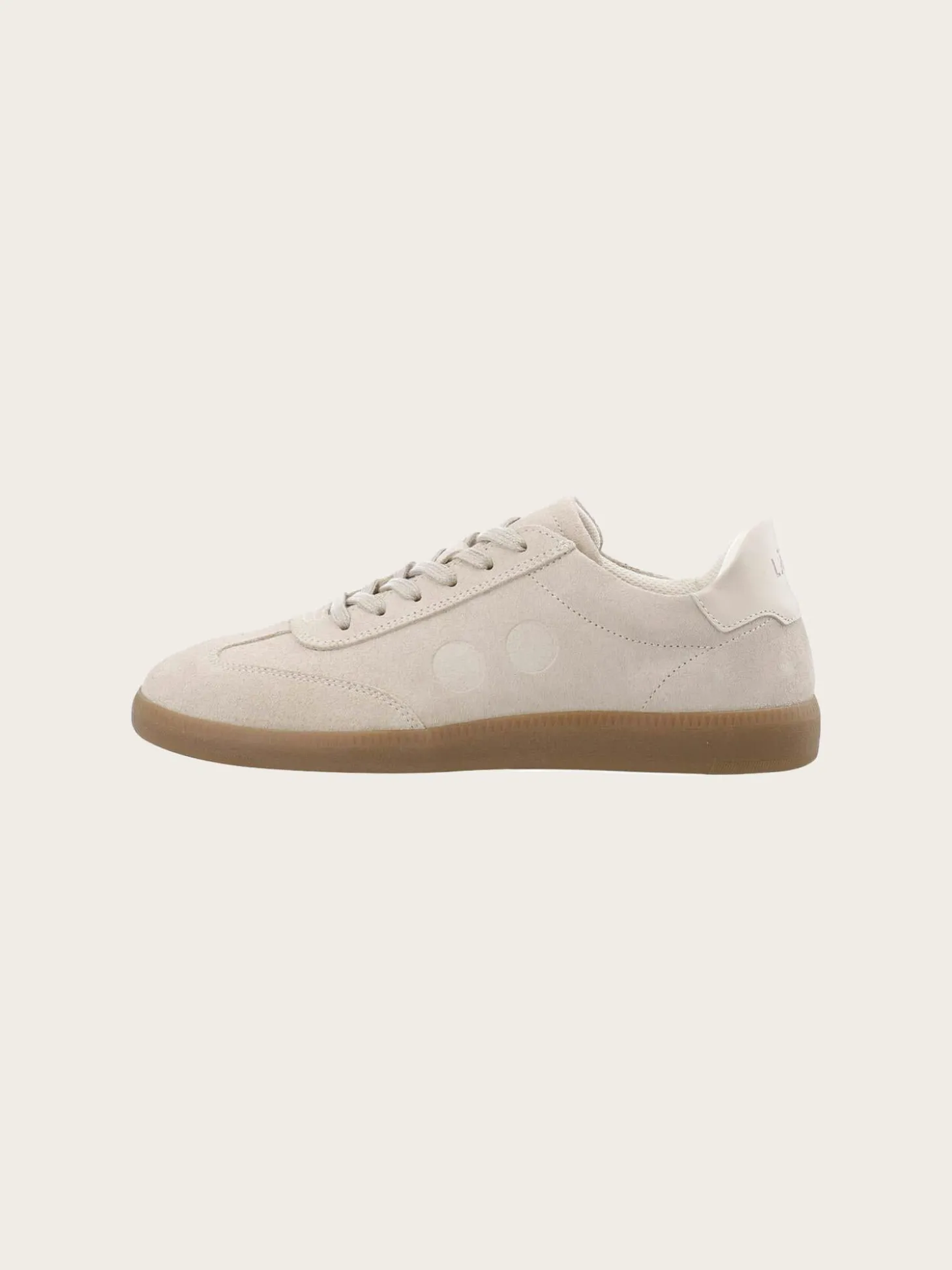 En beige, semsket sneaker, med en enkel og feminin silhuett. Skoene har en delikat monokrom look, og kommer i ekte lær og semsket skinn.