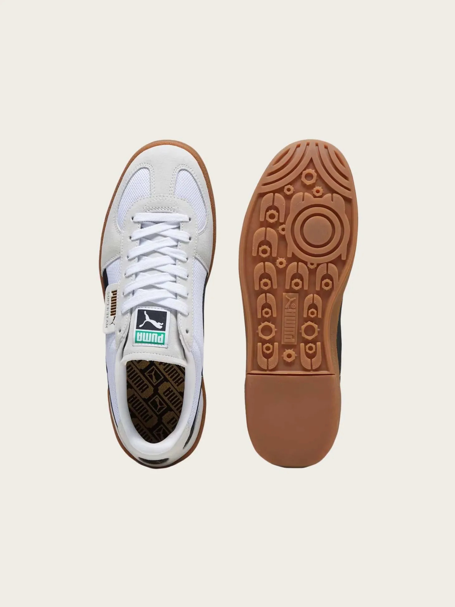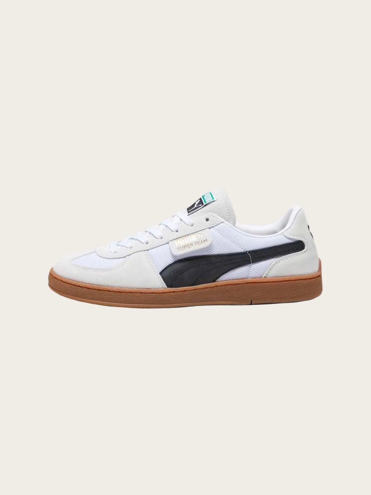 En hvit, retro sneaker med en svart kontraststripe. Modellen er en moderne versjon av en klassiker, og er laget av tekstil, med en brun yttersåle av gummi samt med gullfoliert PUMA-logo.