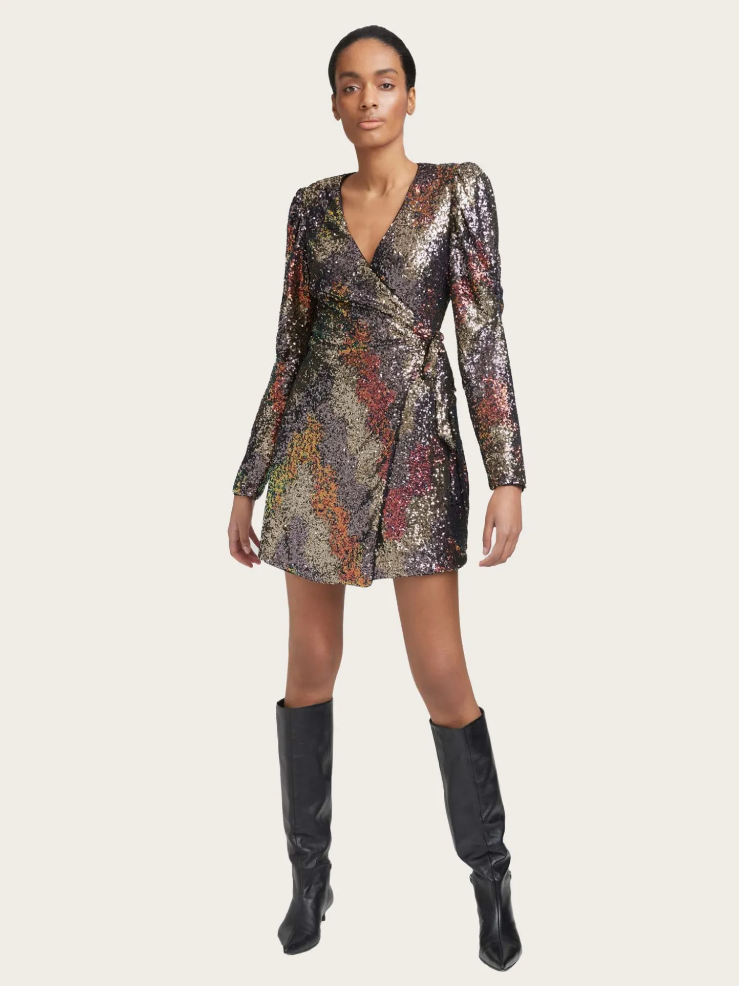 En superkul wrapkjole med fargerike paljetter. Den har overlapp i front med knyting i midjen, lange ermer med liten puff, og en kort lengde.