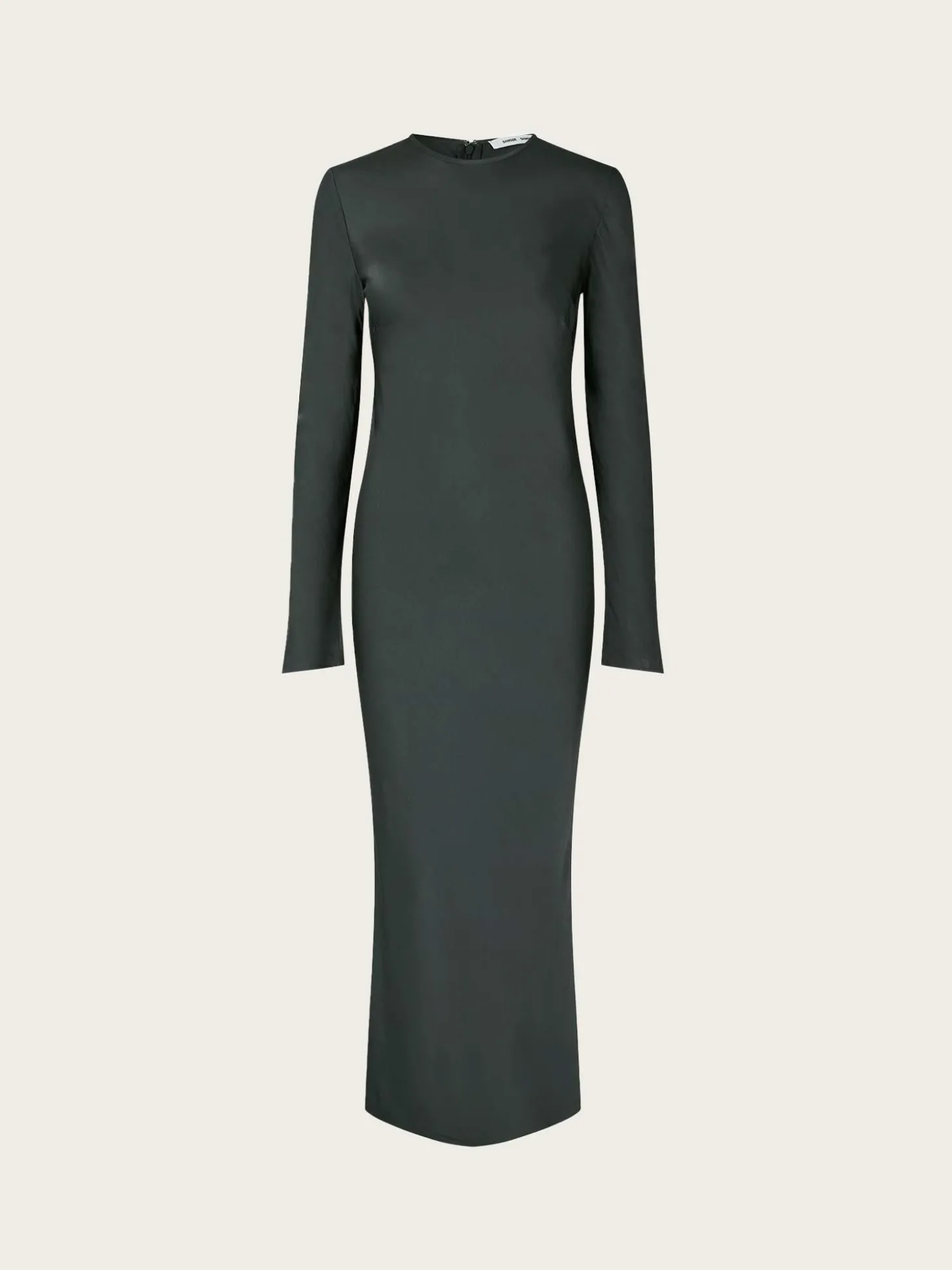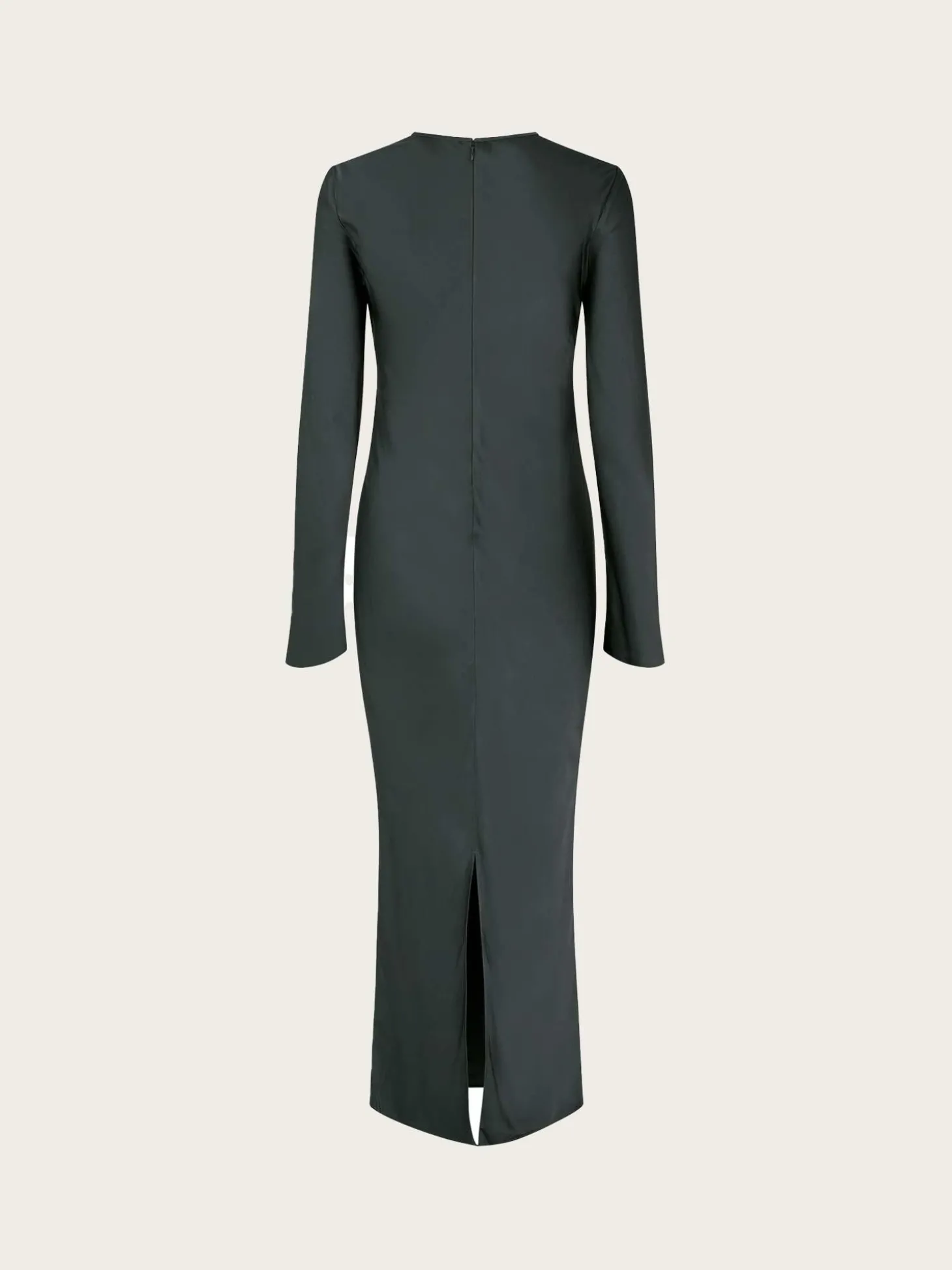 En fin, grå metallisk maxikjole i sateng-kvalitet. Kjolen har rund hals, lange ermer, en smal passform og en split bak for bevegelighet.