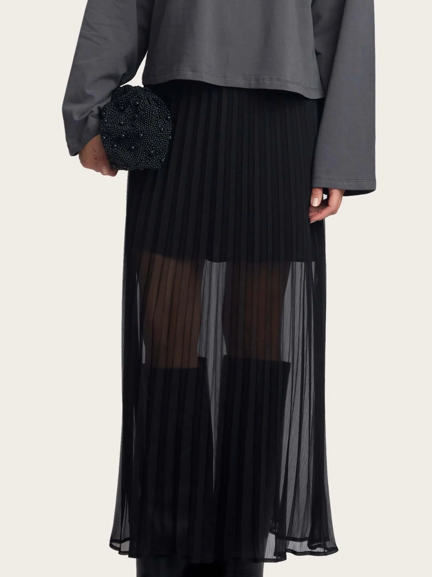Et superfint skjørt i transparent plissé. Det har elastikk i midjen, kort underskjørt og en flowy look. Så fint til en enkel strikkegenser eller oversized blazer.
