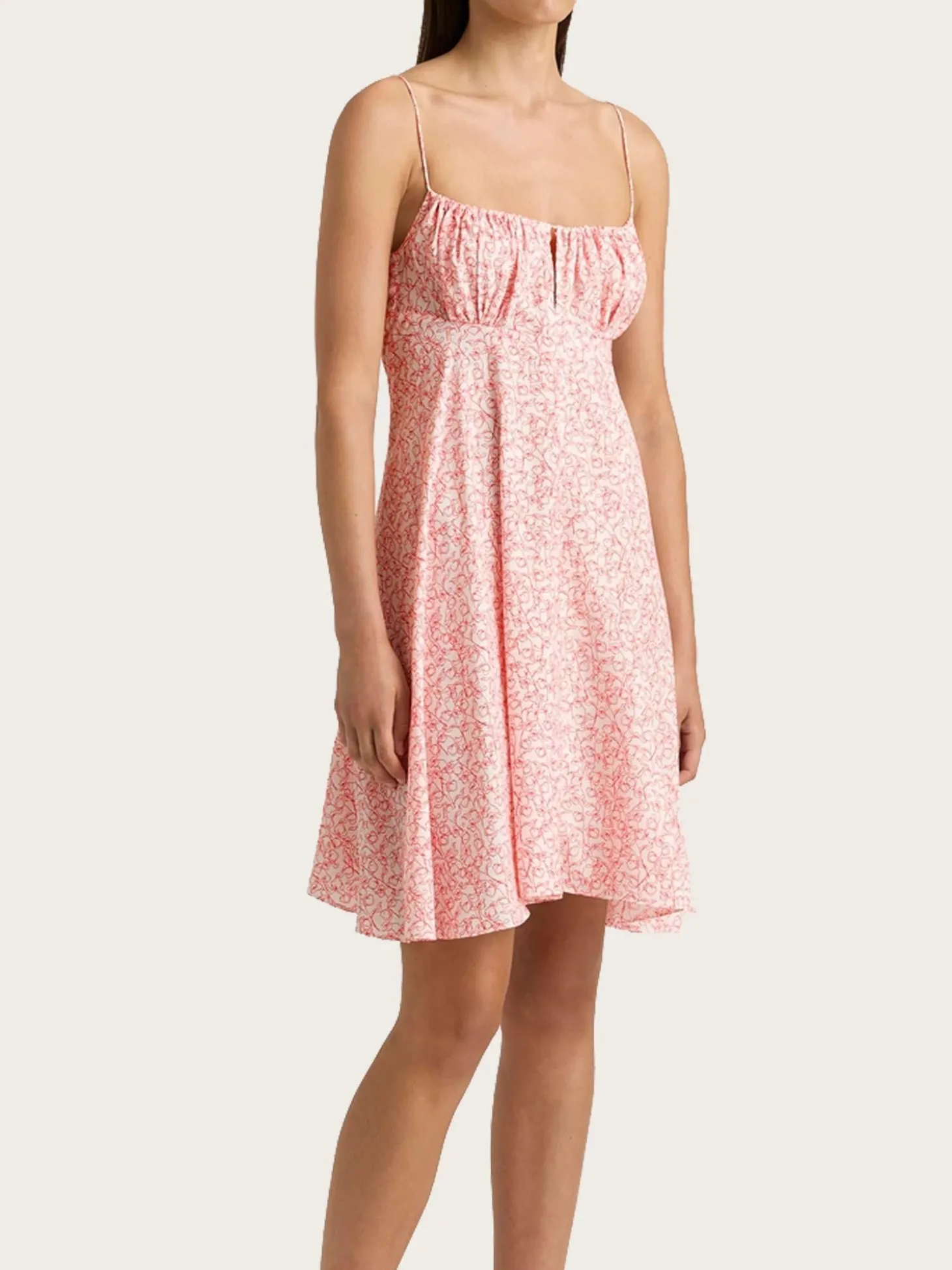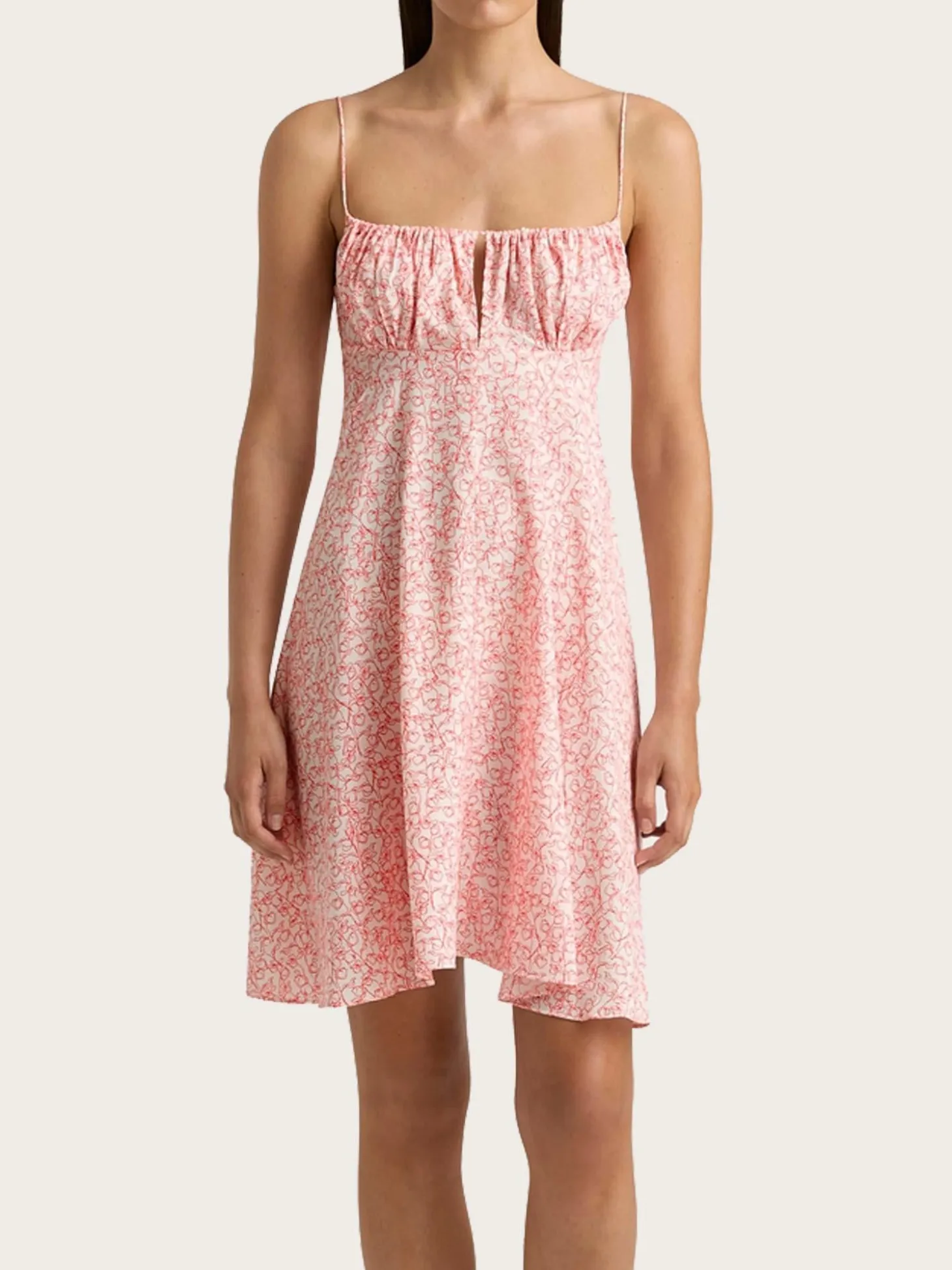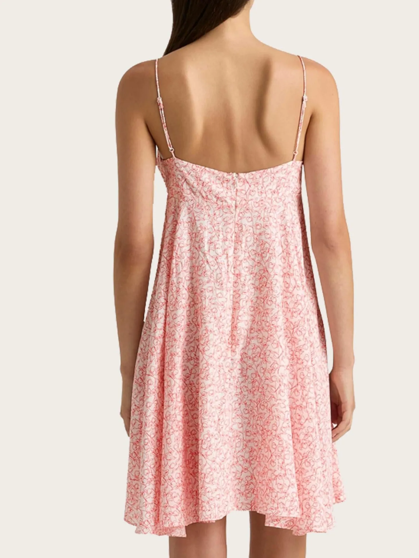 En nydelig og flowy kjole med rødt print. Den har spagettistropper, empire liv og en vidt skjørt.