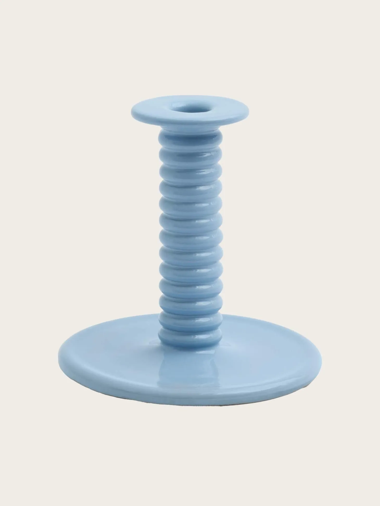 En lyseblå lysestake i terrakotta med glatt overflate og en vridd form.