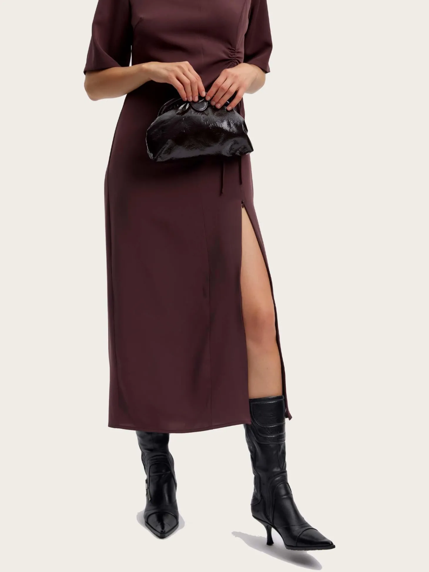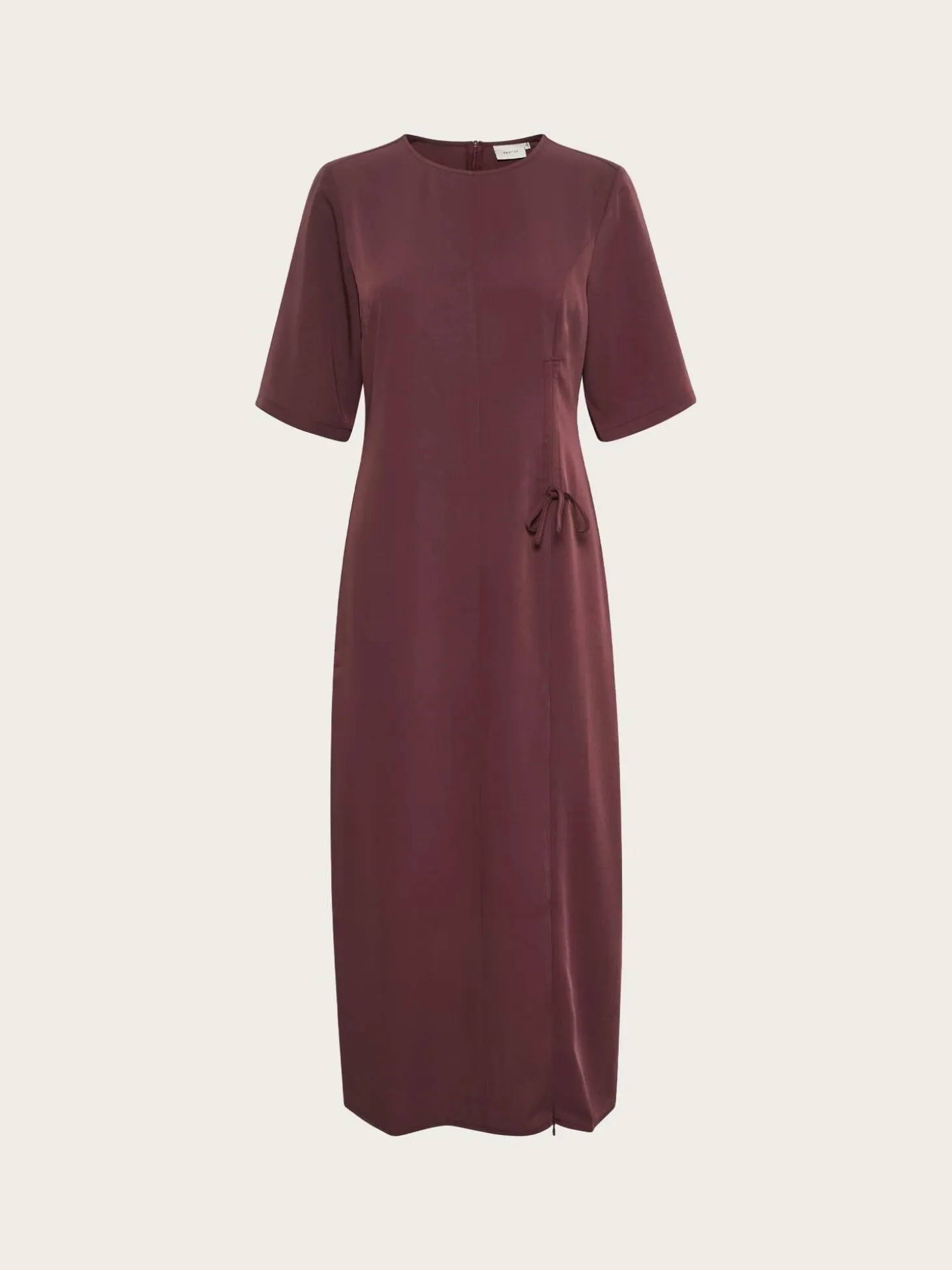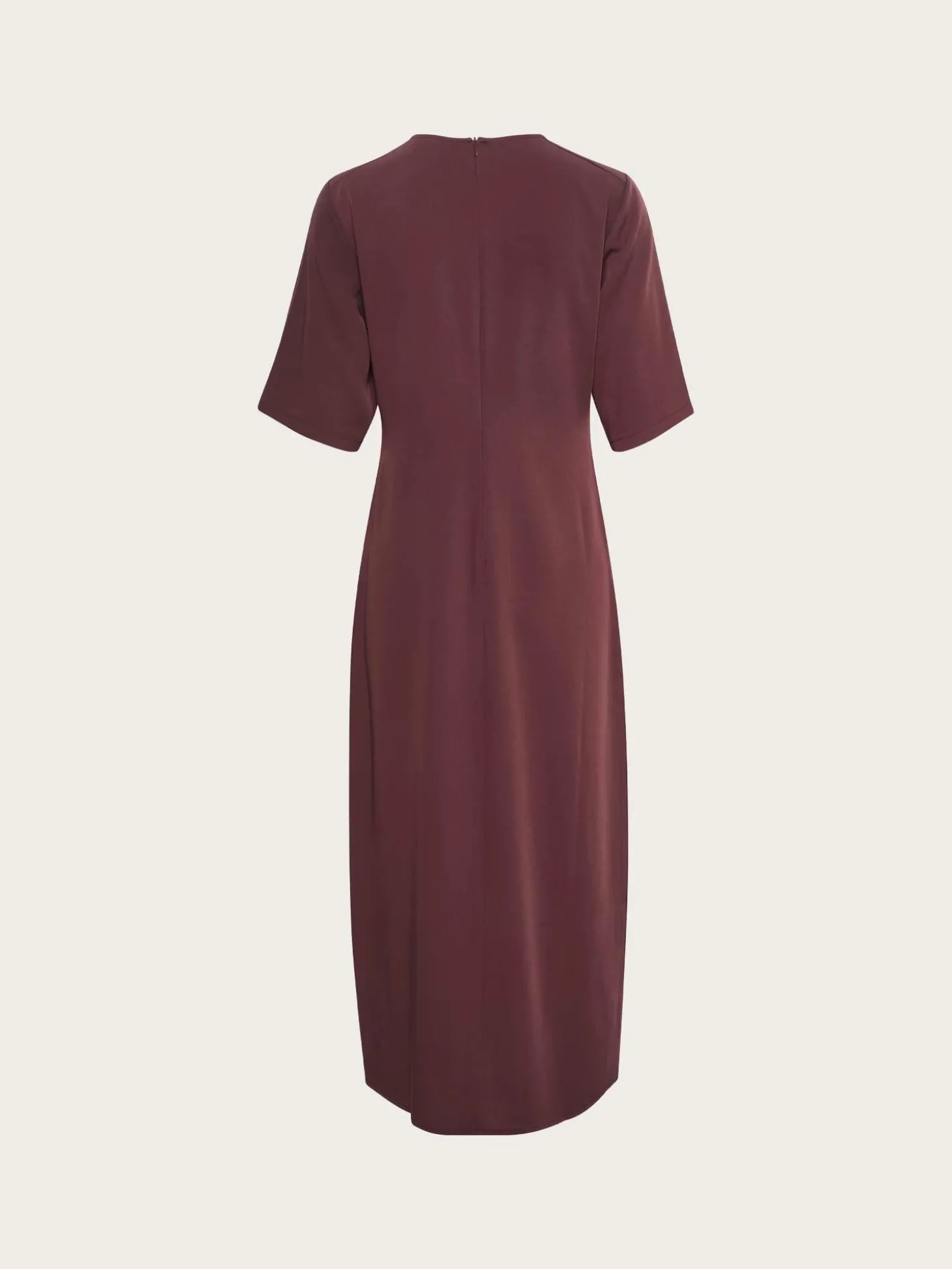 Braya Midi Dress fra Gestuz. En lekker midikjole i en fin brunfarge. Den har rund hals, trekvart lange ermer og en splitt på venstre side som kan lukkes med en skjult glidelås. Den har en vertikal snøring i midjen på venstre side.
