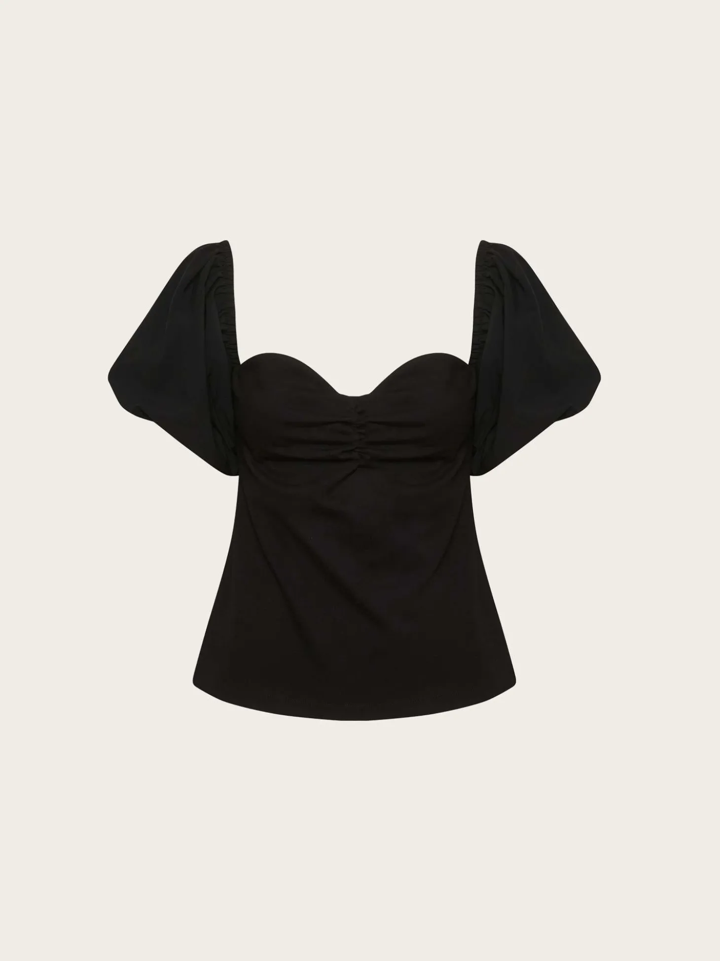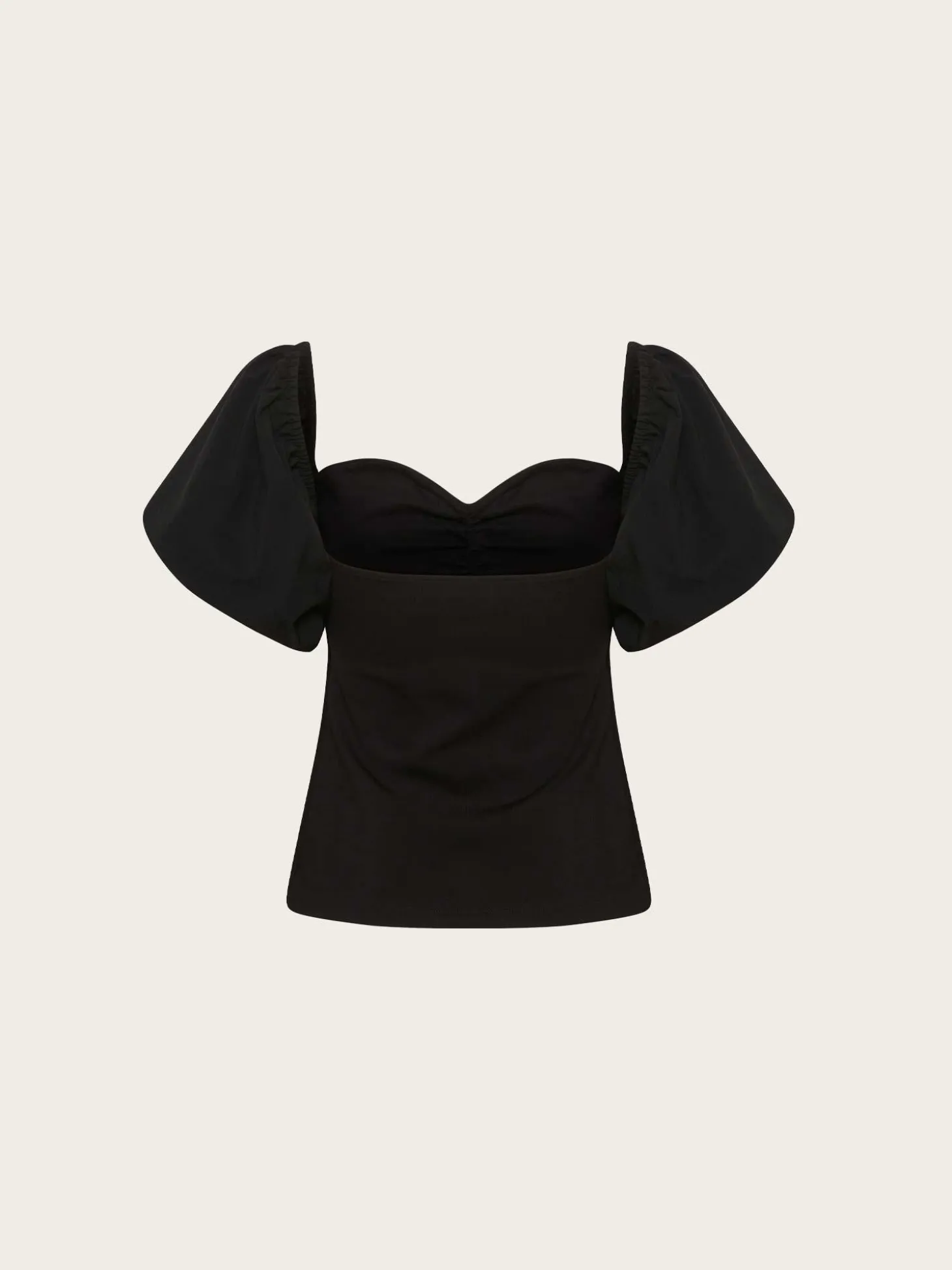 En lekker kortermet topp med puffermer og draperingsdetaljer i front. Den har en flatterende utringning i front og dyp utringning bak.