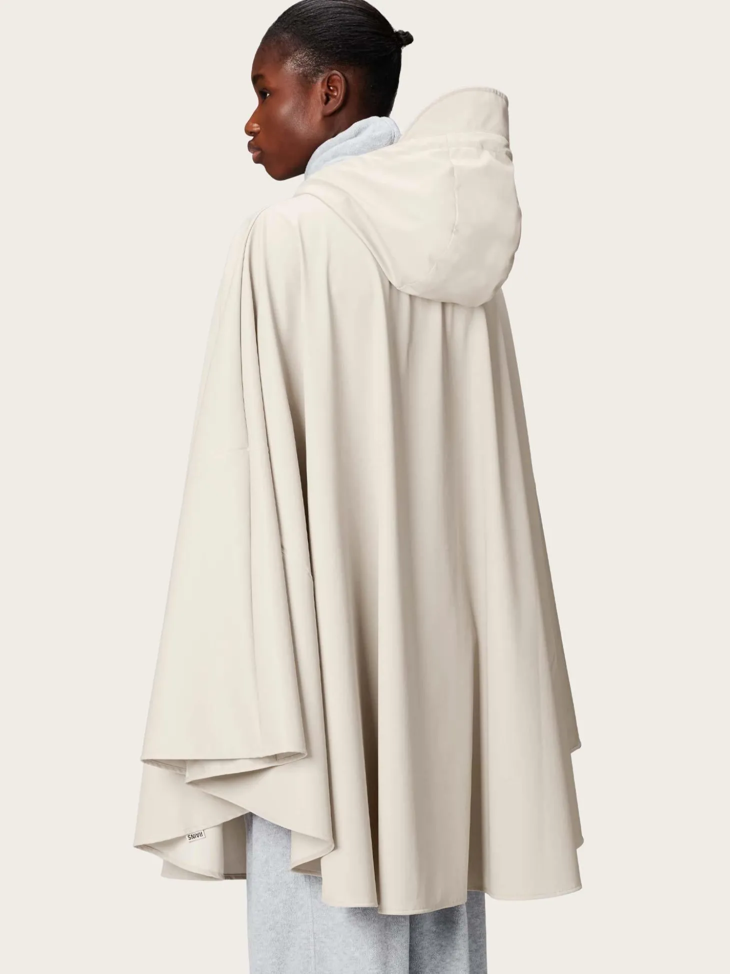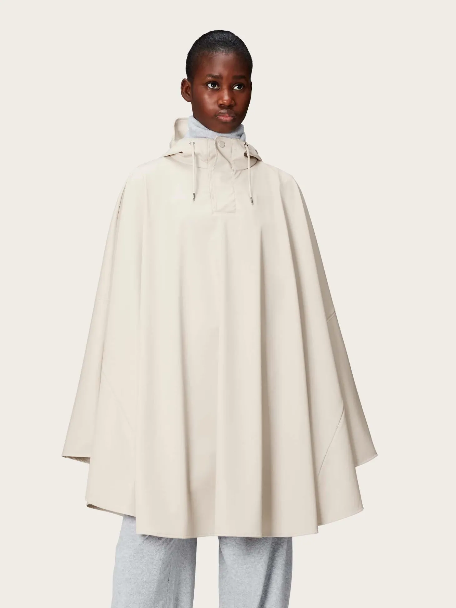 En klassisk og regntett cape. Den har hette med snøring og trykknapper i halsen i front.