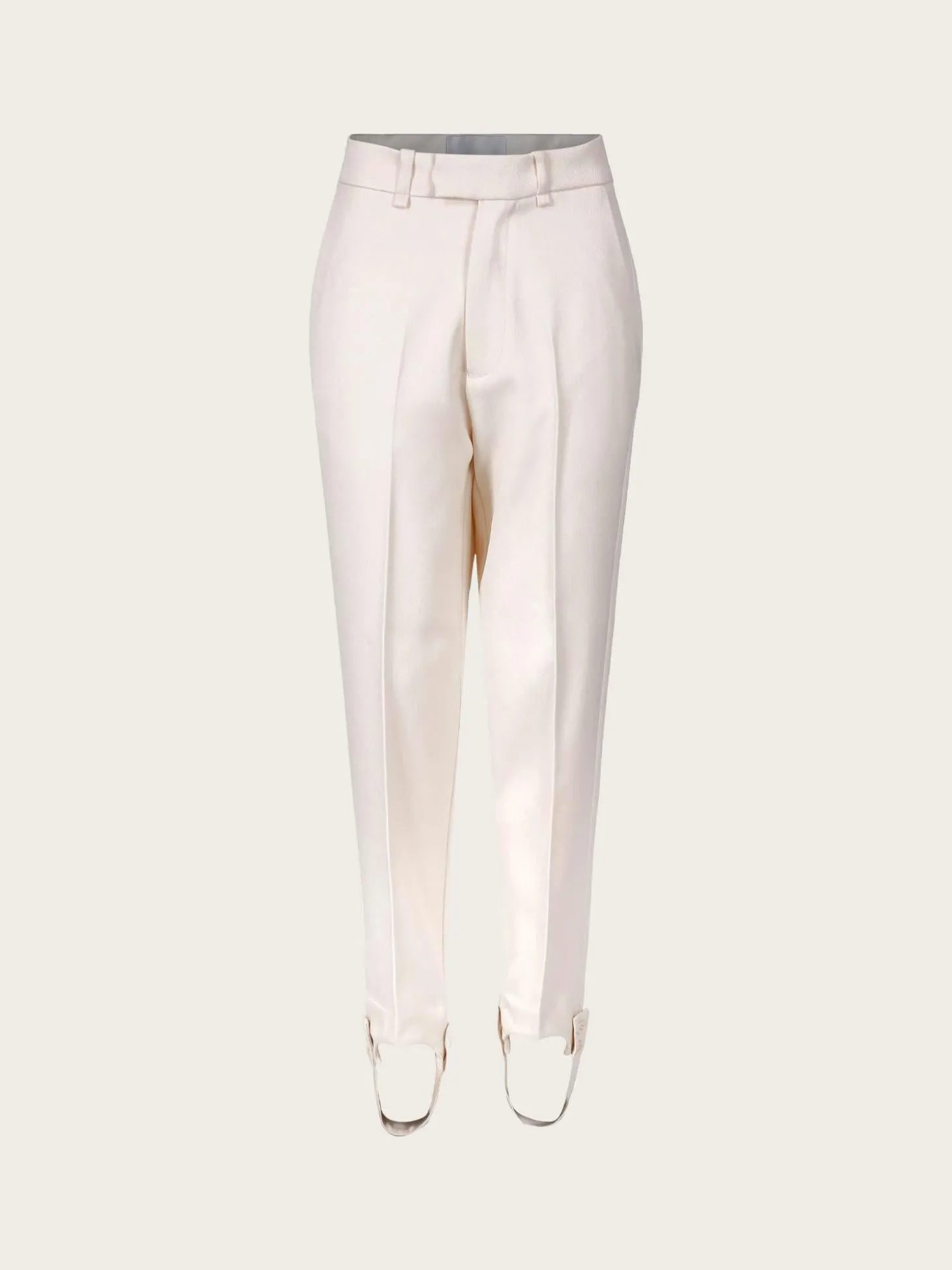 En klassisk og elegant bukse, med strikk nederst som kan festet under føttene. Den har medium høyde på livet, lommer i sidene og press i front.
