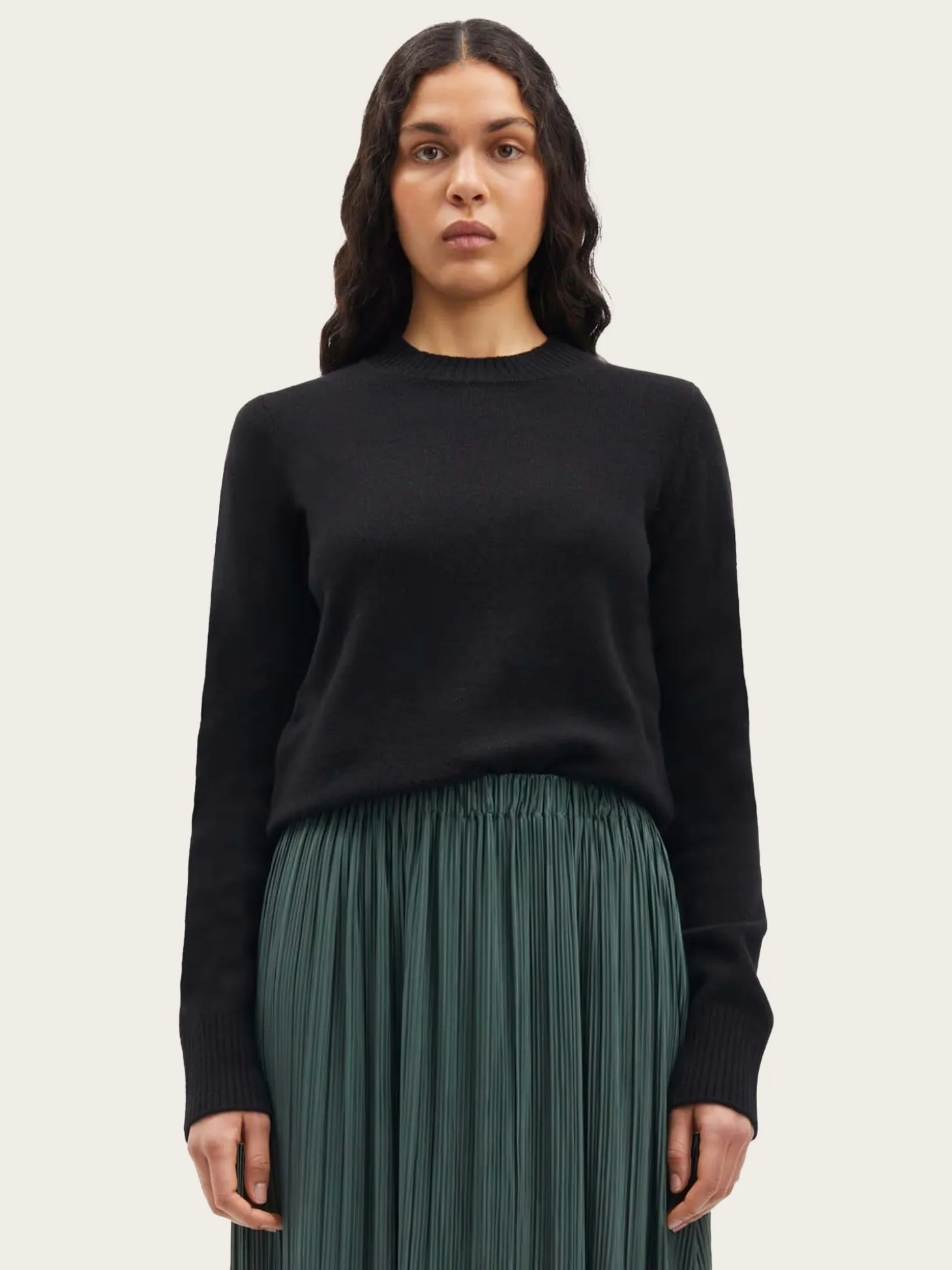 Modellen er 179 cm høy og har på seg størrelse S