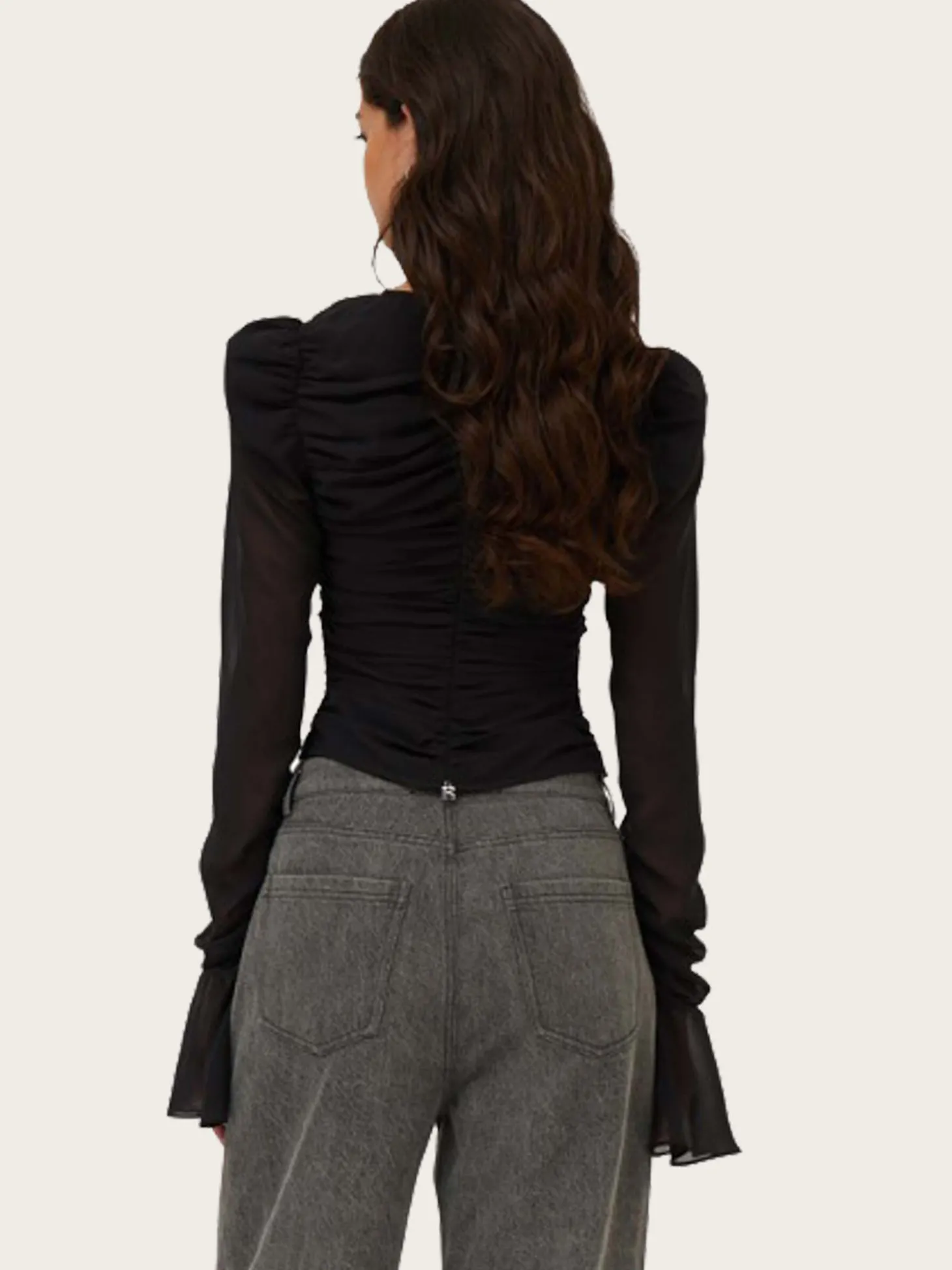 En nydelig sort topp, i en figurnær passform. Den har pufferm med volangkanter nederst, og flatterende draperinger.