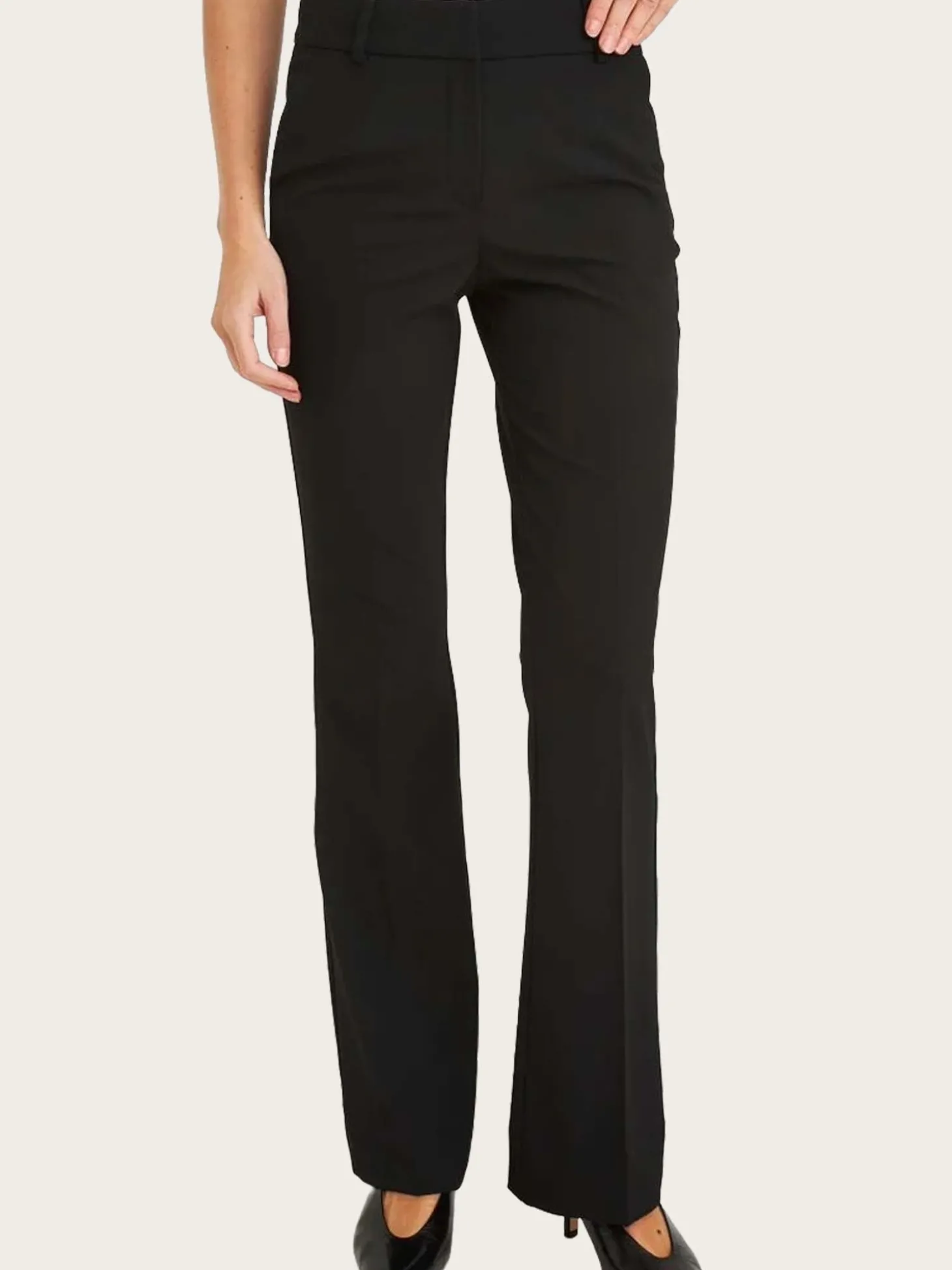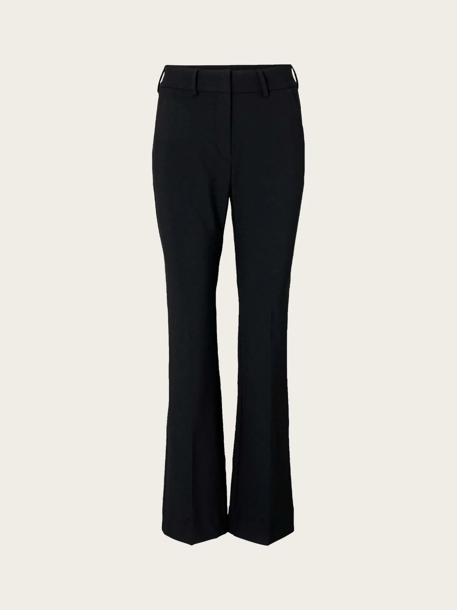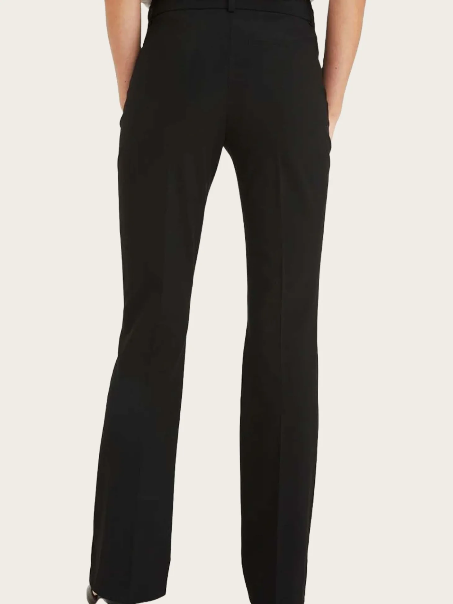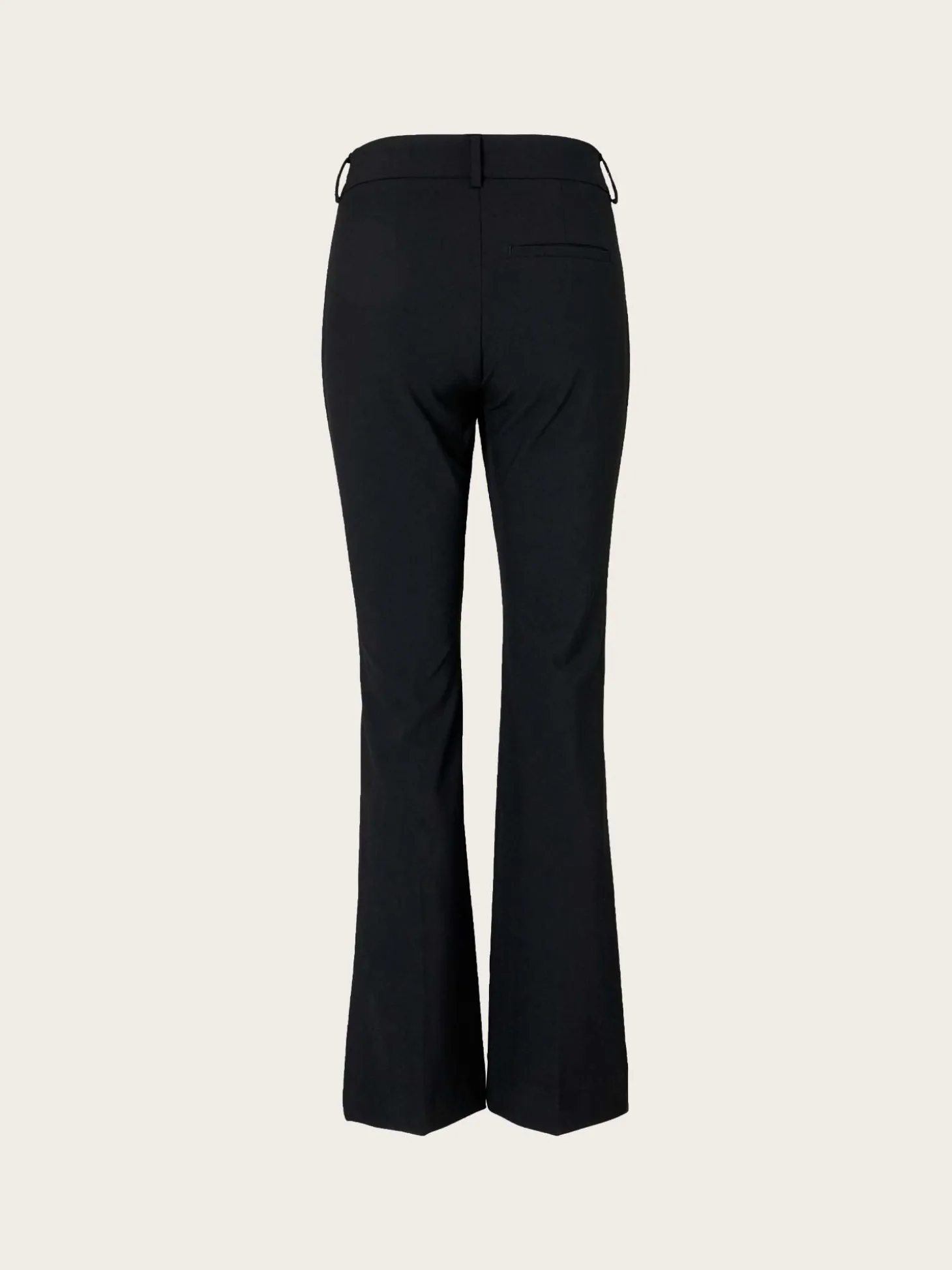 En lang, svart dressbukse med lett sleng og press i front. Buksen har lommer på sidene.