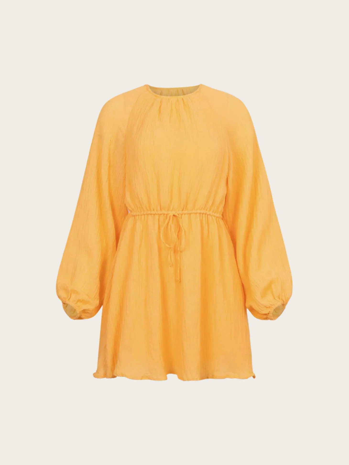 En deilig minikjole i en nydelig farge. Den har lange voluminøse ermer, åpen rygg med knytedetaljer og en elastisk snøring i midjen.