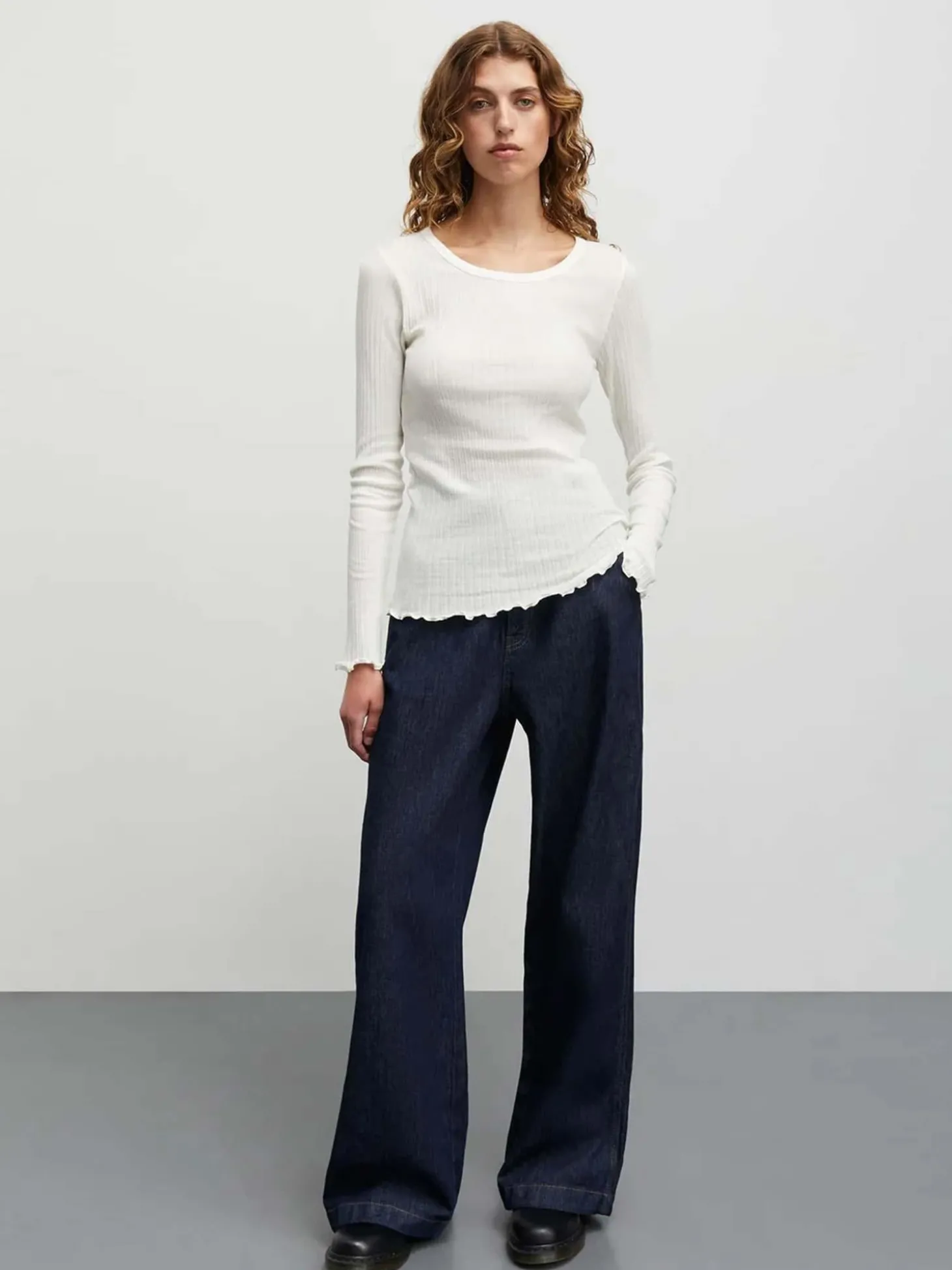 Så kule denim bukser laget i lett og myk bomull. Passformen er mid waist med vide ben, noe som gir et avslappet og stilrent uttrykk. Perfekt til både hverdagsbruk og mer pyntede antrekk.