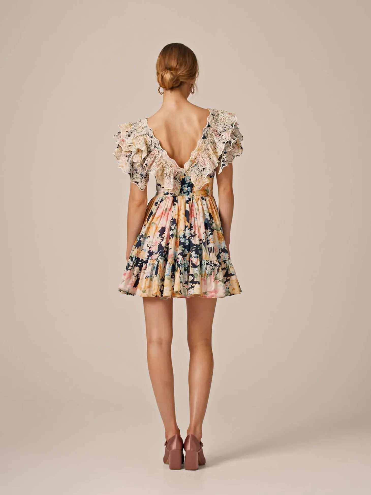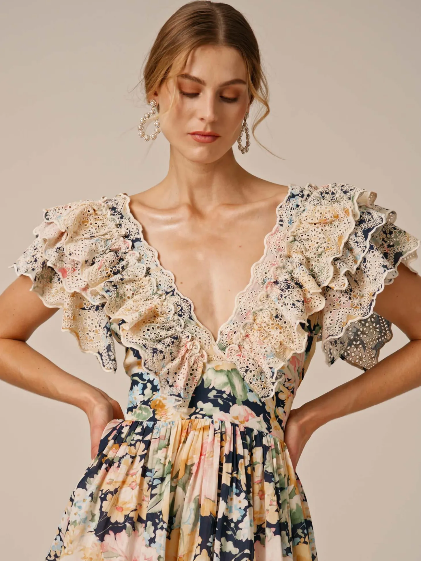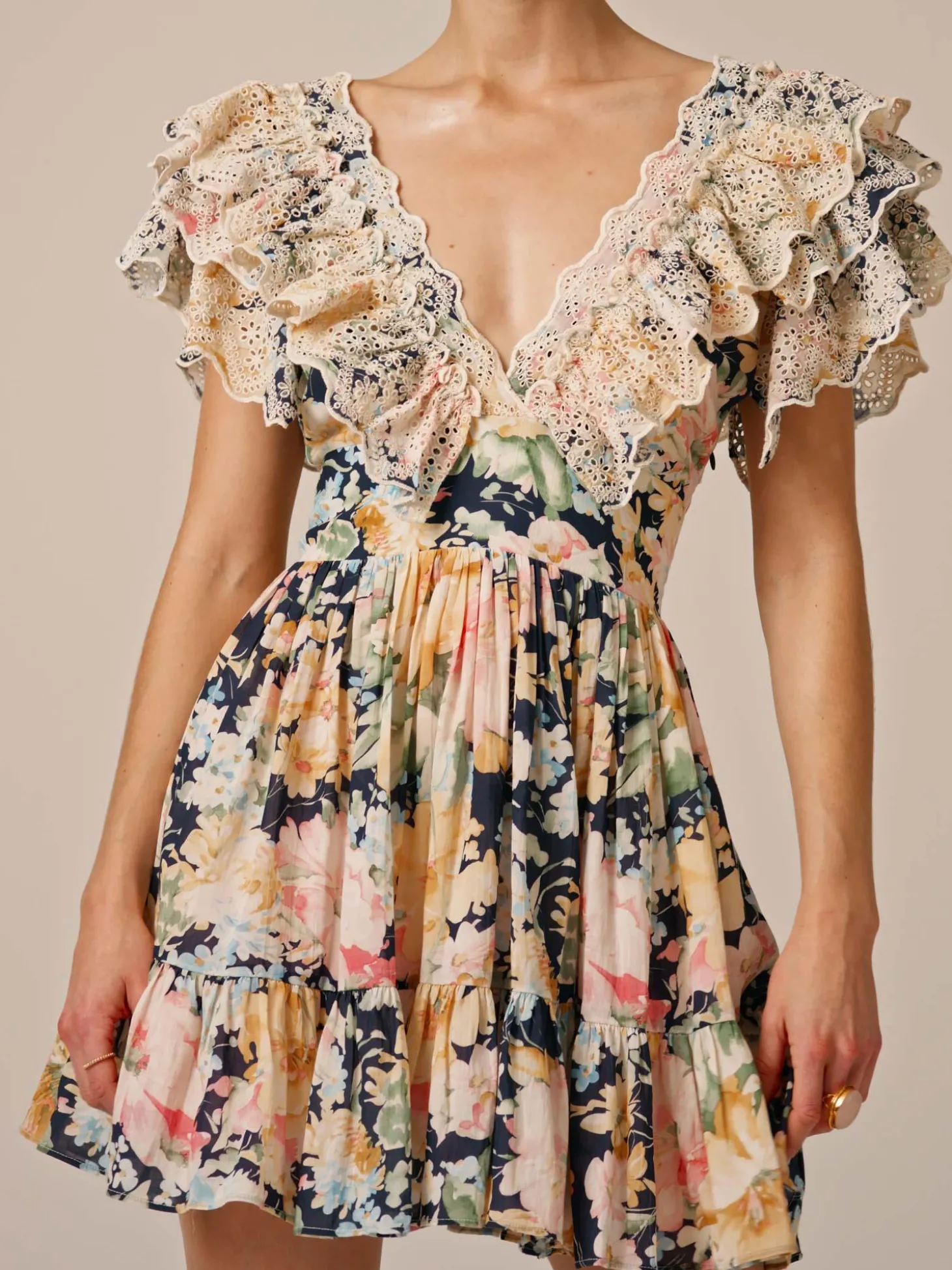 En vakker kjole med blomsterprint og dyp v-utringning både foran og bak. Den har lekre blondetaljer, korte rmer, markert midje og god vidde i skjørtet. Elsker!