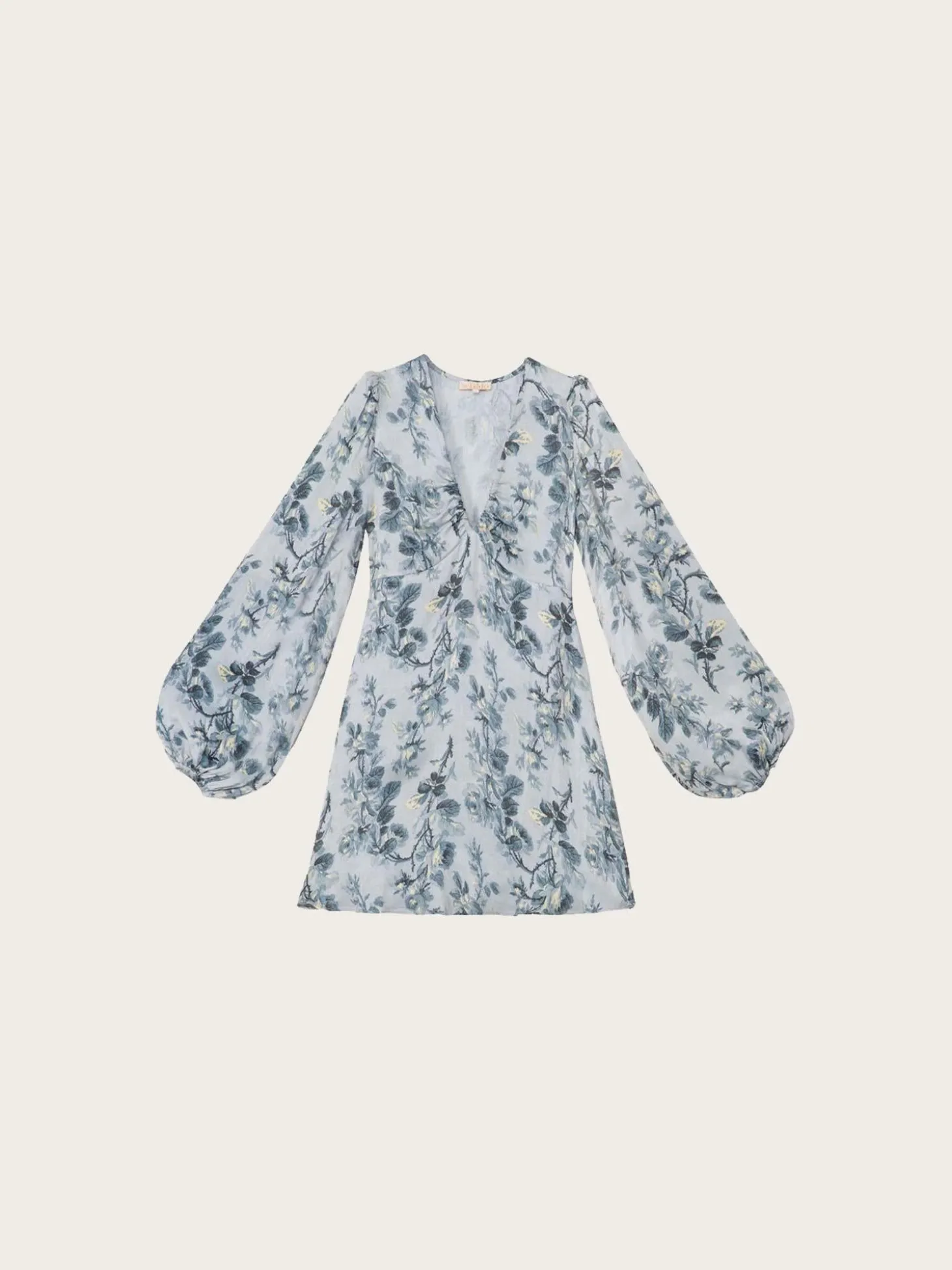 En nydelig minikjole i vintage-inspirert blomsterprint. Den har lange ballongermer, dyp v-utringing og a-fasong.