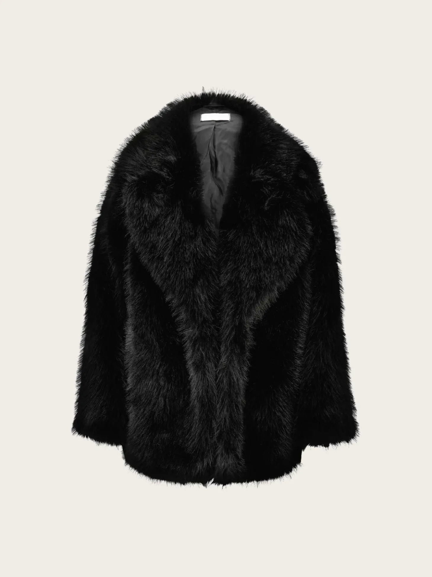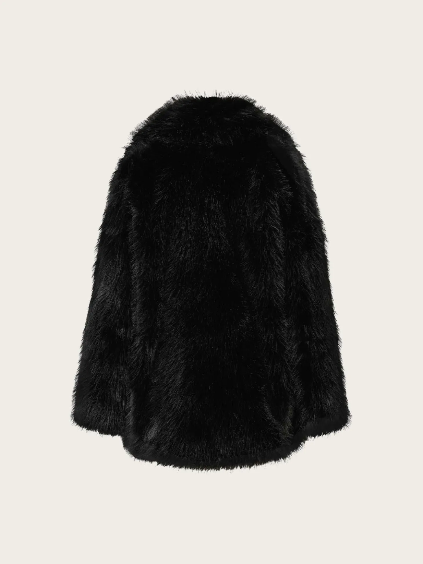 En herlig statement jakke i luksuriøs faux fur. Den har stor krage, lange ermer og stikklommer i sidene. Jakken rekker til midt på låret.