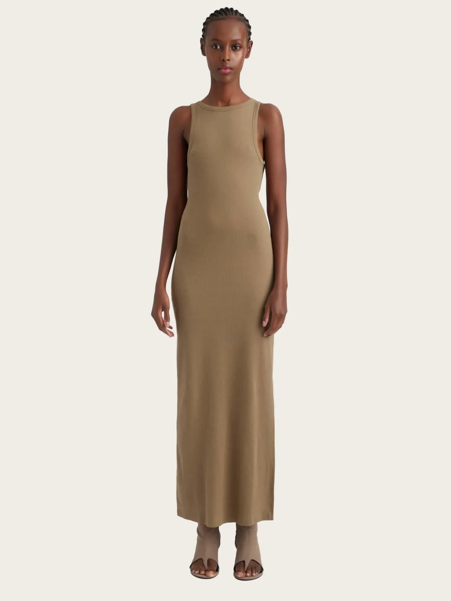 En tettsittende kjole med stretch, i en nøytral grågrønn farge. Kjolen har ankellengde, og kan styles begge veier.