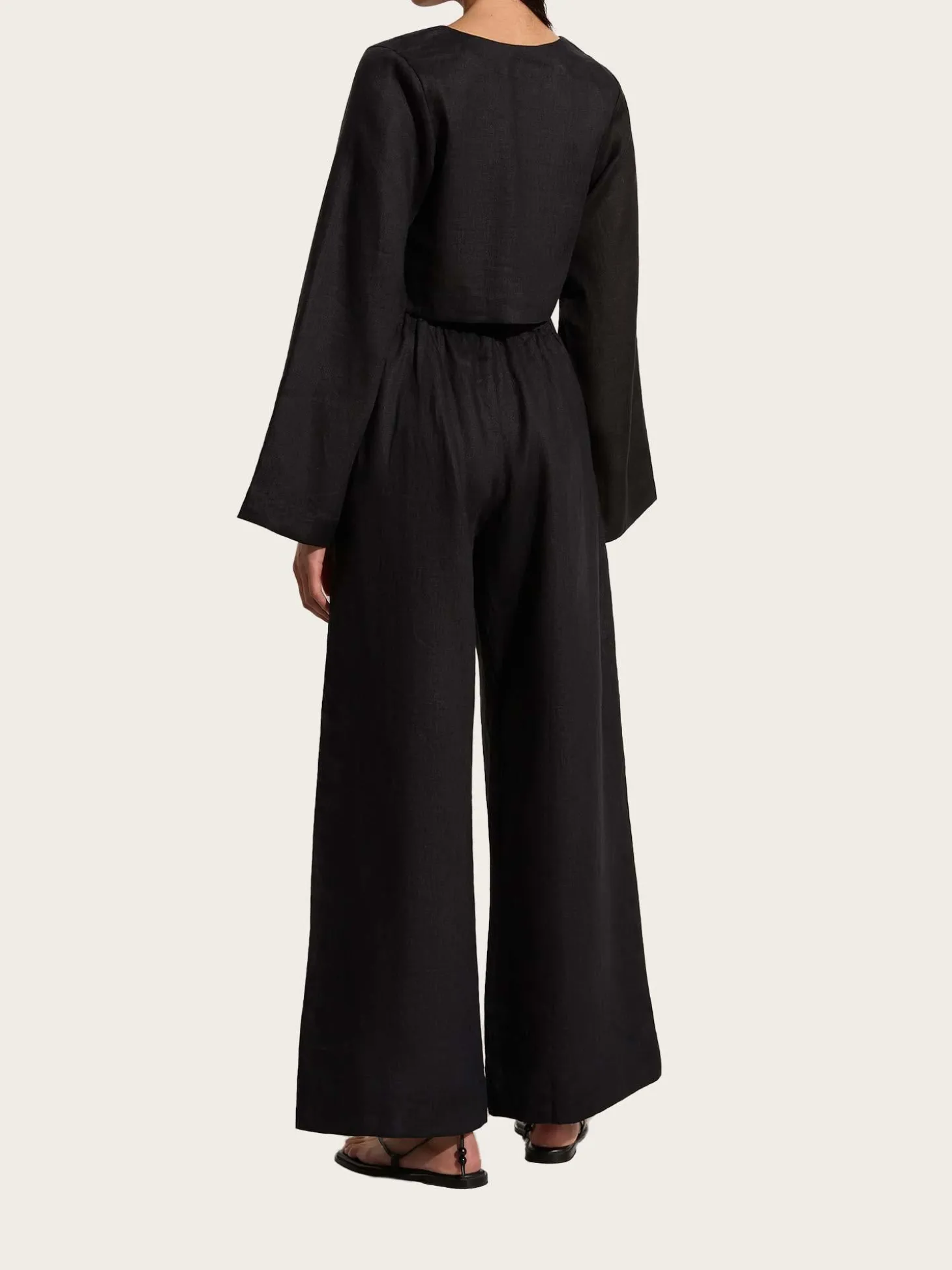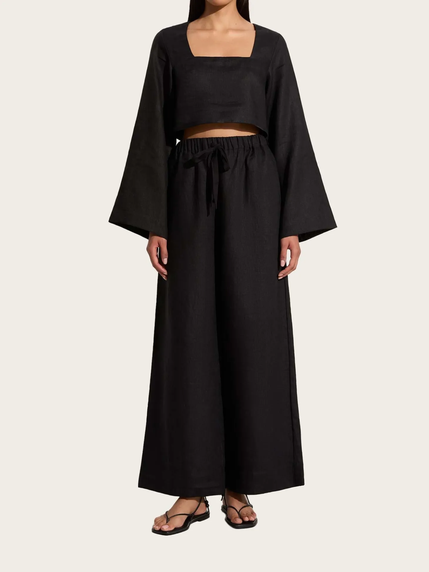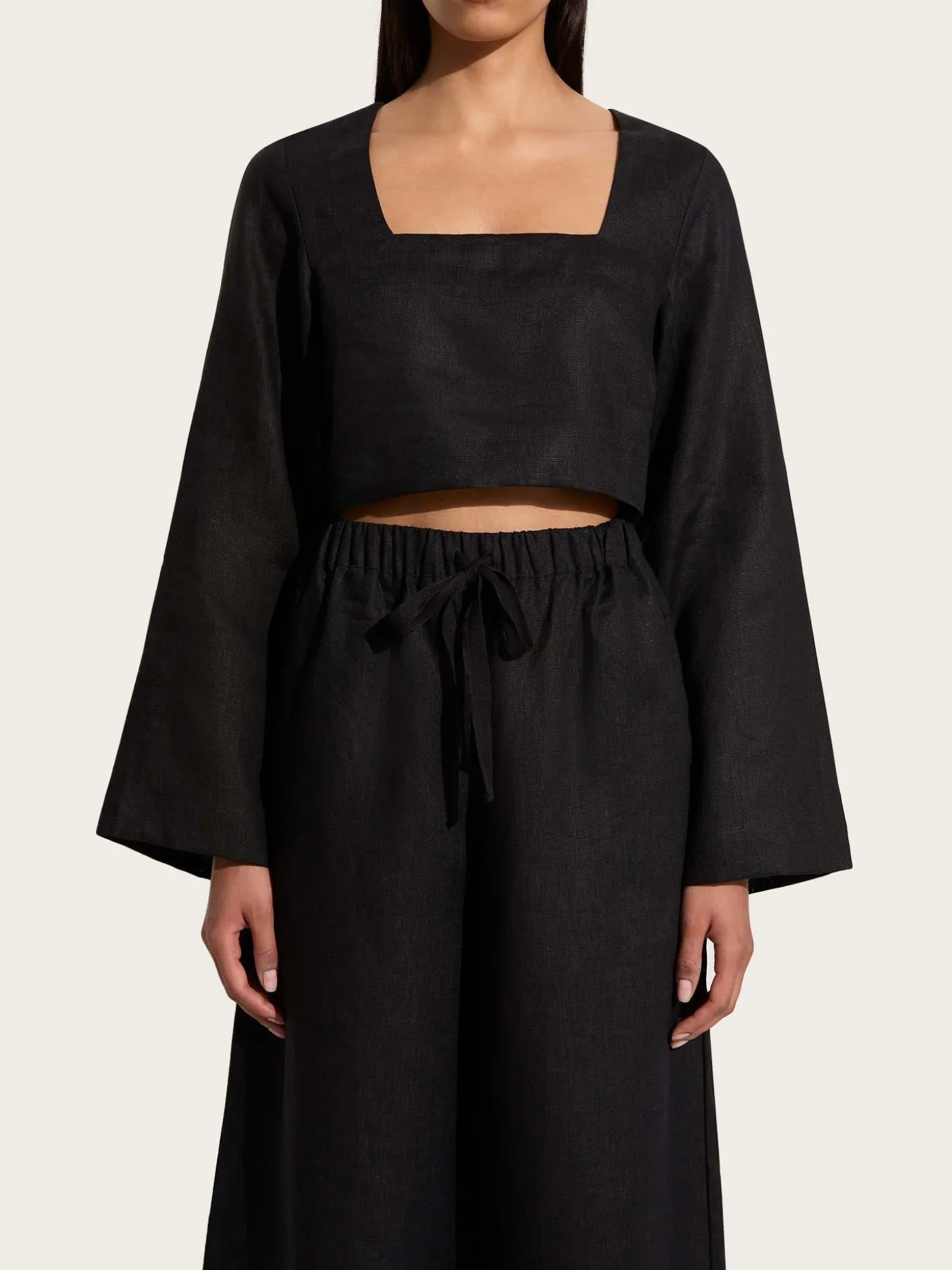 En svart, cropped topp av lin. Toppen har en boxy fit, med brede ermer og en firkantet utringning.