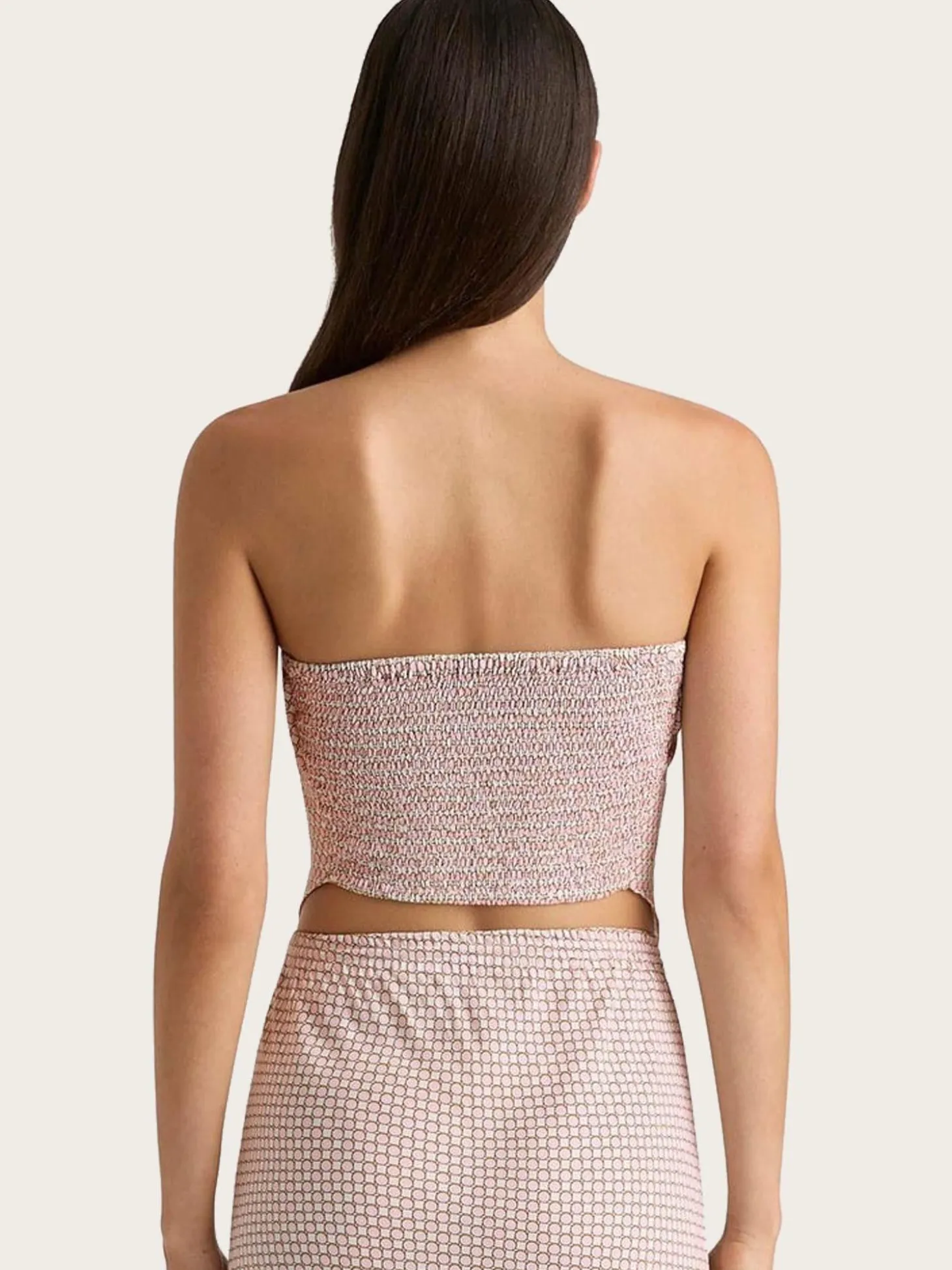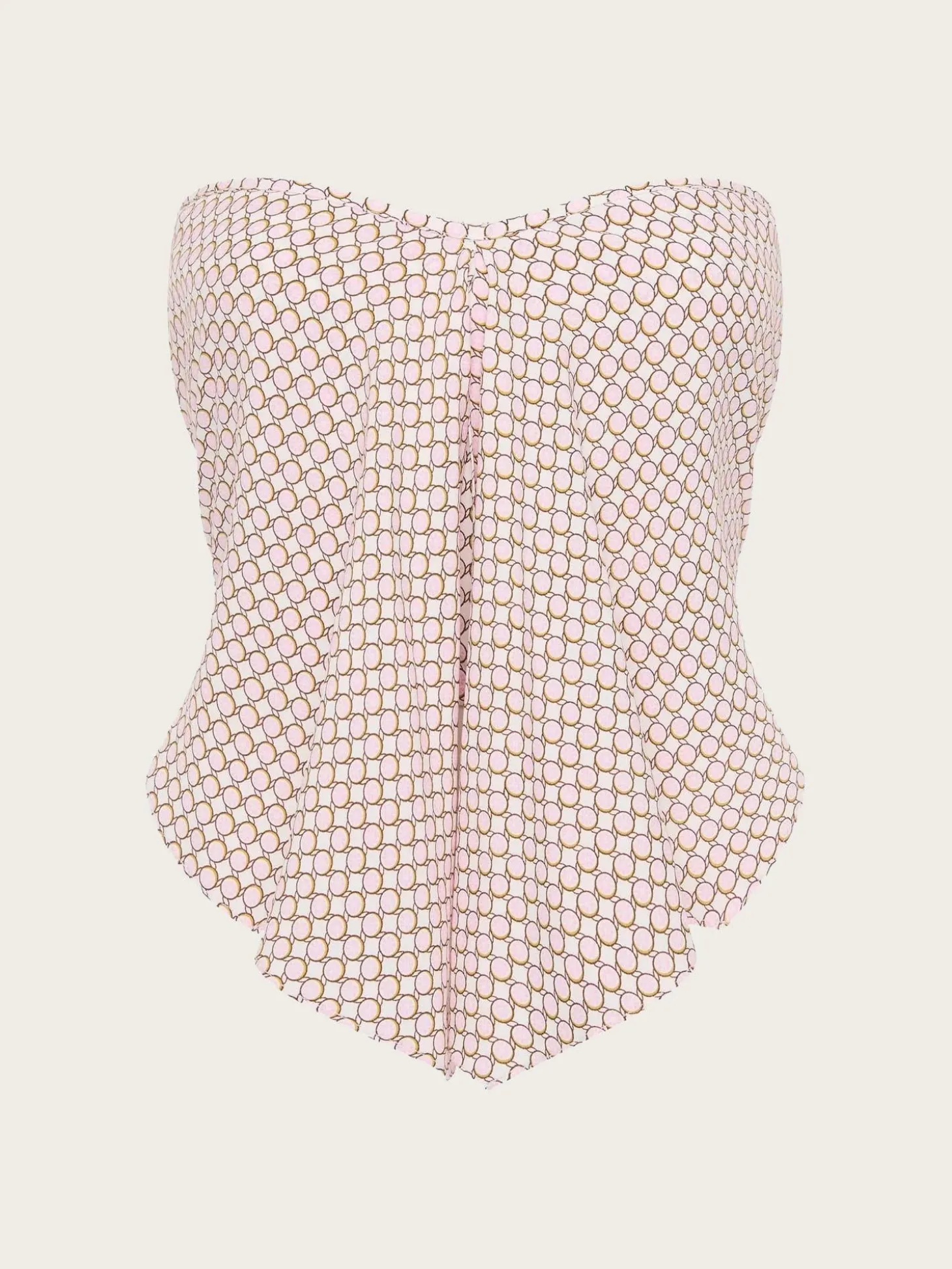 En nydelig stroppeløs topp, i et nydelig print. Den har dekorativ drapering i front, og elastikk i ryggen som gjør at den sitter godt på.