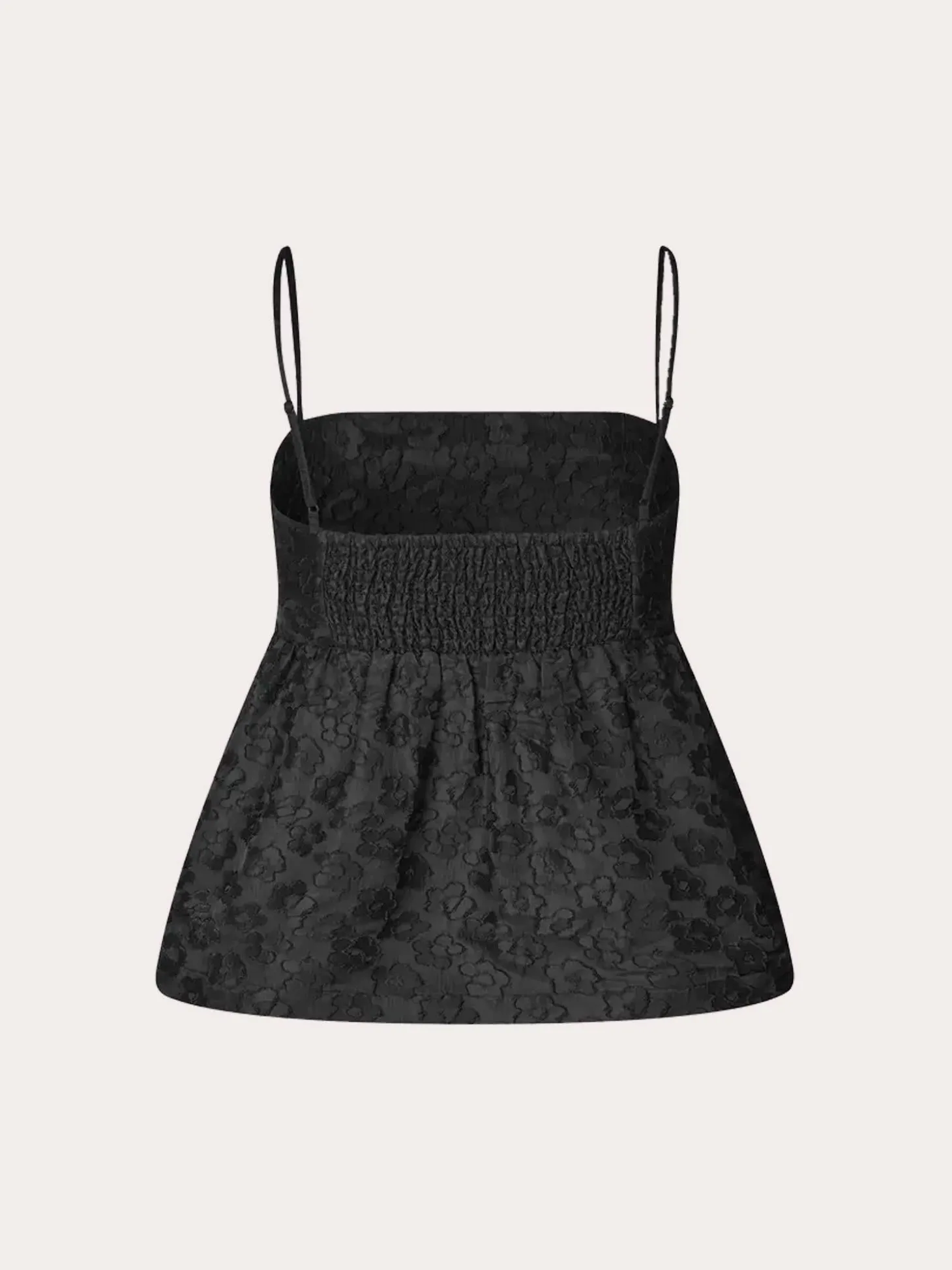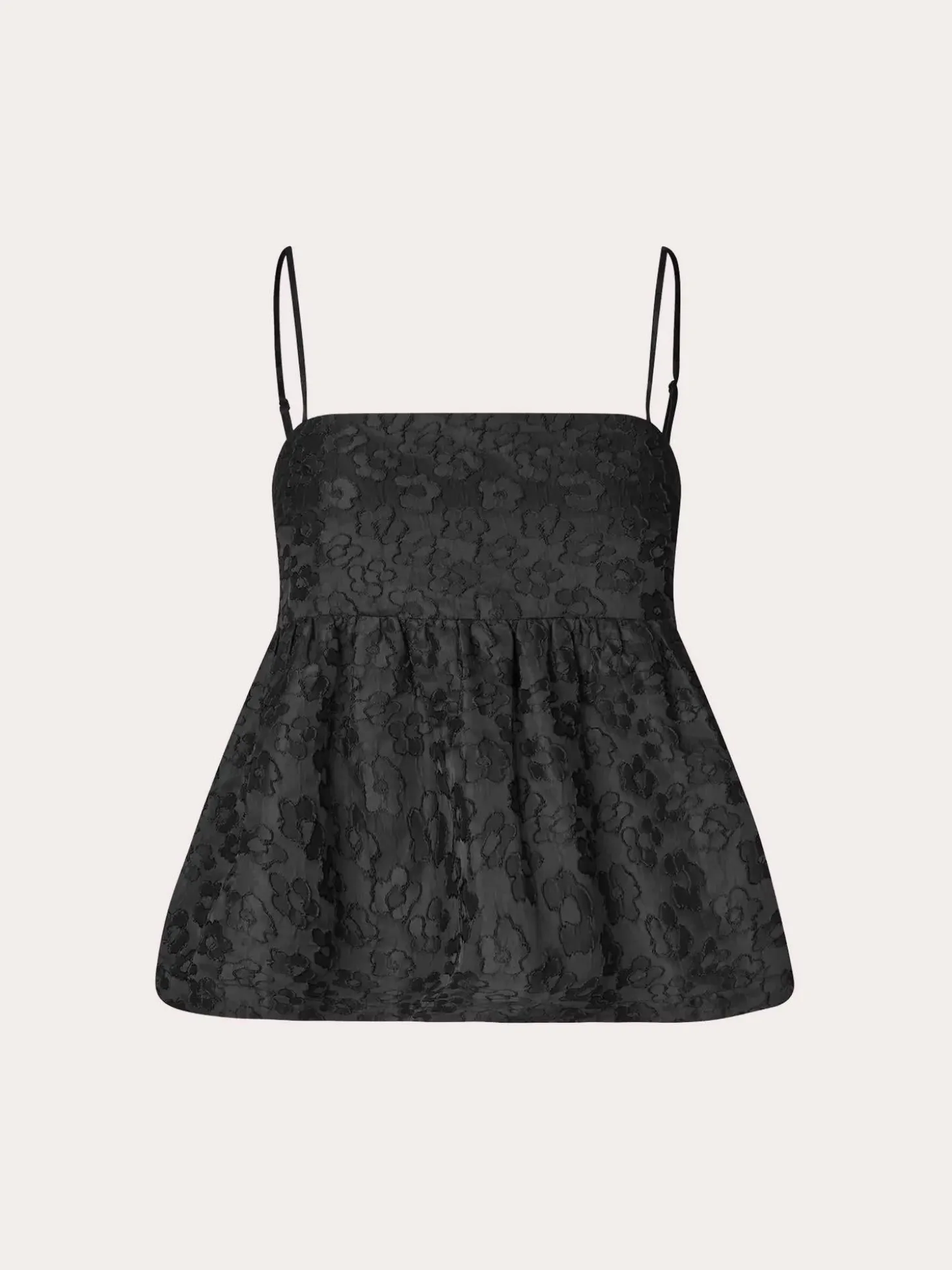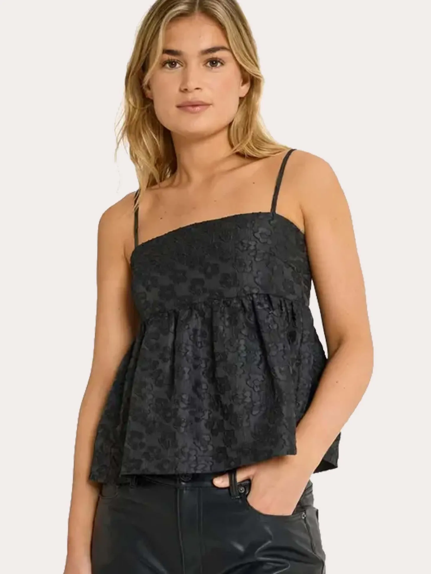 En nydelig babydoll top, med strukturert blomsterprint. Den har justerbare skulderstropper, elastikk i ruggen og godt med volum.