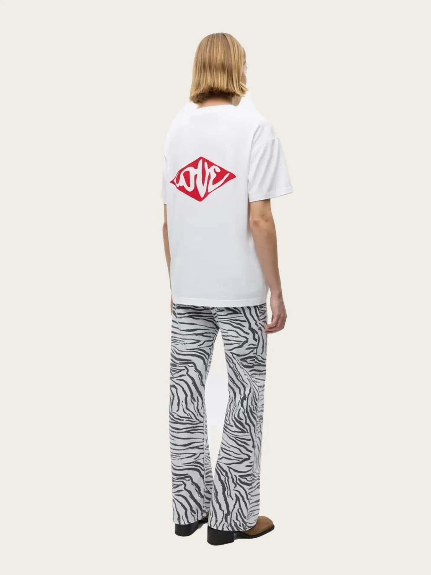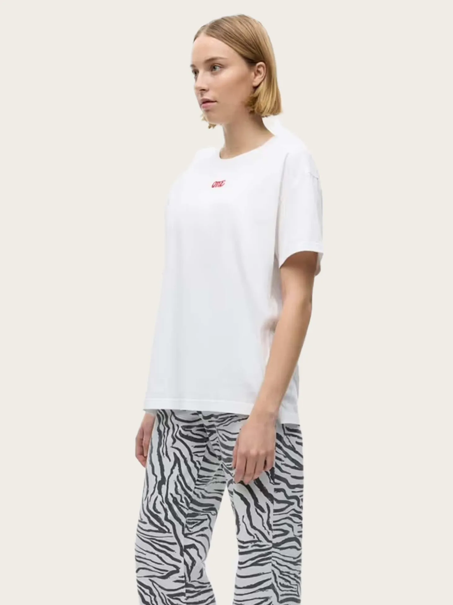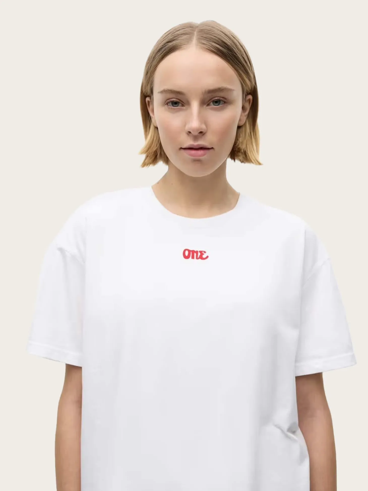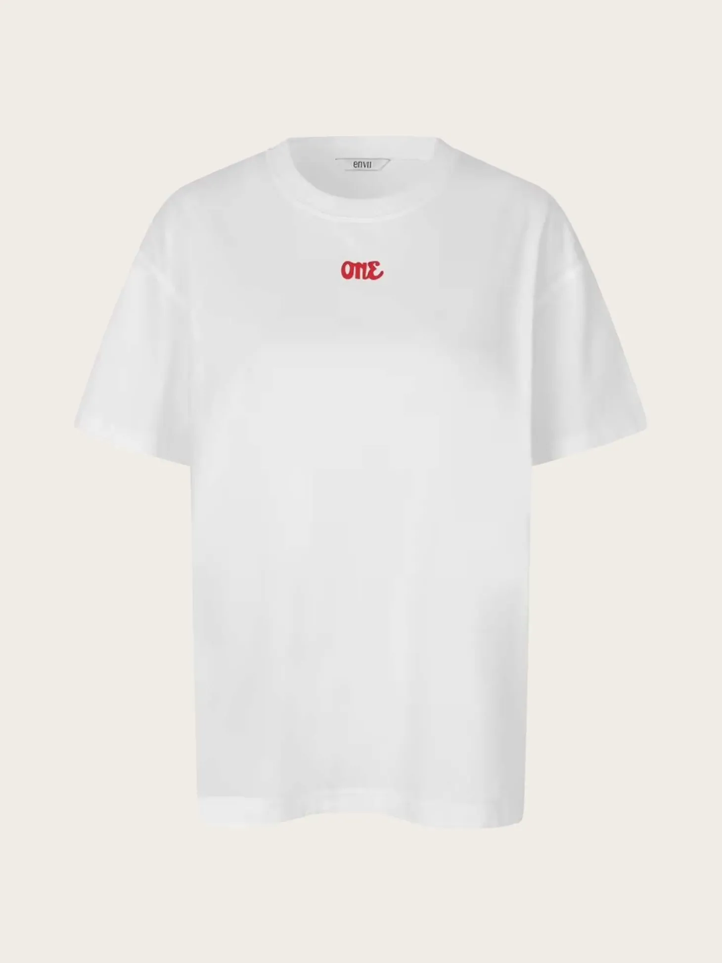 T-skjorten har et plassert trykk på fremsiden og ribbet kant i halsen. Den løstsittende passformen gir et avslappet uttrykk, perfekt til både jeans og skjørt for en casual, men stilfull look.