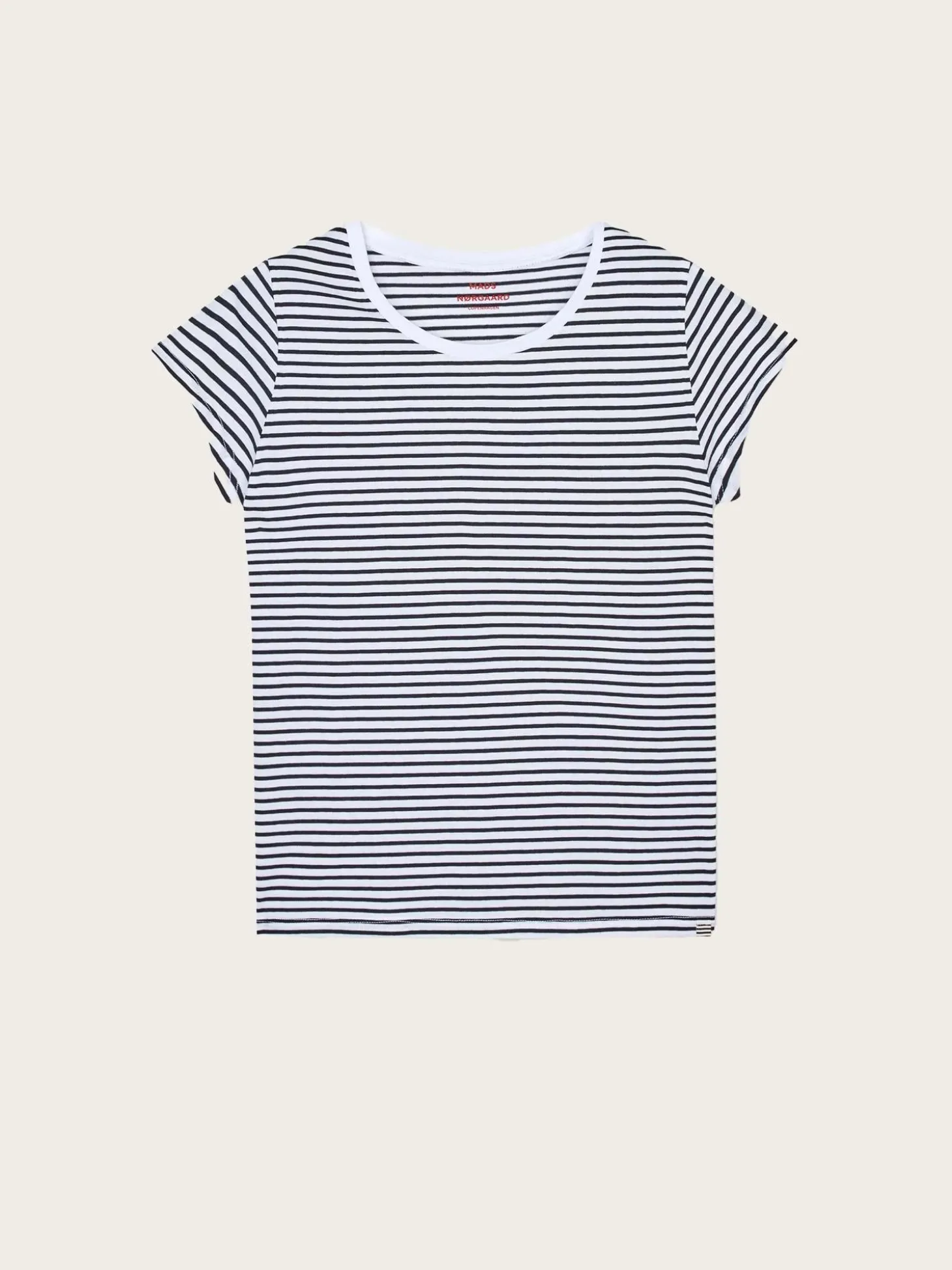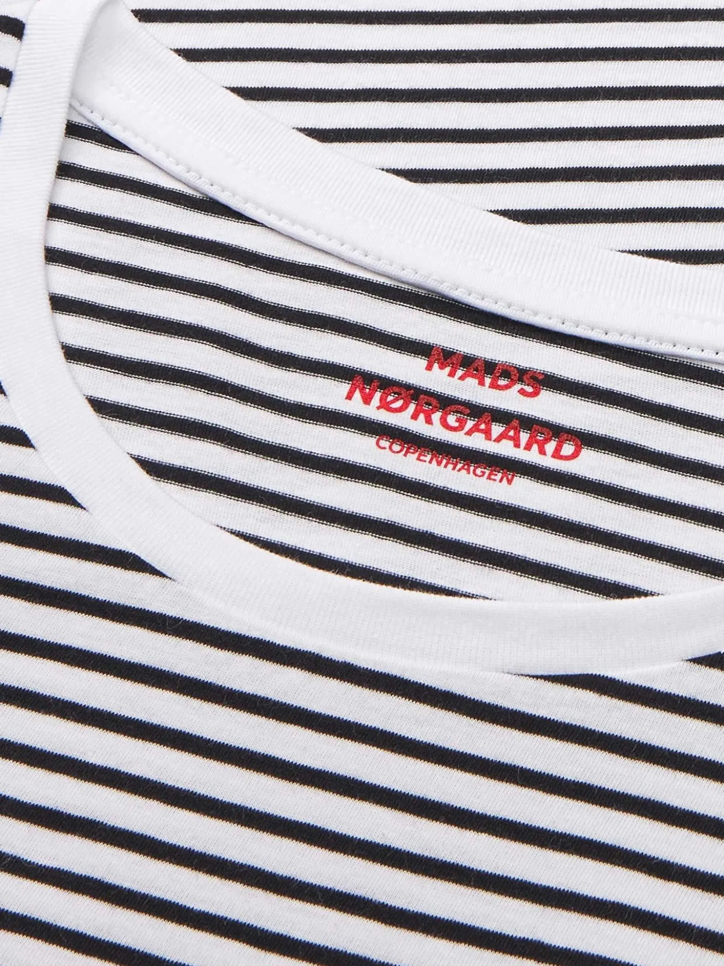 Fine Jersey Stripe Teasy Tee fra Mads Nørgaard. En klassisk og enkel t-skjorte, i myk bomull. Den har rund hals, korte ermer og en smal passform. Garderobefavoritt!