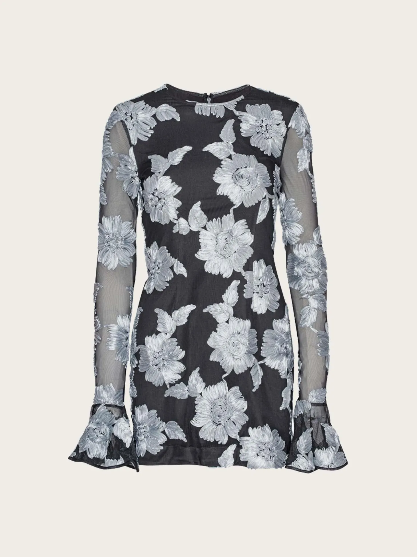 En nydelig kjole med en kort, figursydd silhuett. De lange, utsvingte ermene og den runde halsen gir kjolen et elegant preg, perfekt for sesongens festligheter, samtidig som den har en feminin og trendy look.