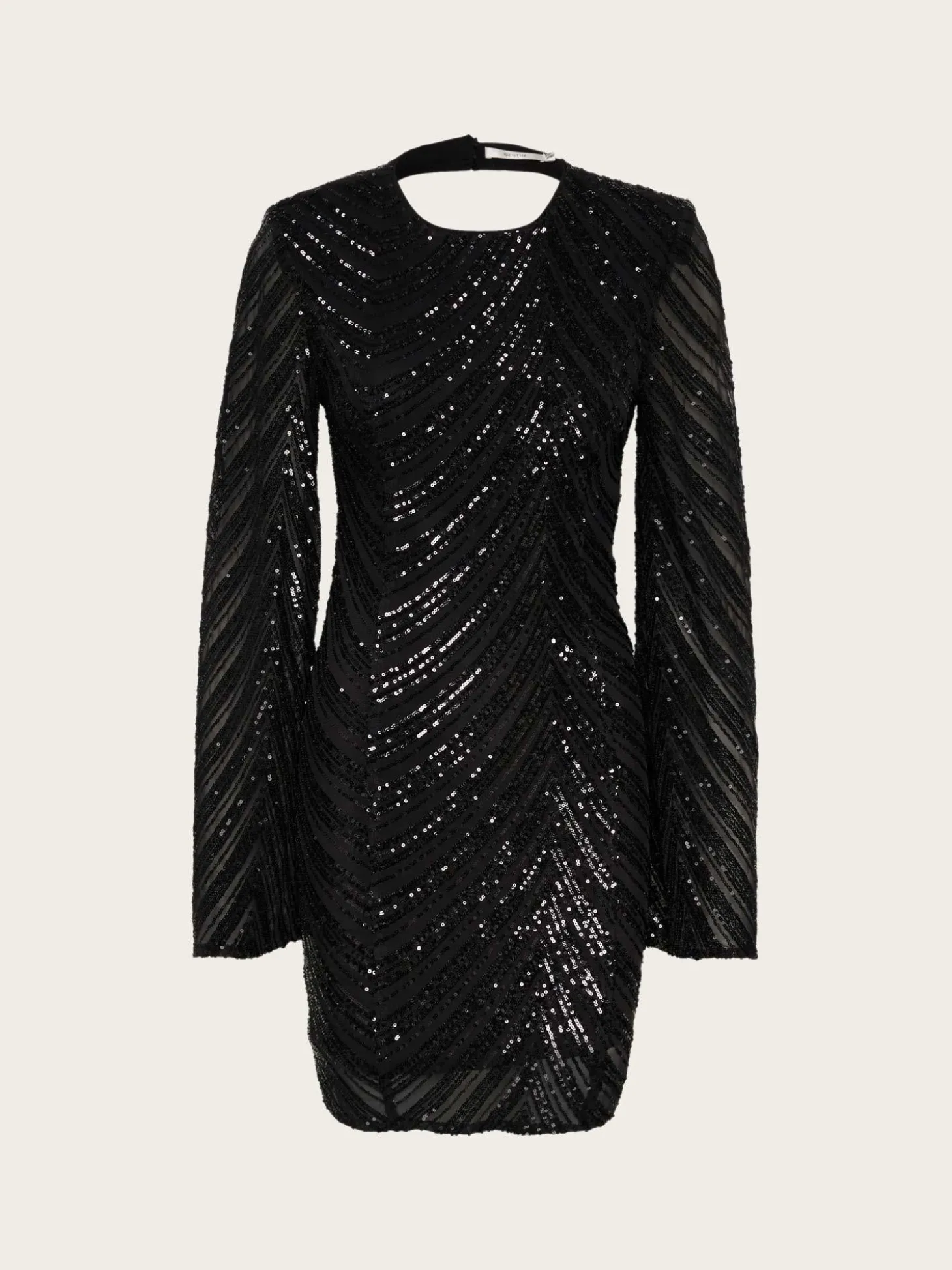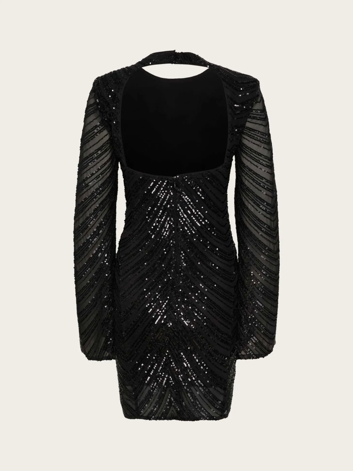Gjør deg klar for fest med denne glamorøse kjolen dekket av sorte paljetter som fanger lyset perfekt og gir en iøynefallende look. Den har figursydd passform, åpen rygg og vide ermer.
