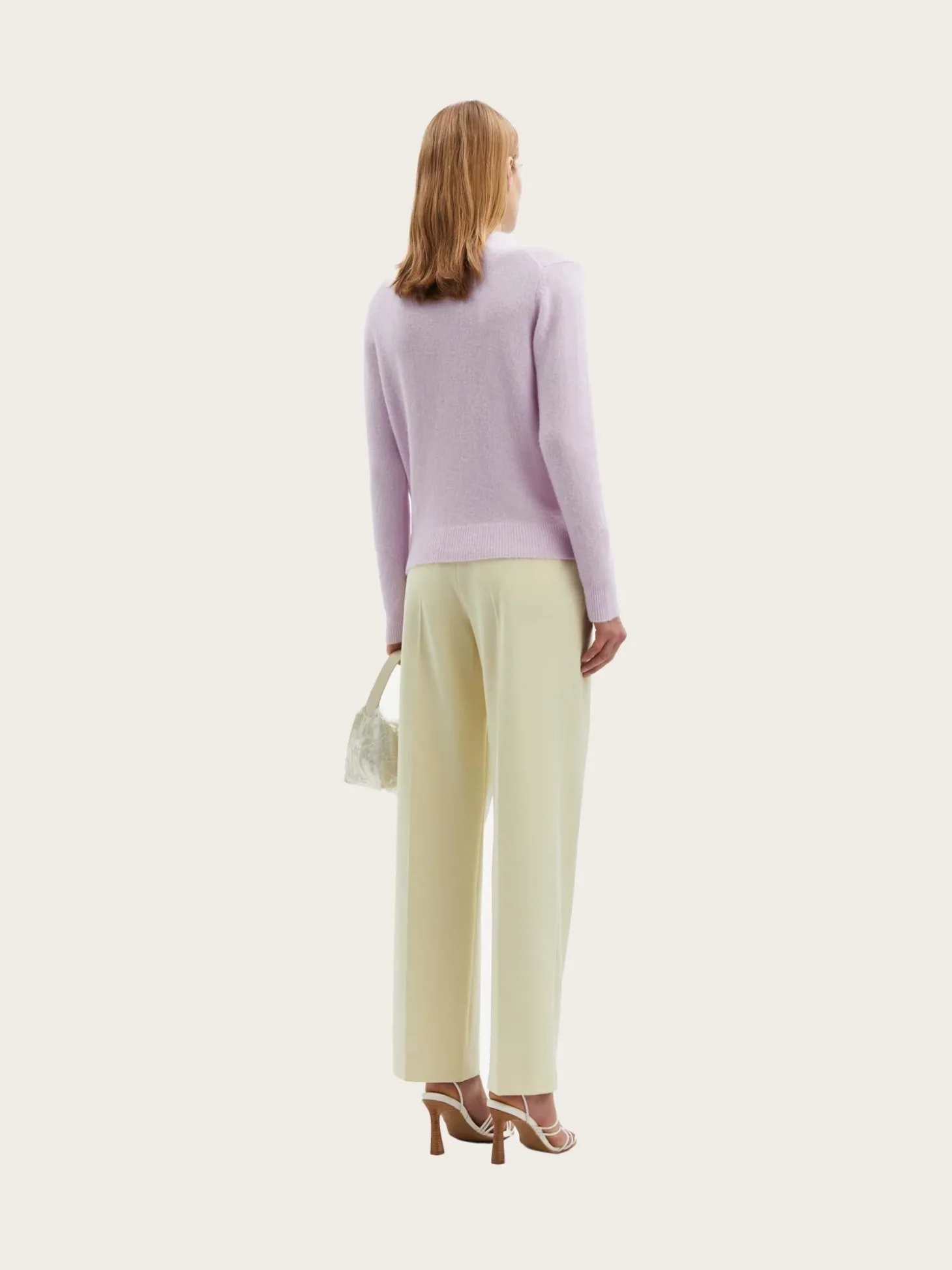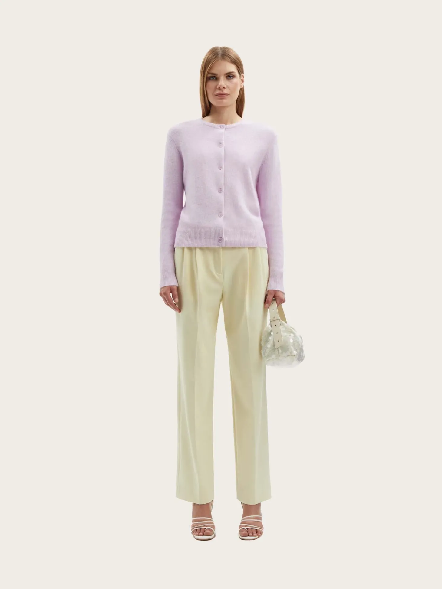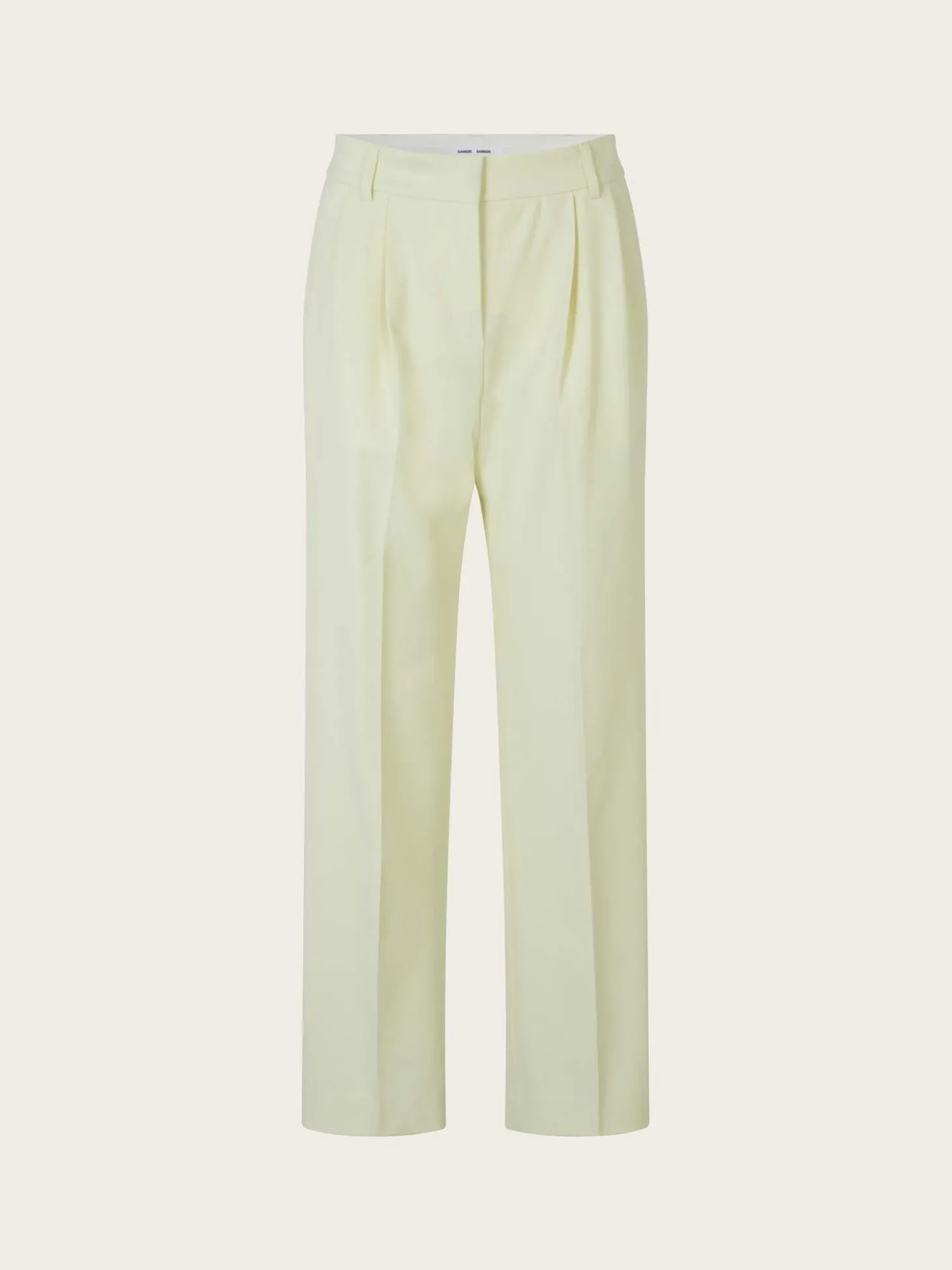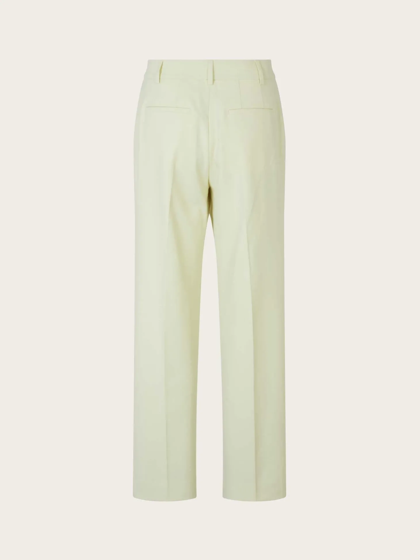 En dressbukse med press på front i en vårlig gulfarge. Buksen har normal passform, rette bein, sidelommer og beltehemper.