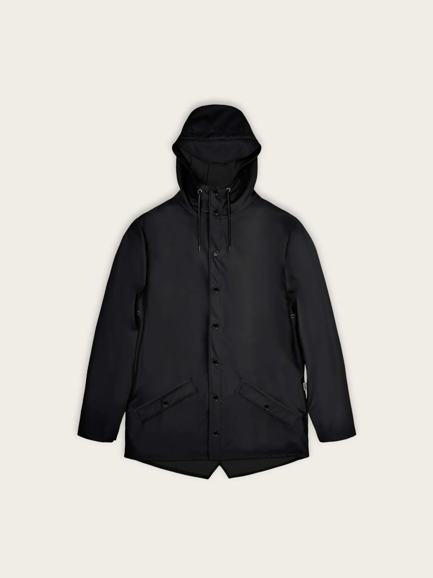 En klassisk regnjakke. Den har hette med snøring, lommer i sidene og lukkes med trykk-knapper.