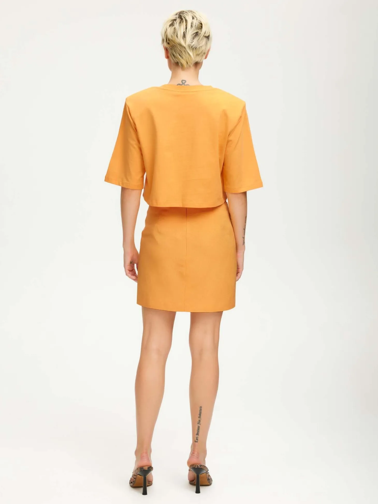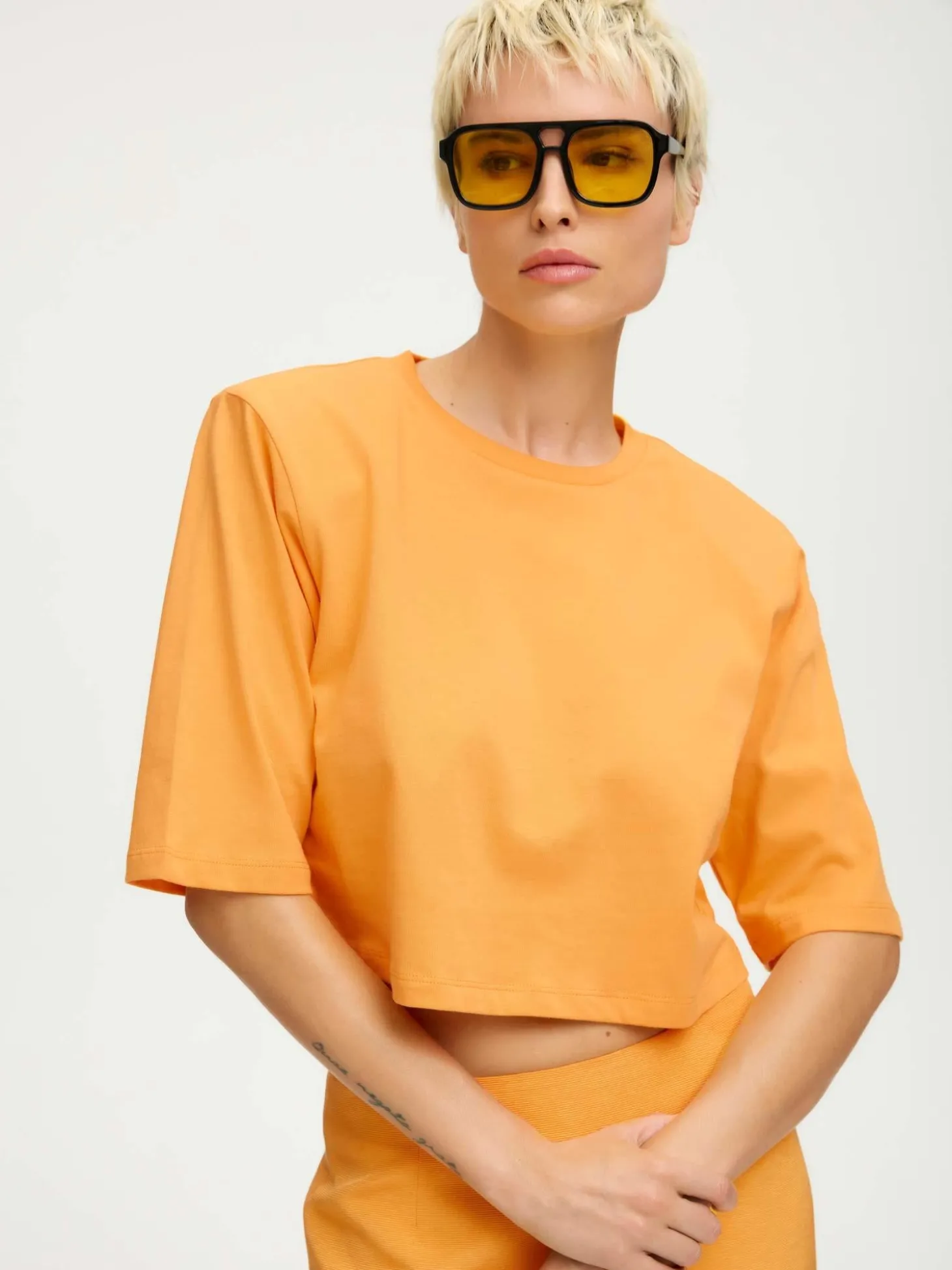 En enkel cropped t-skjorte med rund hals, korte ermer og en rett passform. Den har avtagbare skulderputer, for en mer edgy look.
