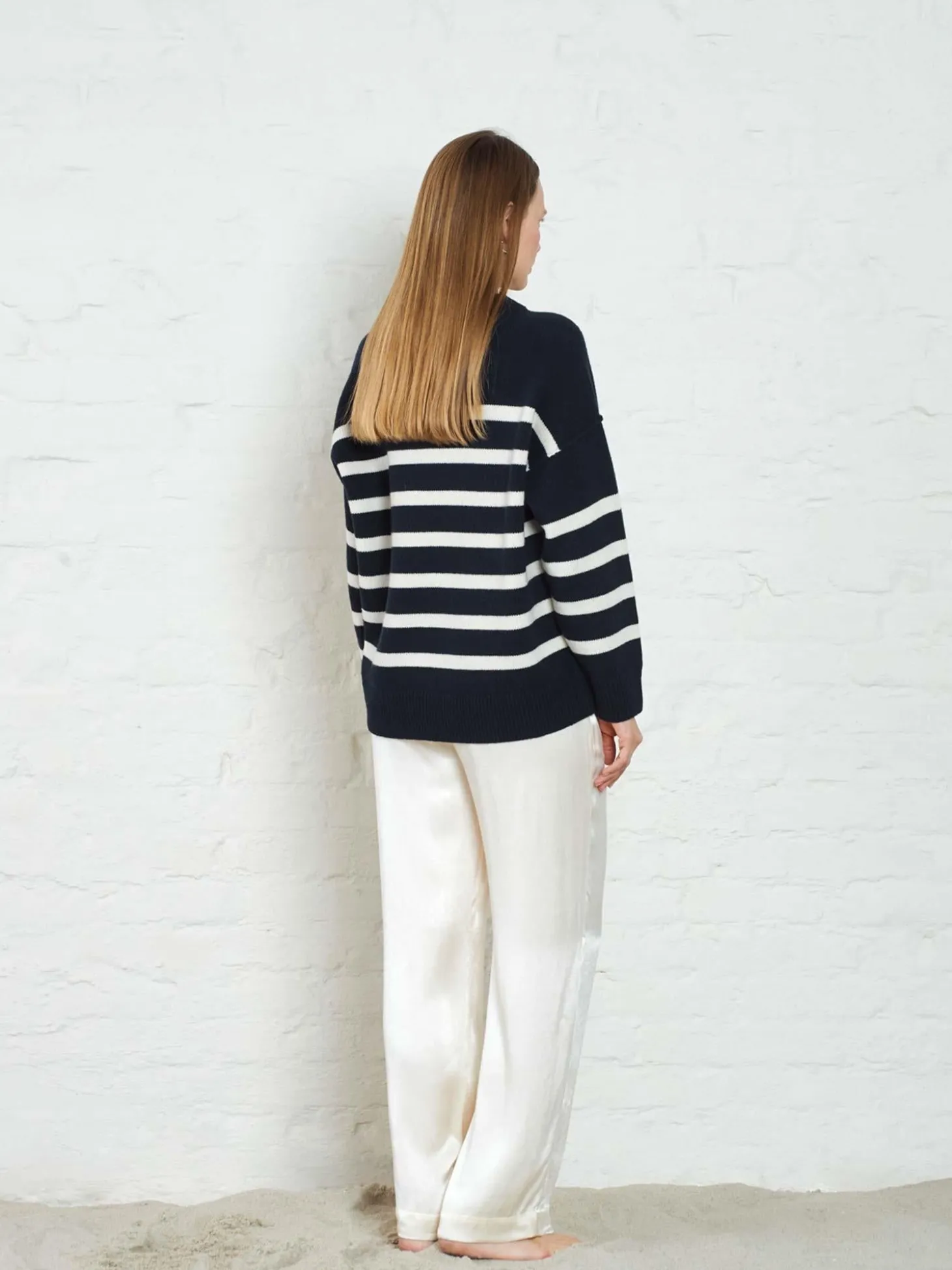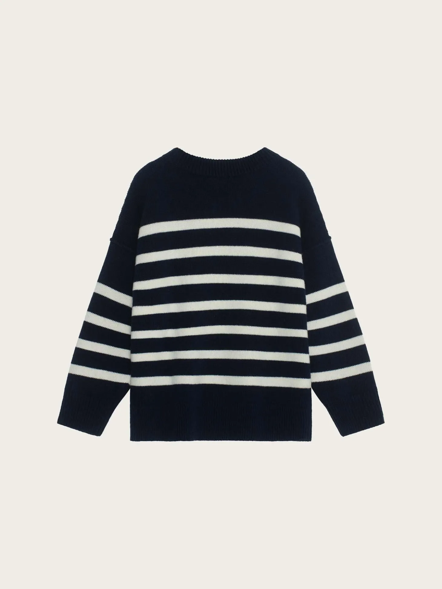 Chunky stripete strikkegenser i en kompakt og myk ullblanding. Modellen er designet med rund hals, vrangsømmer, nedfalne skuldre. Ribbestrikket hem, mansjetter og hals. Rett og romslig i fasongen med noe smalere ermer.