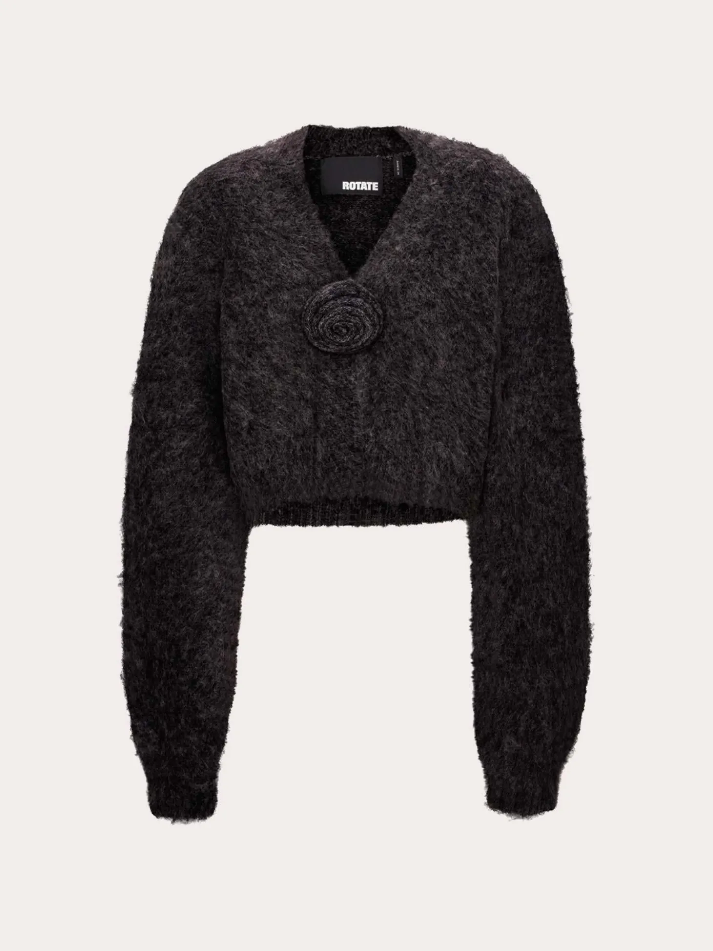En fin strikket cardigan, med dekorativ sløyfe som lukking og lange ermer.