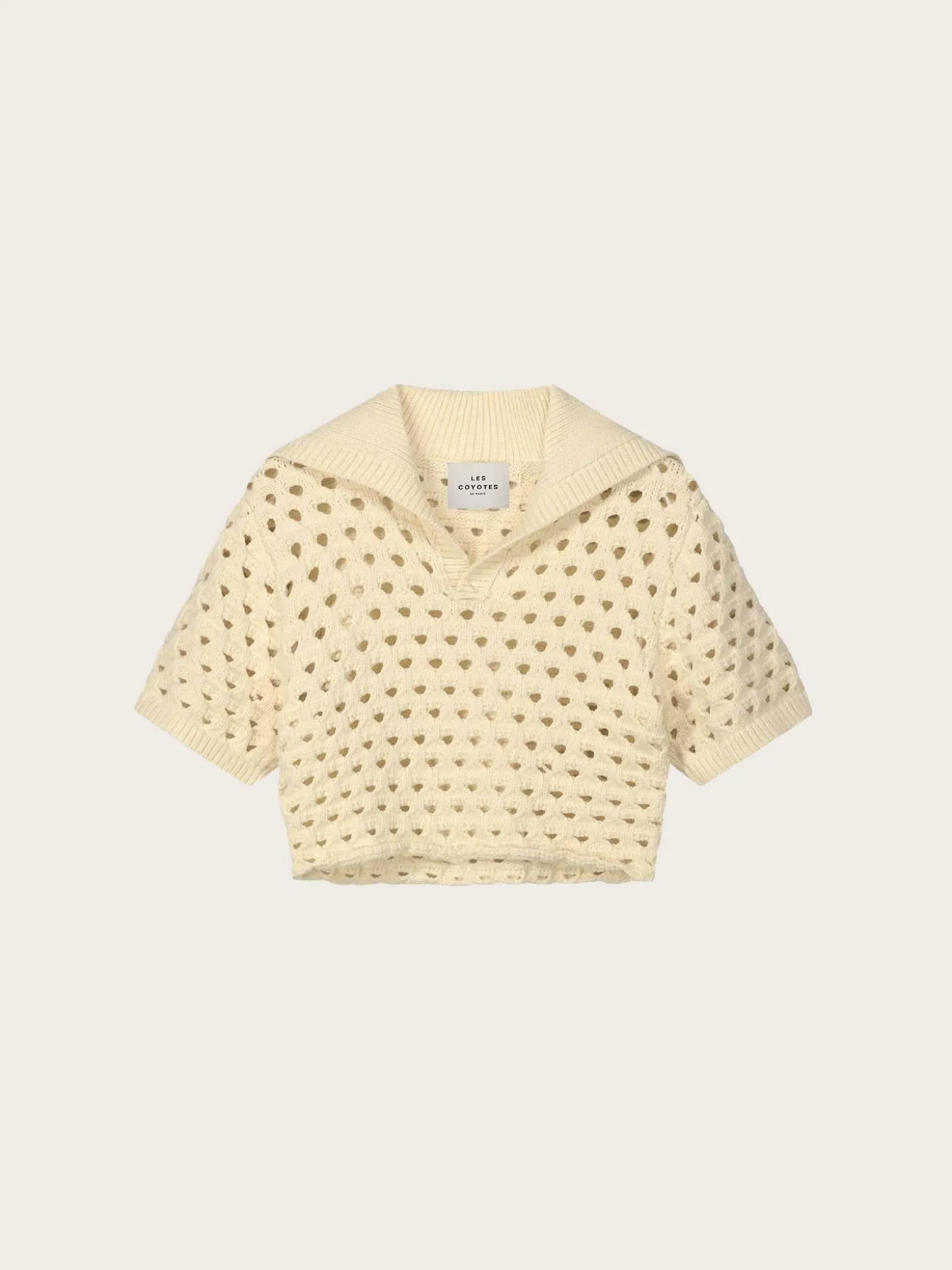 En lysegul, kortermet polo med stor krage med åpent strikkemønster. Poloen er strikket av et moderne garn av bomullsblanding.