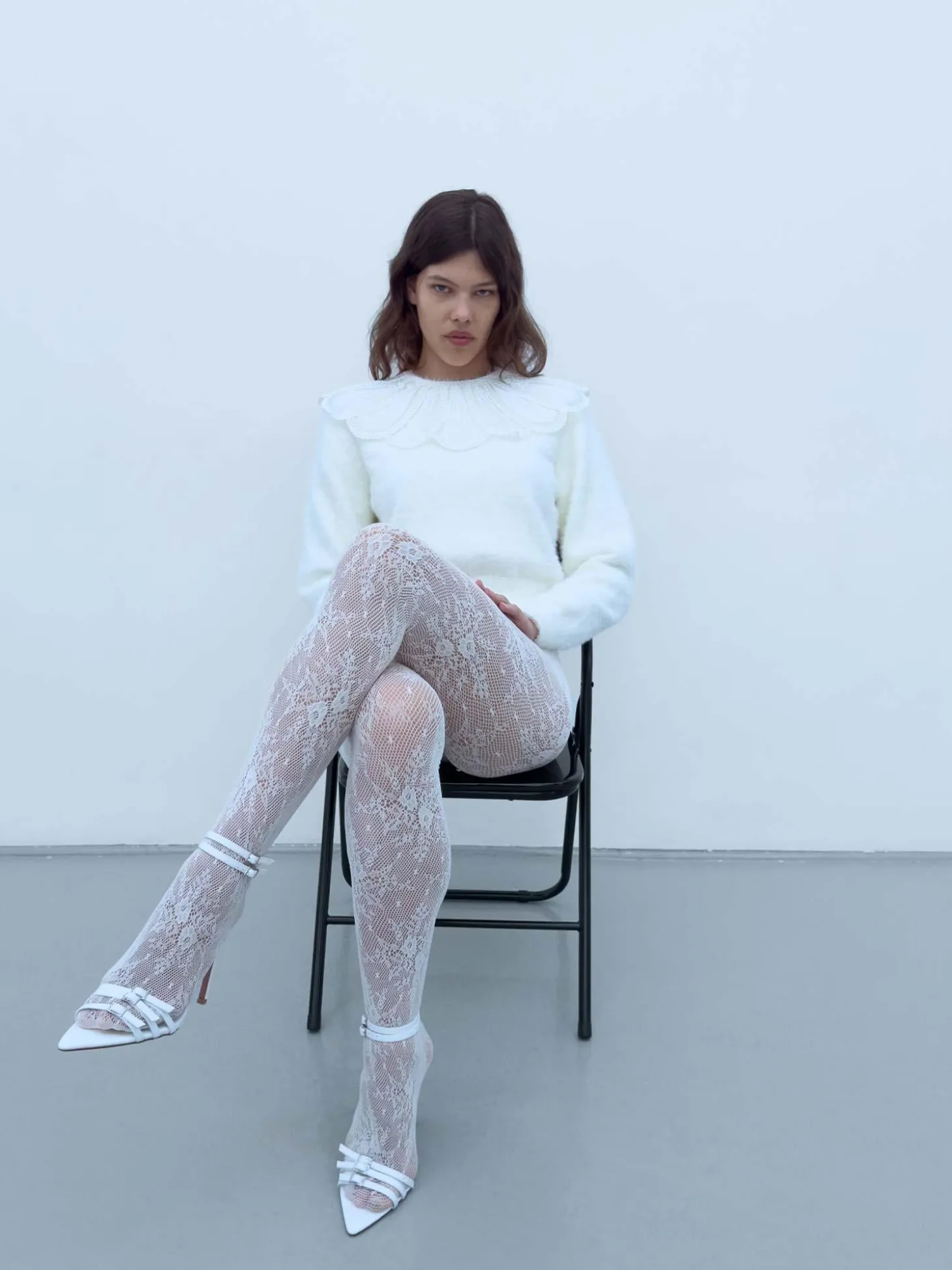En feminin statement strikkegenser med nydelig krage i blonder. Lace Collar Knit er perfekt for å style med jeans eller skinnbukser for å løfte hverdagsantrekket.
