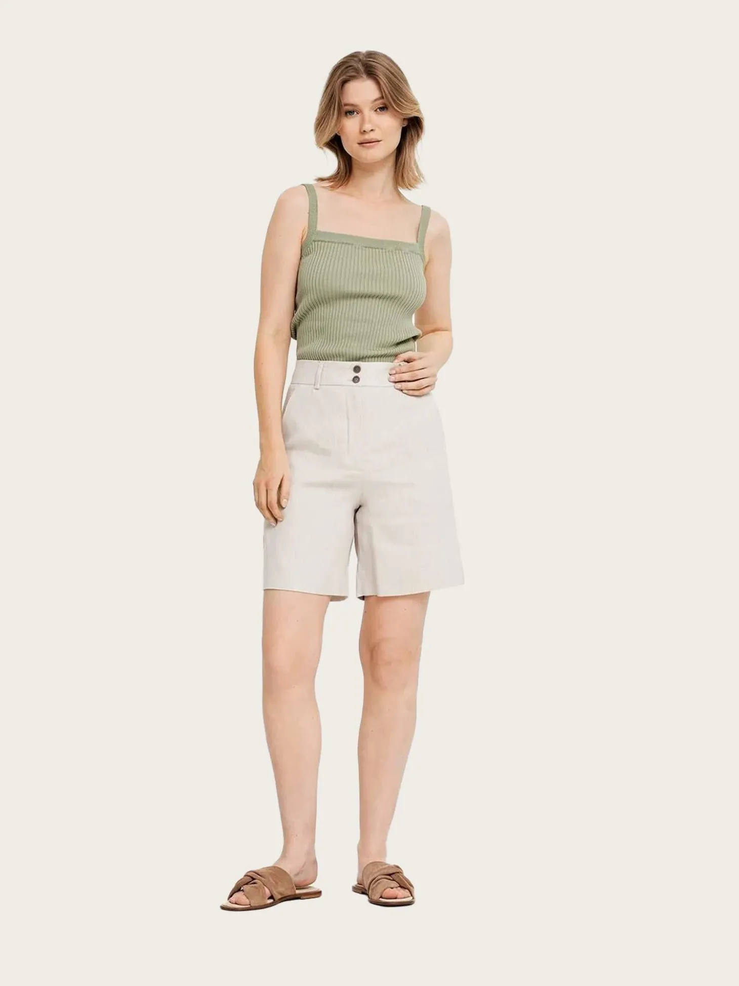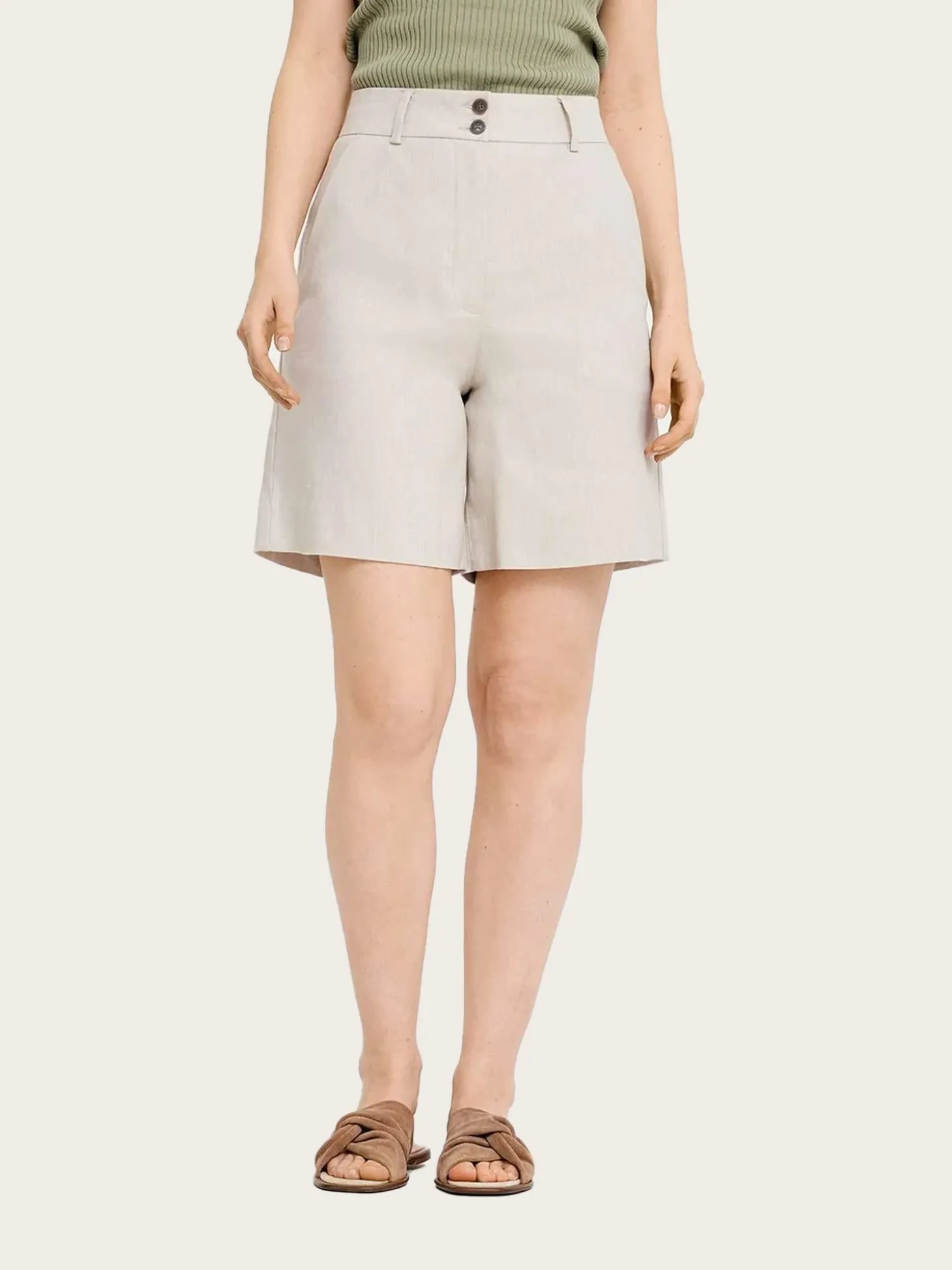 En beige linshorts med en ren silhuett. Shortsen har en høy midje, rette, brede ben og lommer med knapper, for en skreddersydd finish.