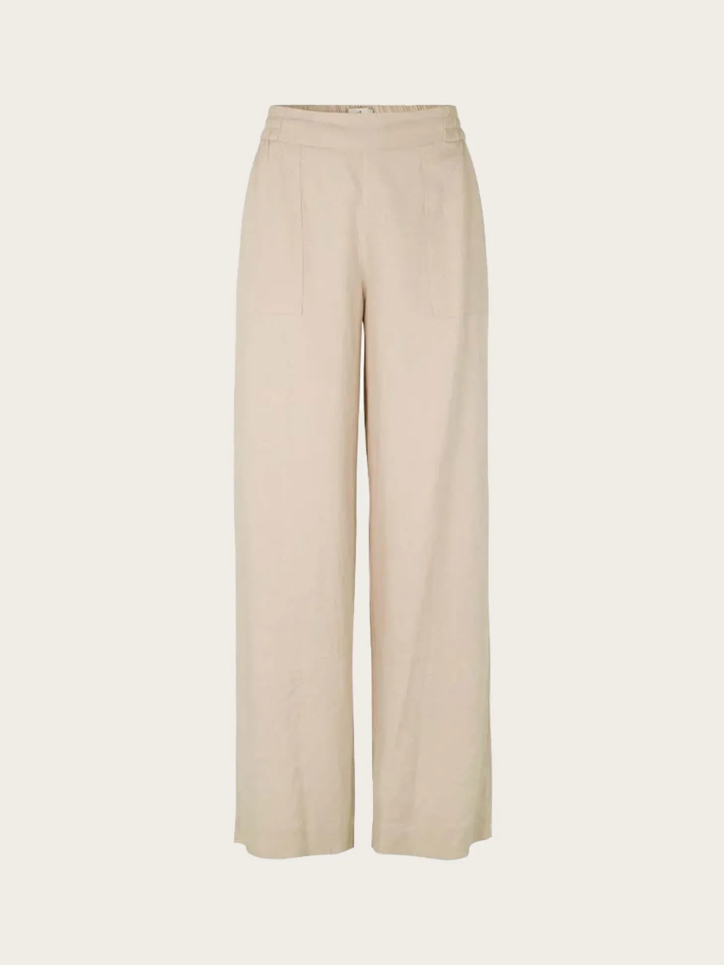 En lett og deilig linbukse i en nydelig beige farge. Buksen er mid-waist, har strikk i livet og vide, lange ben.