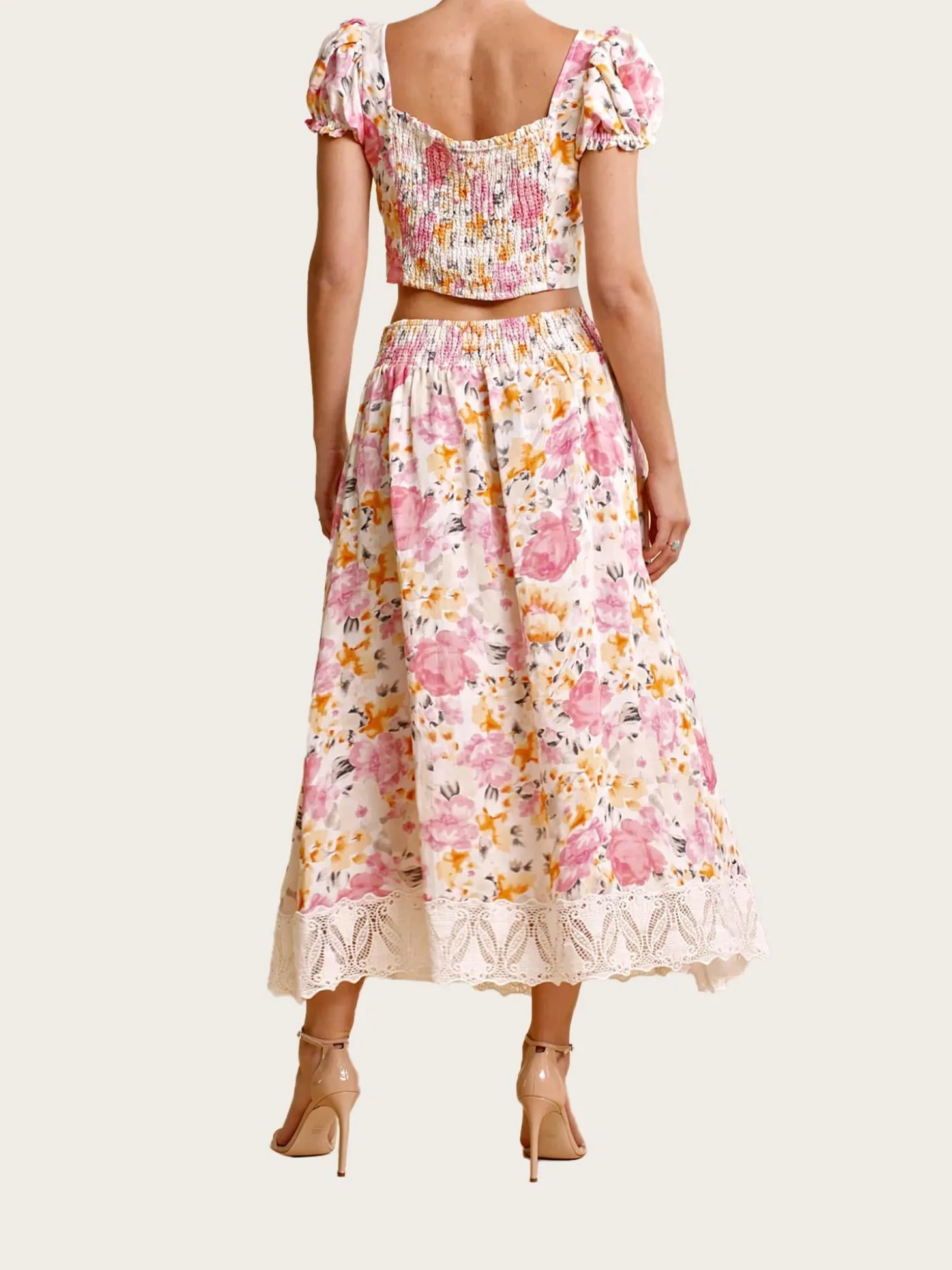 En cropped lintopp i et vakkert rosa og oransje blomstrete mønster. Toppen har korte, puffede ermer og knapper på front.