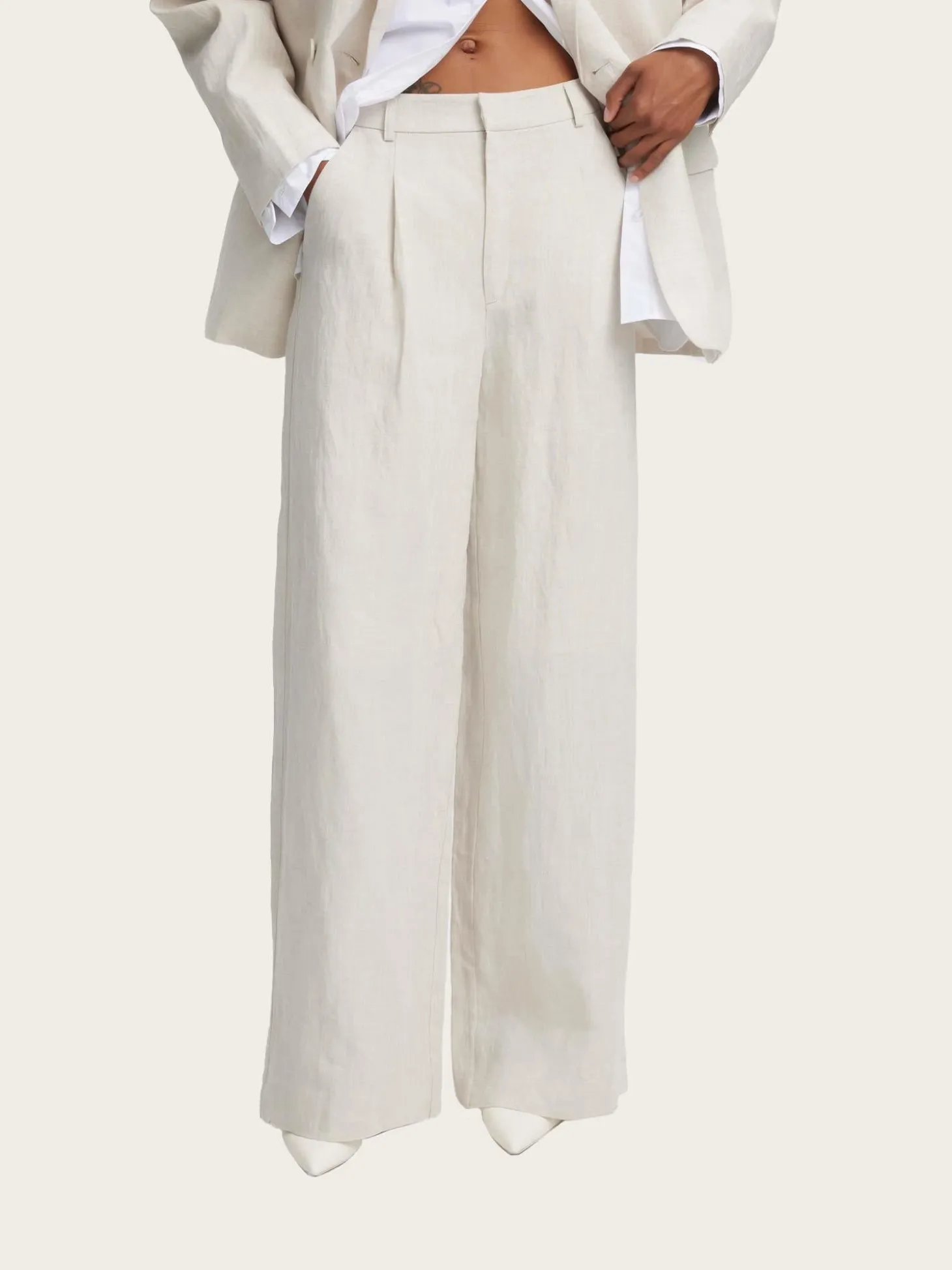 En lys, beige bukse av lin i dressbukse-fasong. Buksen er highwaisted, normal i passformen og har beltehemper.