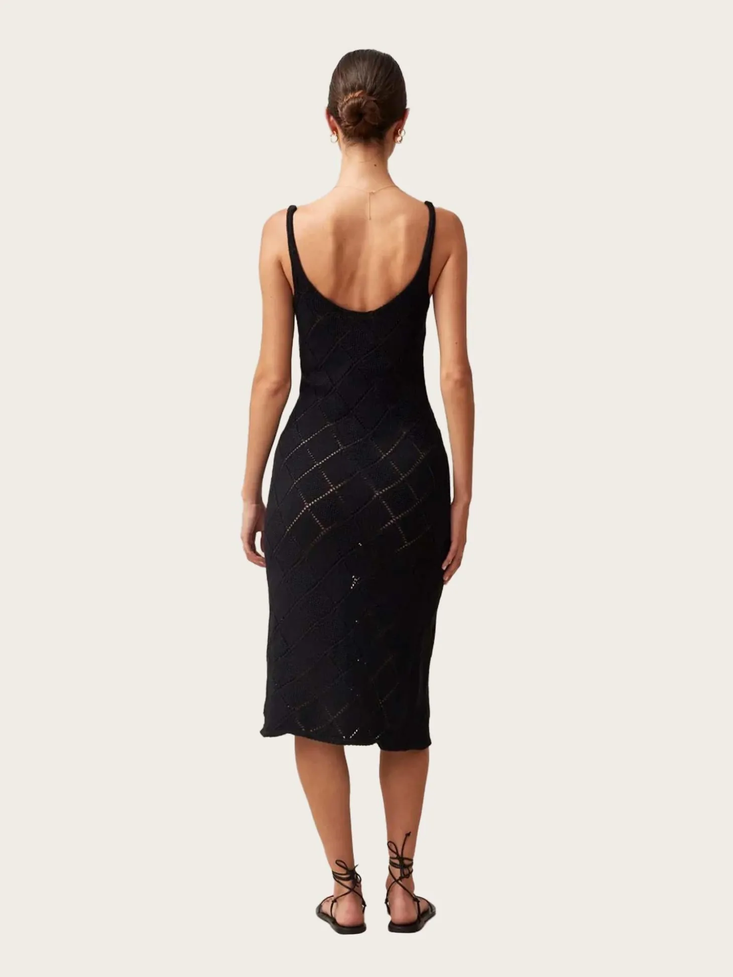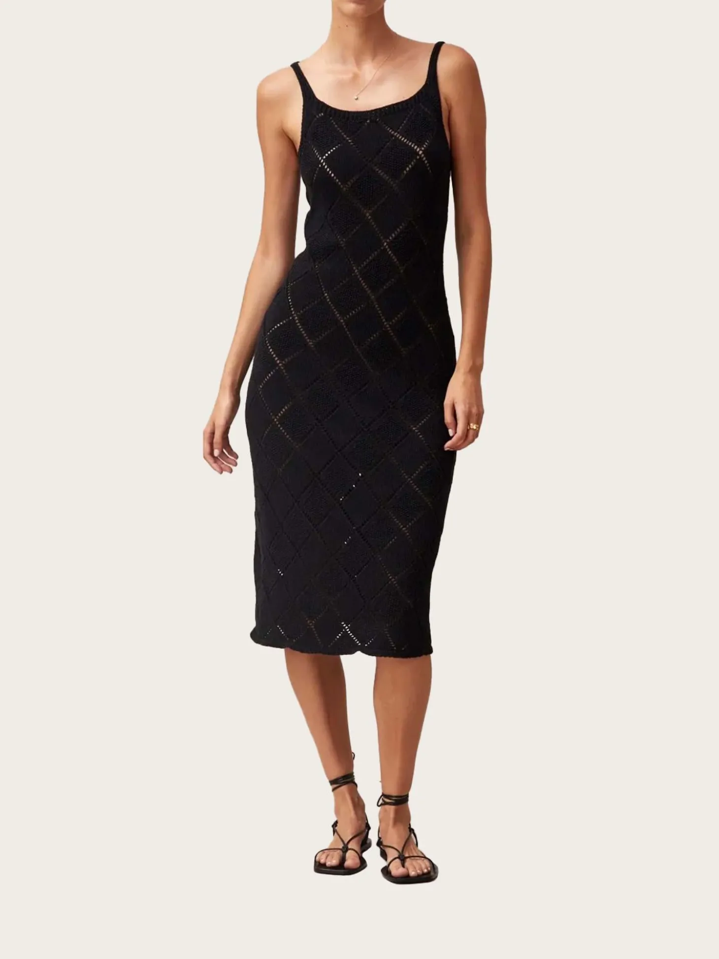 En lekker svart kjole med et heklet design. Kjolen har tynne stropper, klassisk rund utringning, med en dyp rygg.