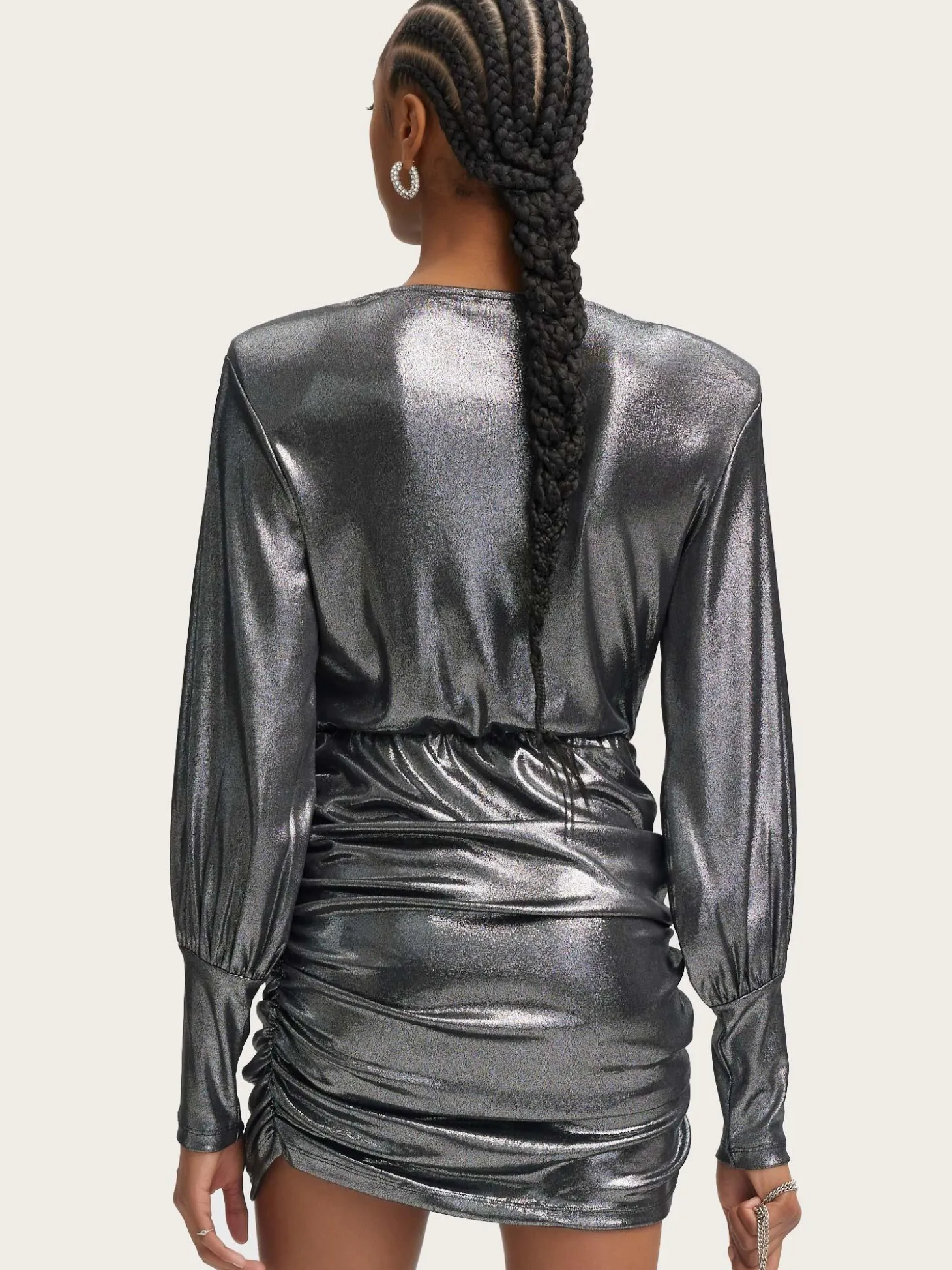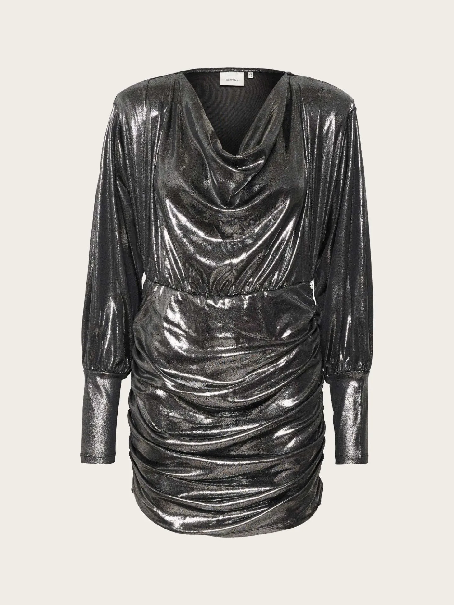 En nydelig kjole i metallisk sølv. Den har markerte skuldre, lange ermer og drapering i front som gir en fin utringning. Kjolen har markert midje, og ettersittende skjørt.