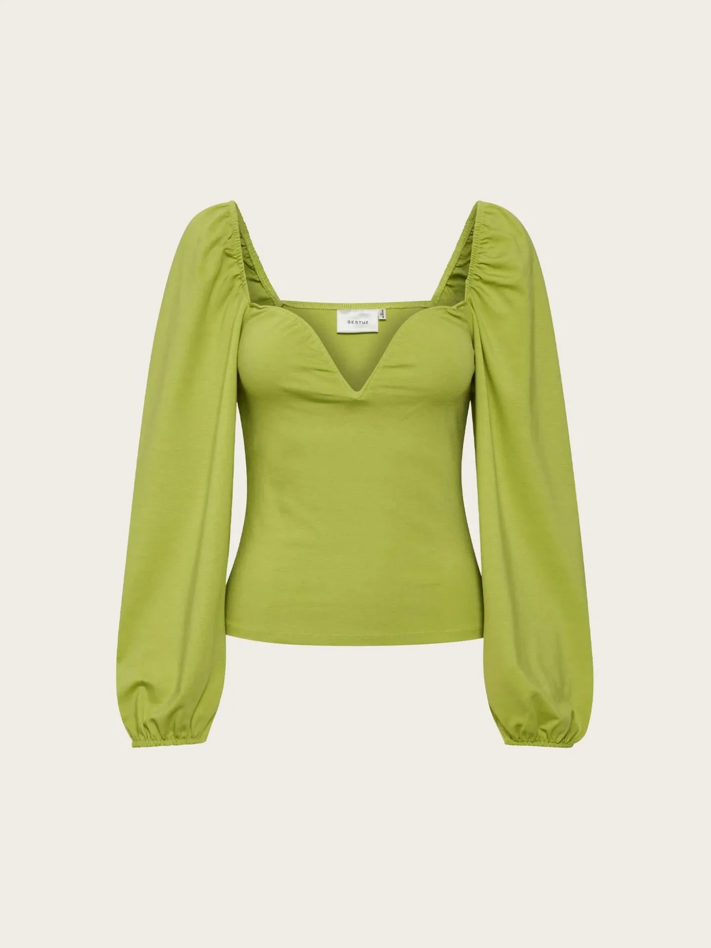 Mist Offshoulder fra Gestuz. En kul topp, med lange voluminøse ermer. Den har en fin hjerte-utringning, smal passform og ermer som kan henge ned fra skulderen om ønskelig.