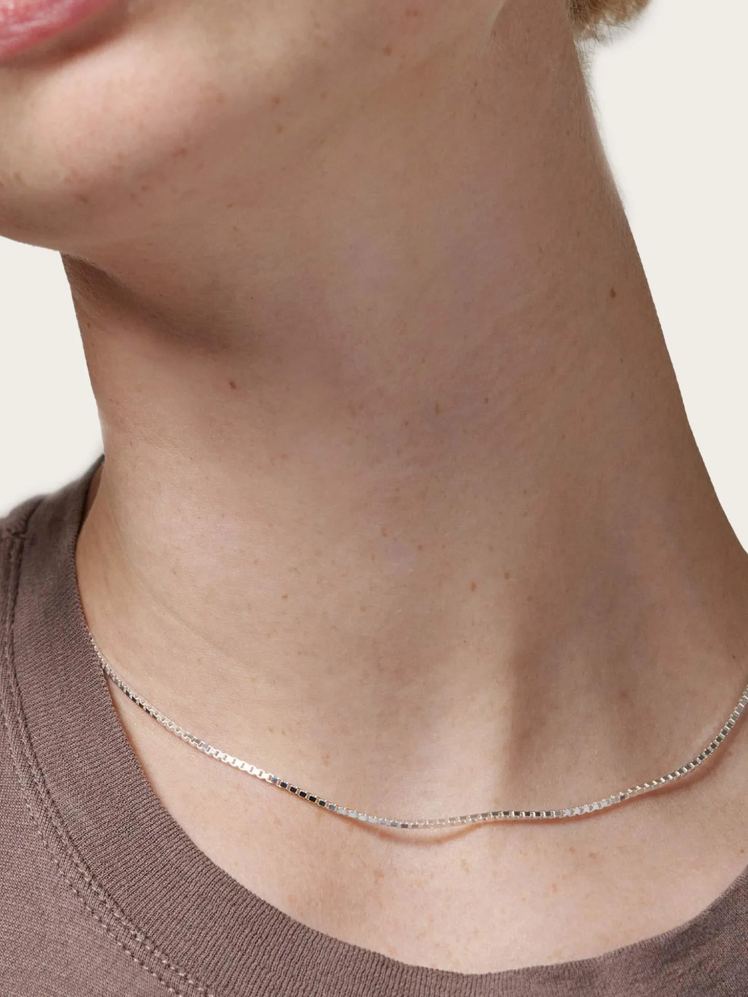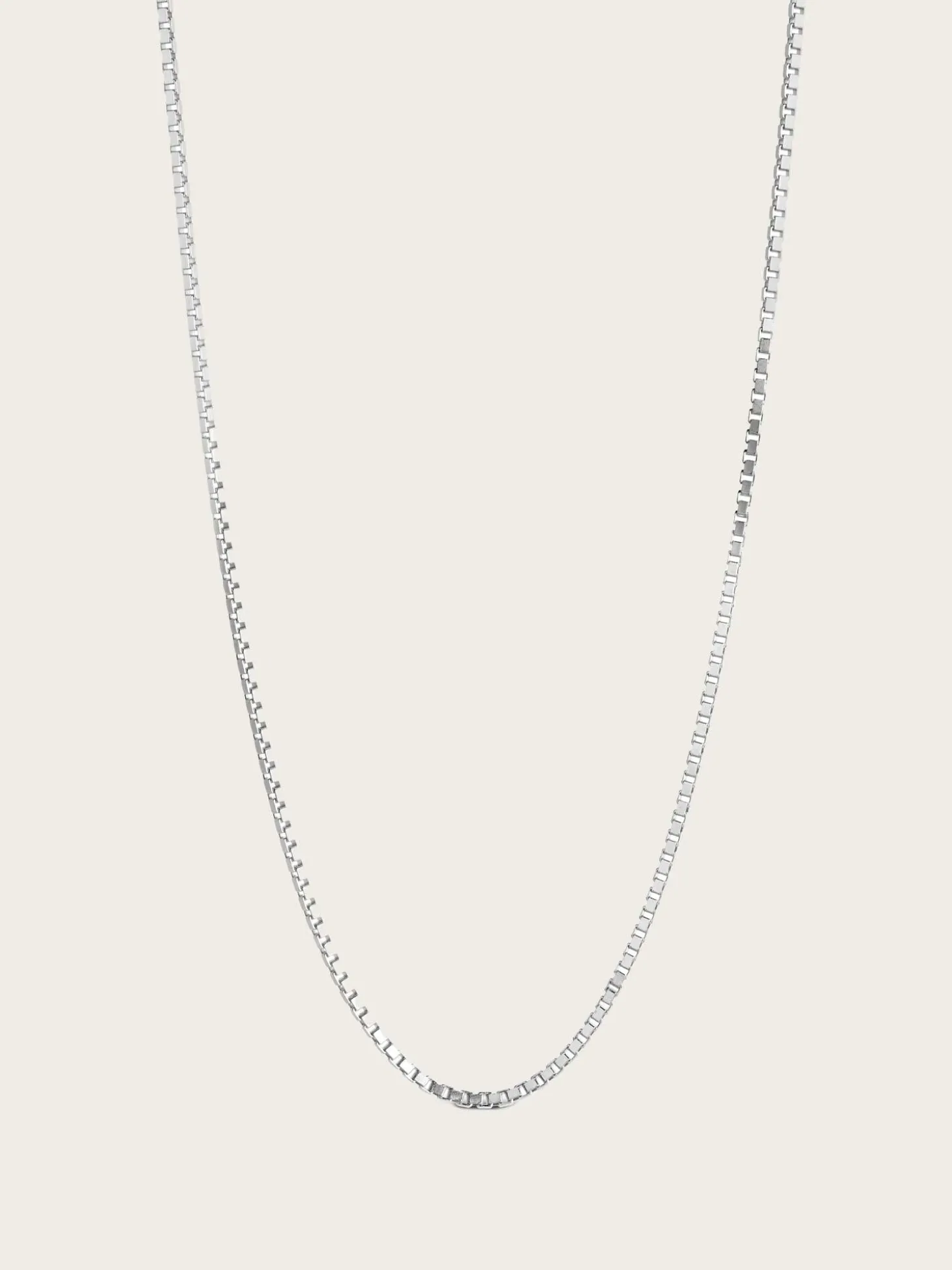 En firkantet kjedetype med en blank finish. Smykket har en enkel og justerbar lenge, noe som gjør det enkelt å kombinere med flere smykker.