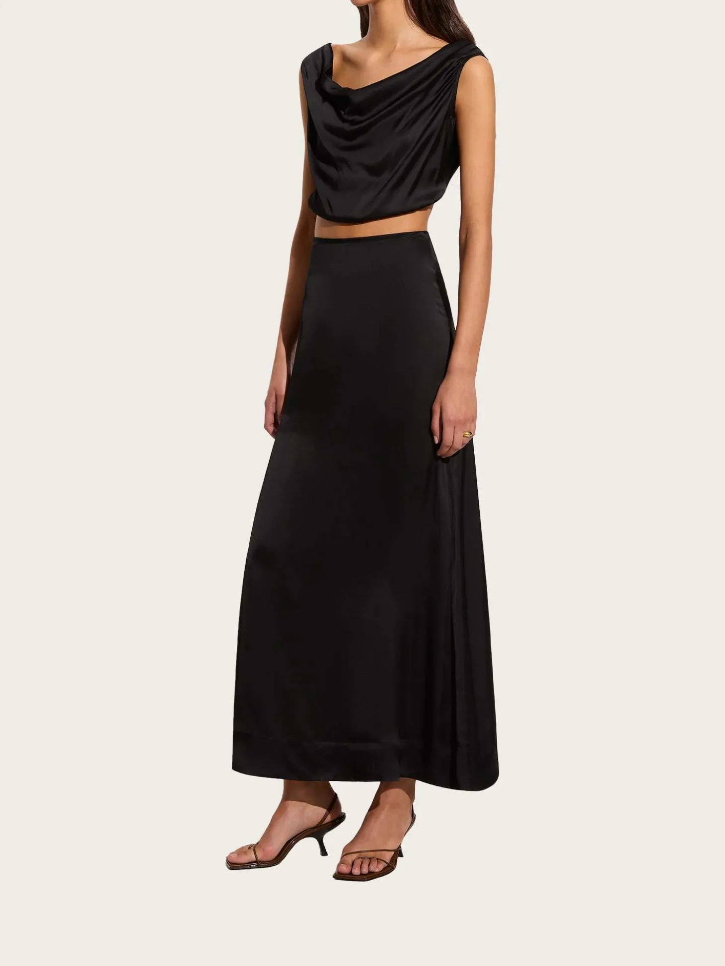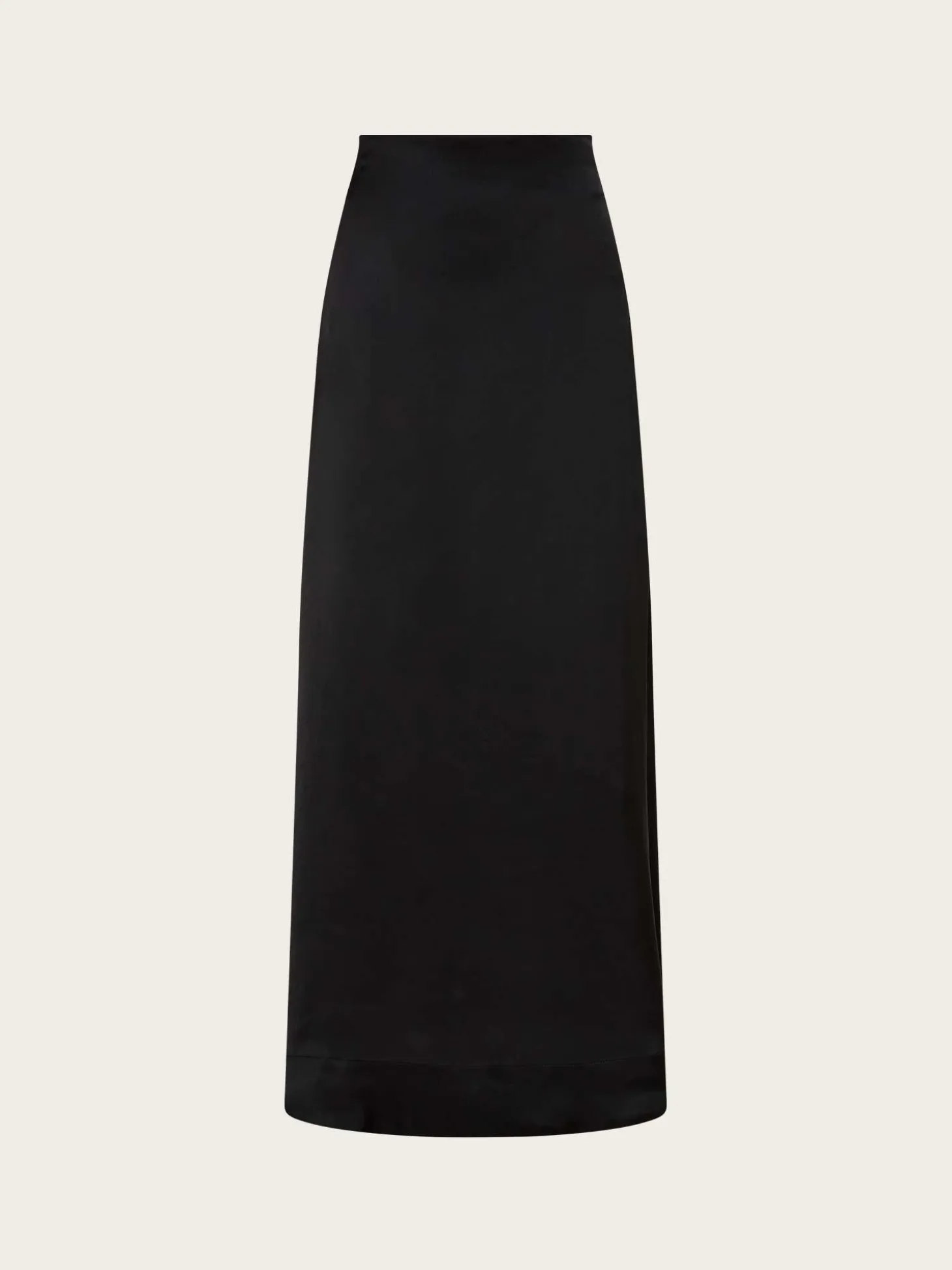 Et herlig, svart satengskjørt i maxilengde, som lukkes med glidelås bak.