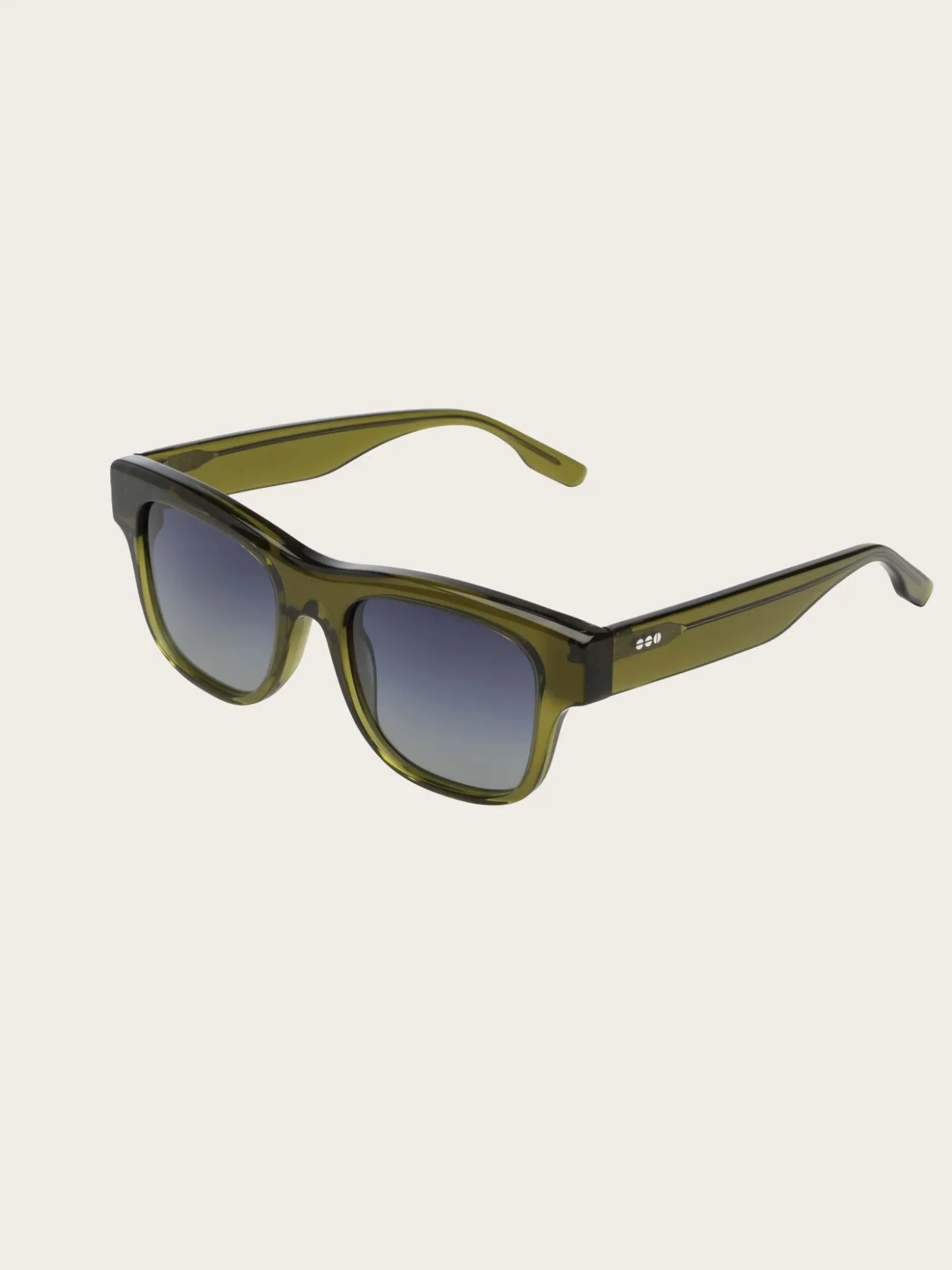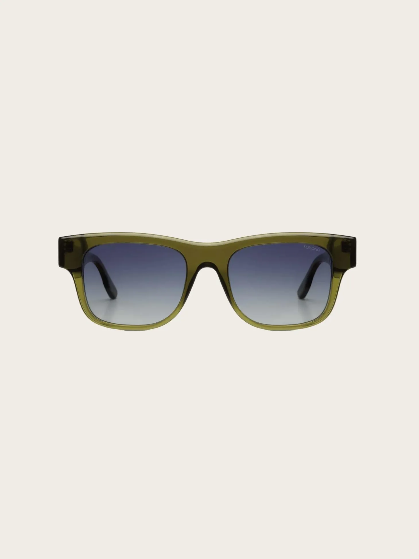 En grønn, statement solbrille med rektangulær form. Brillene har 100% UV400 beskyttelse og ripebestandig glass. Pusseklut og etui medfølger.