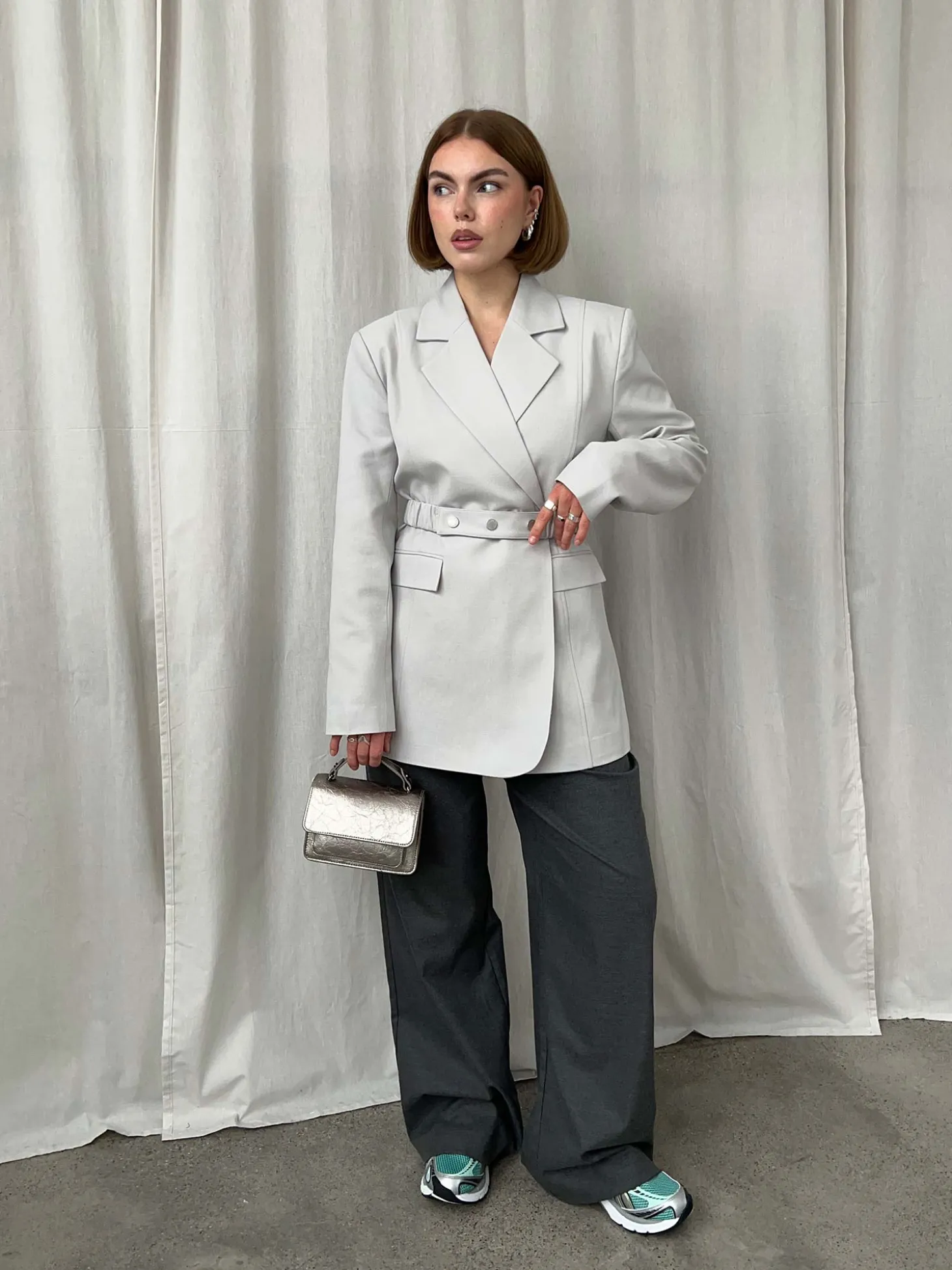 En klassisk og fin dressbukse, i en nydelig gråfarge. Den har lommer i siden, medium høyde på livet og legg i front som gir gode vidde i bena.