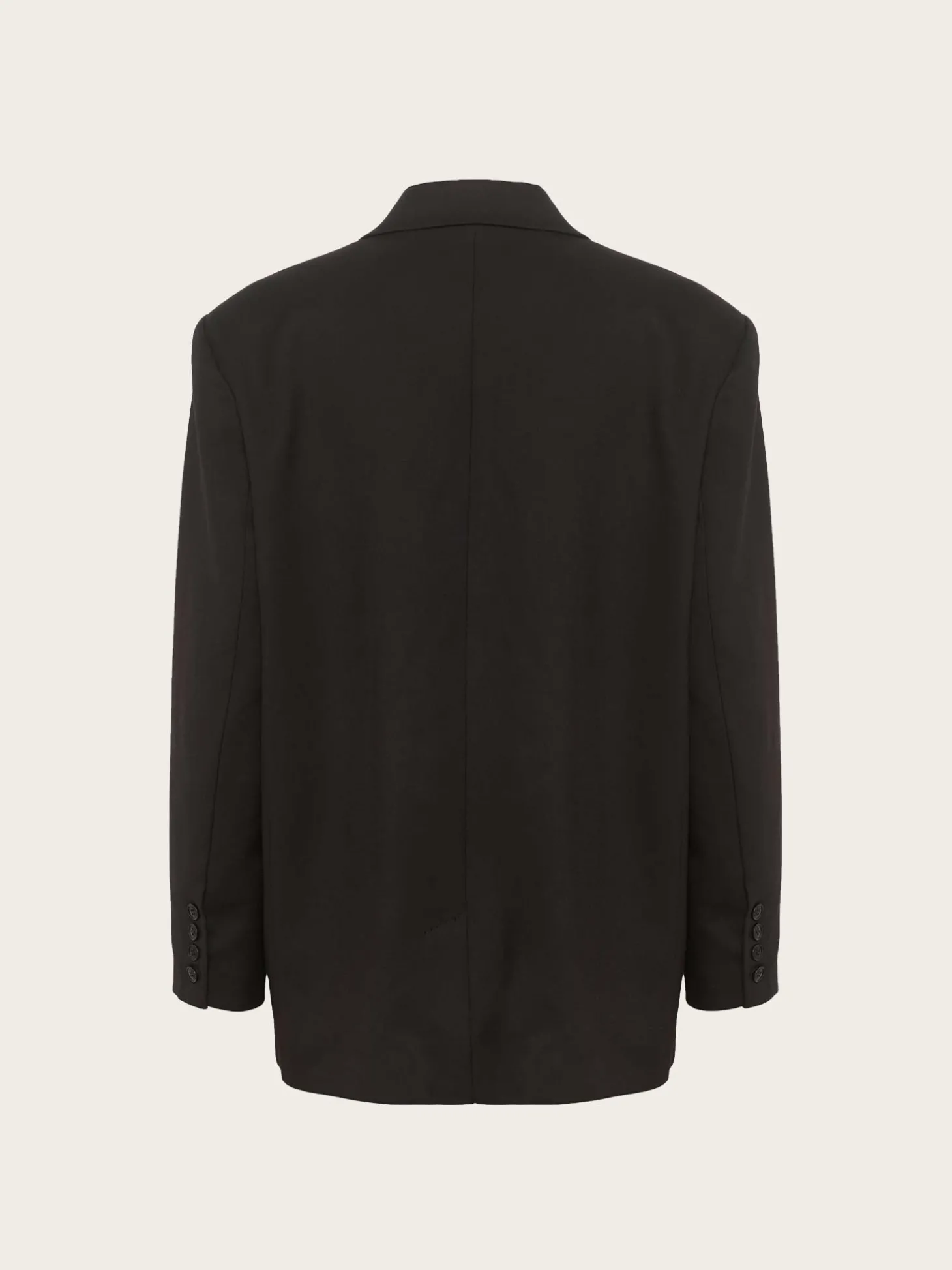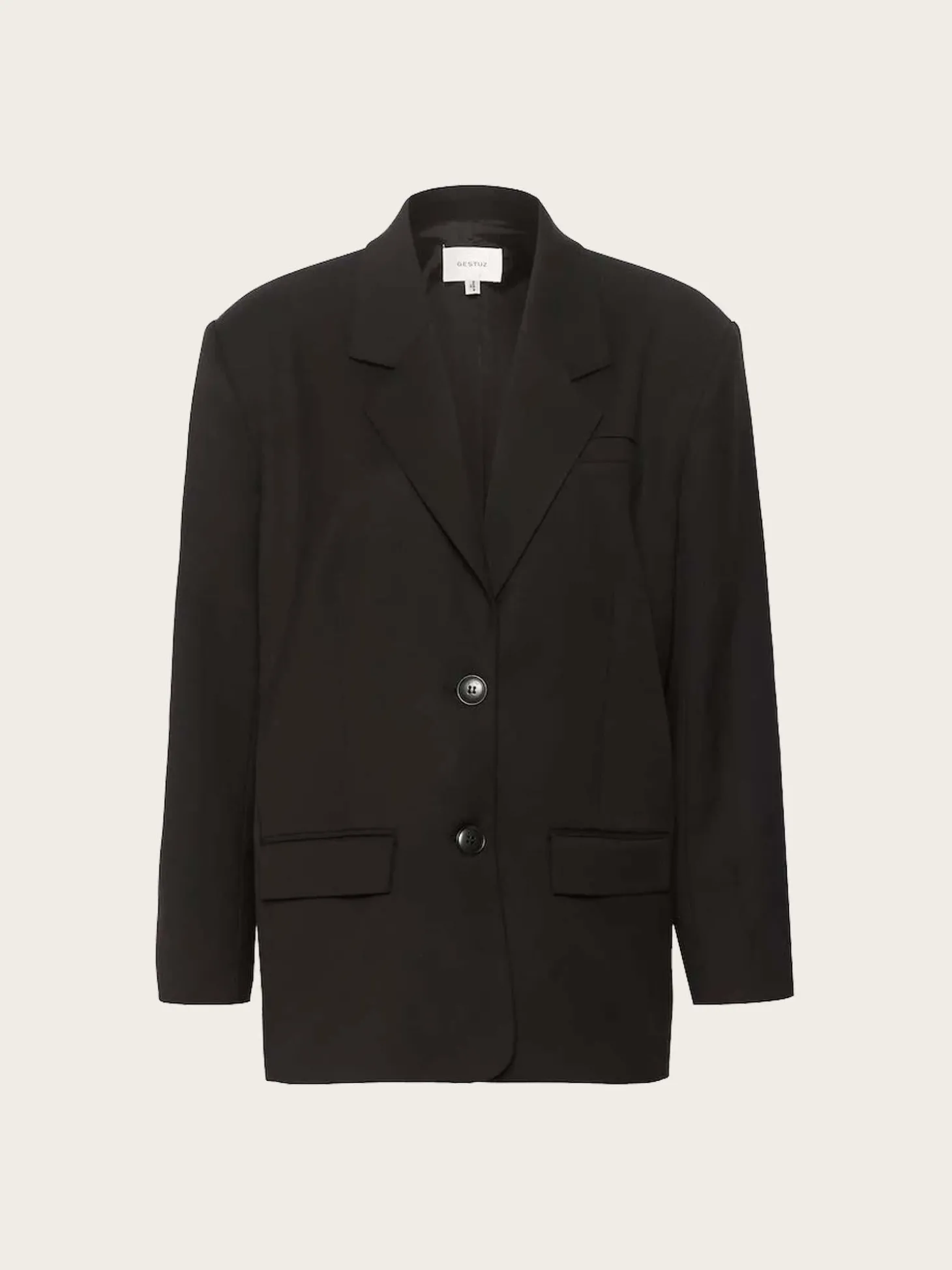 En klassisk blazer med en oversized look i sort. Den har markerte skuldre, knapper i front og flapplommer.
