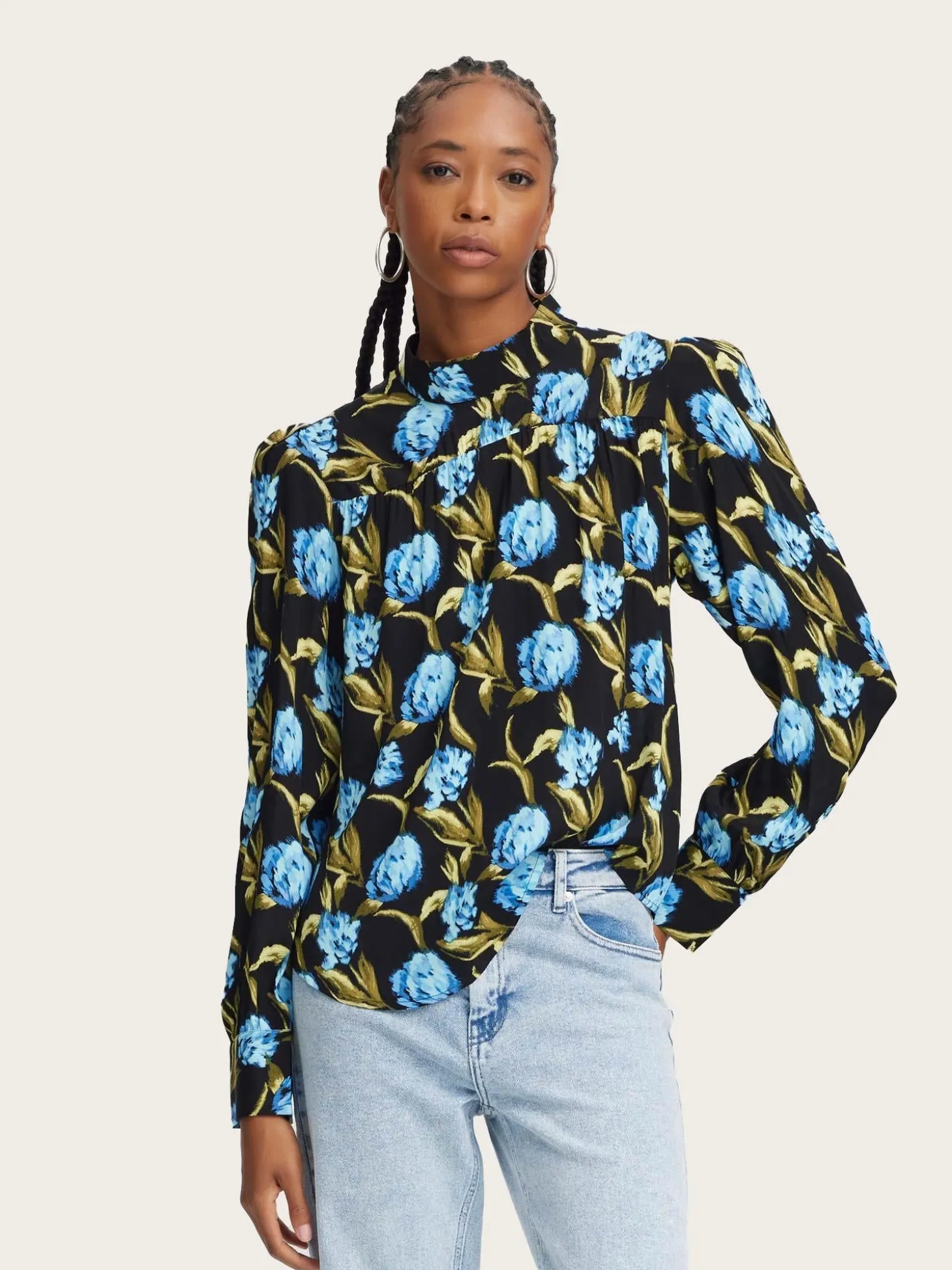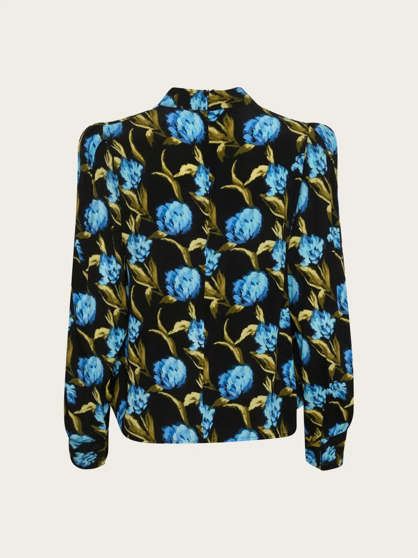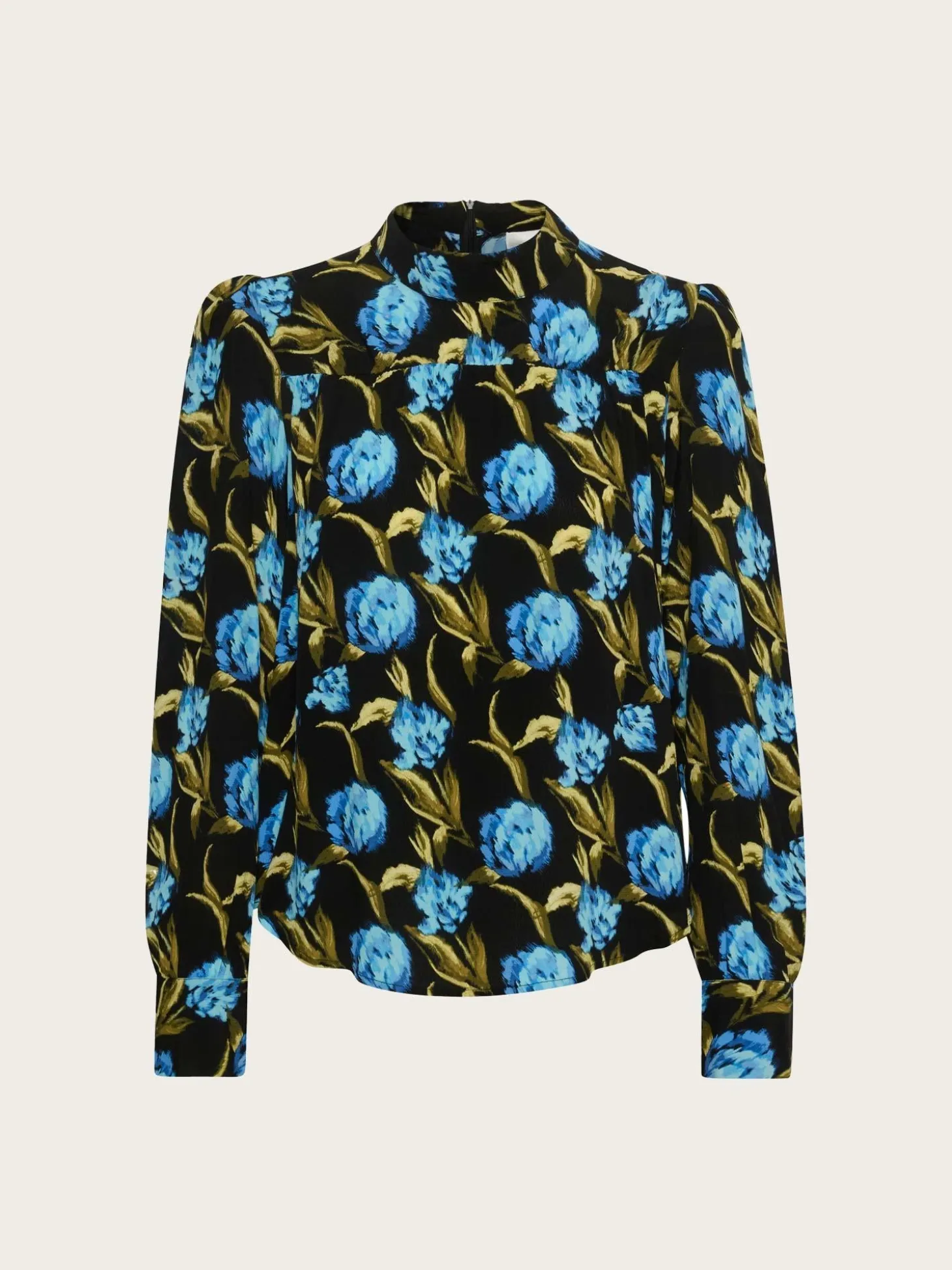 En flatterende bluse med et svart, blått og grønt blomstertrykk. Blusen er normal i passformen, med en lengde som strekker seg til hoftene.