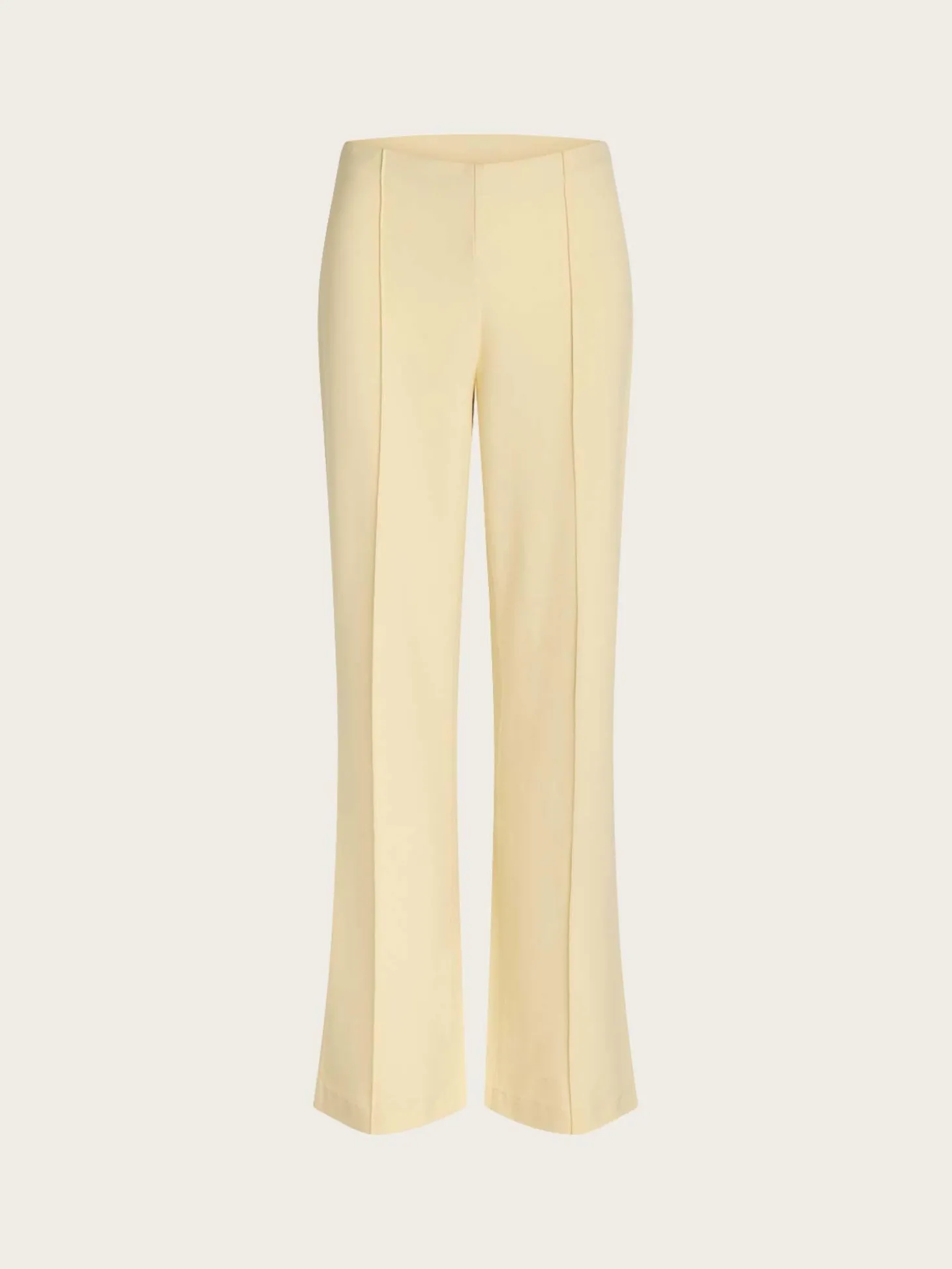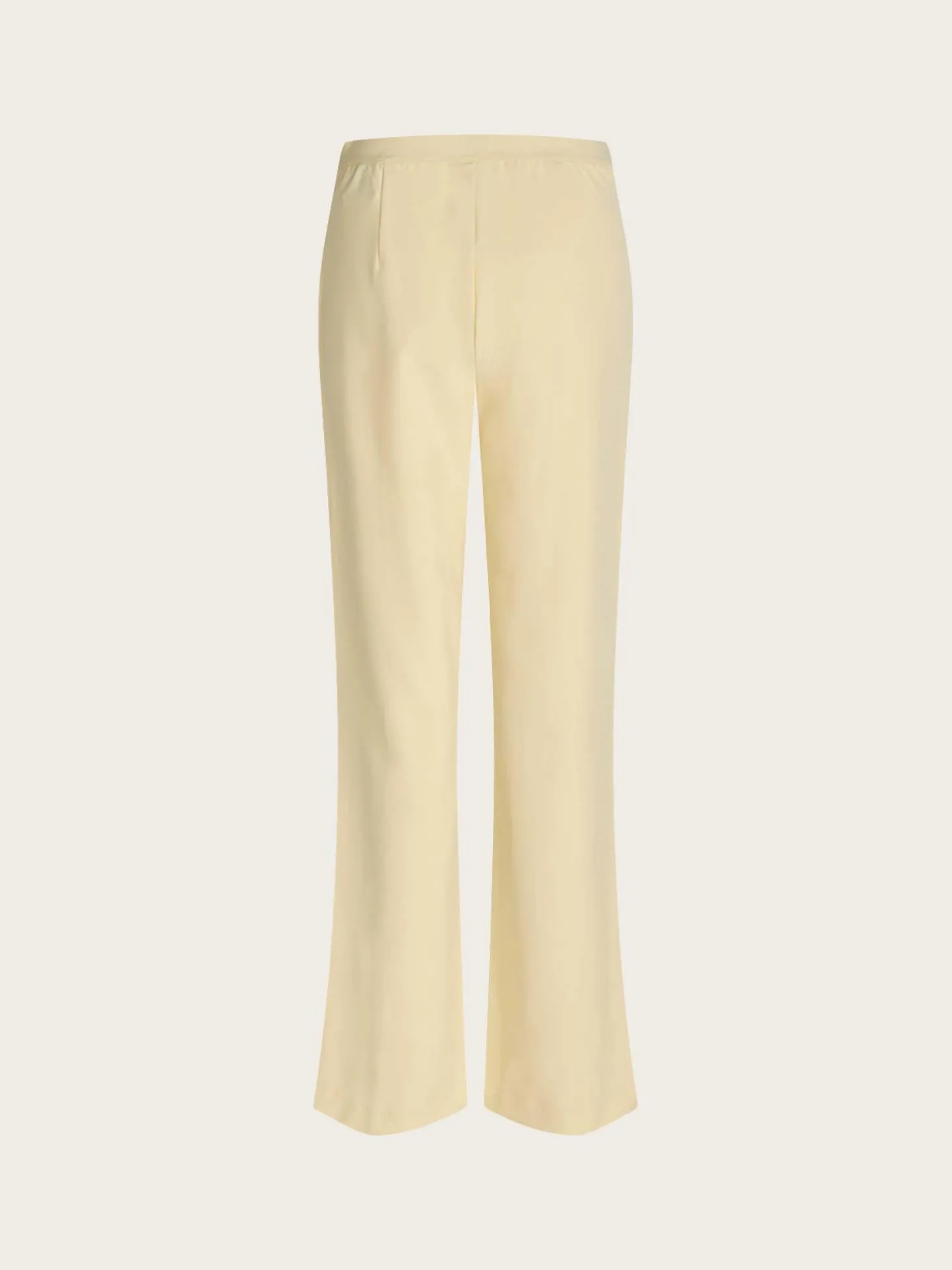 Recycled Sportina Pirla Pants fra Mads Nørgaard. En myk og elastisk bukse, i en herlig kremfarge. Den er medium høy på livet, ettersittende, og med en liten sleng nederst. Buksen har pressfolder foran og glidelås i siden.
